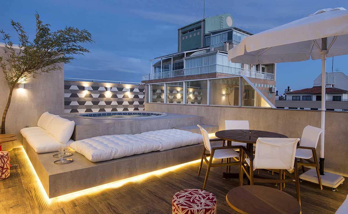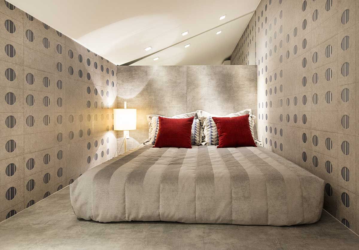 O ar despojado é enfatizado pelo armário com portas de espelho, o papel de parede estampado, os tecidos geométricos e a estante de hexágonos . Uma claraboia faz o papel de janela para o espaço e o sofá se transforma em colchão para visitas.