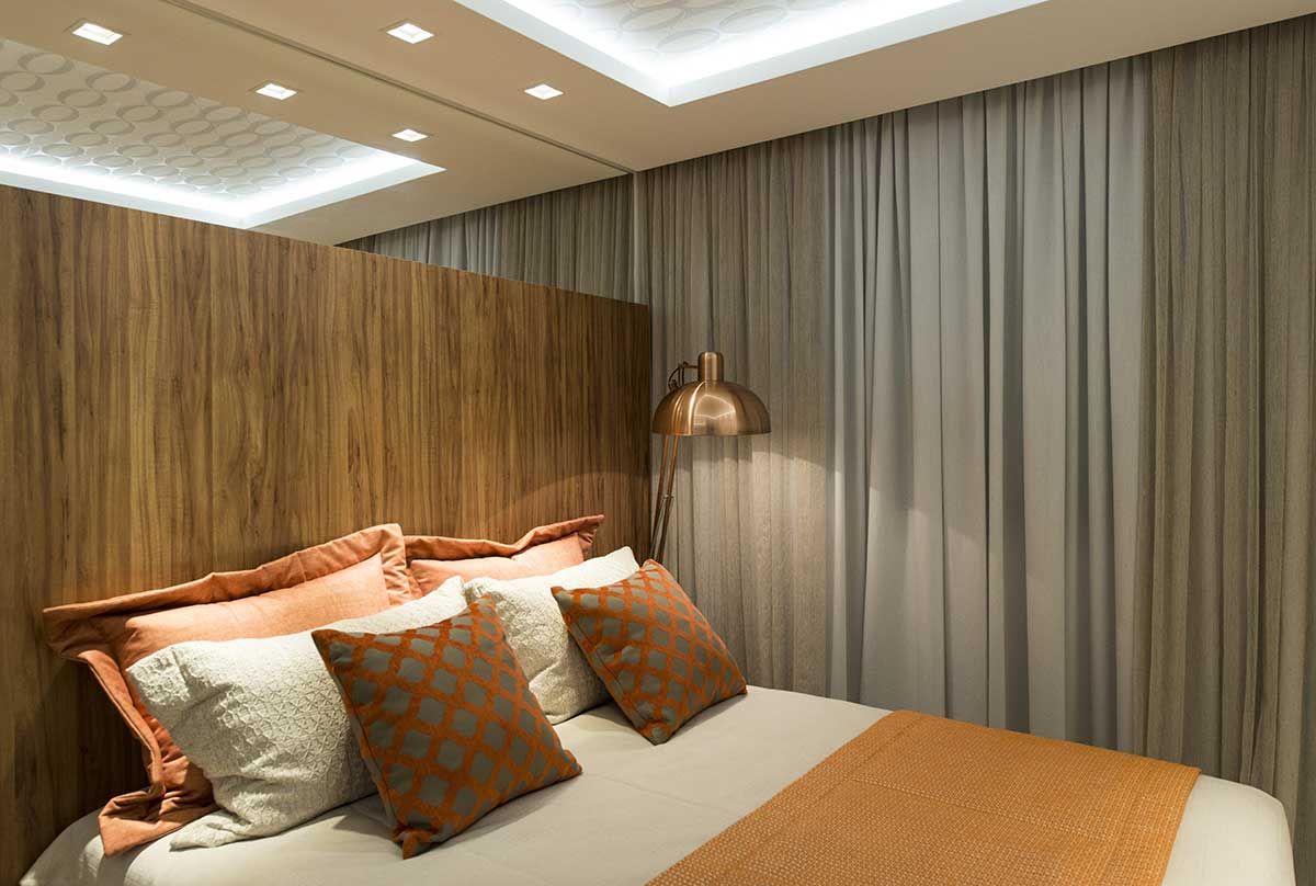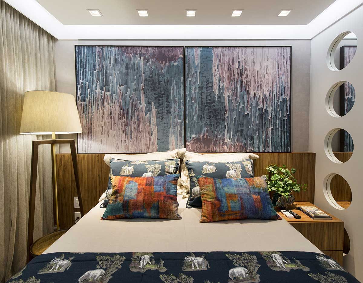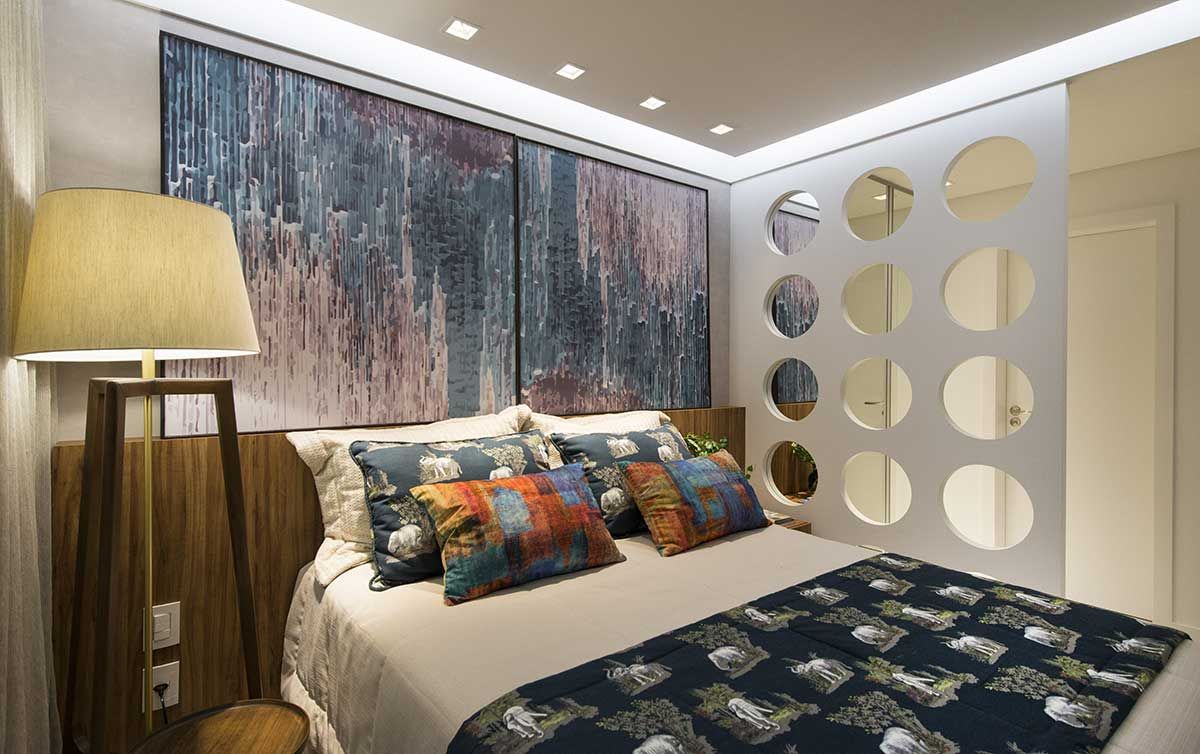 Na suíte, um painel de laca foi feito para criar um closet com acesso ao banheiro. A outra parte recebeu a cama, com um painel baixo de madeira fazendo as vezes de cabeceira. Foram aplicados tecidos e papeis de parede em tons de azul, laranja e lilás. Dividindo o ambiente há um painel personalizado com geometria circular, marca registrada do escritório.