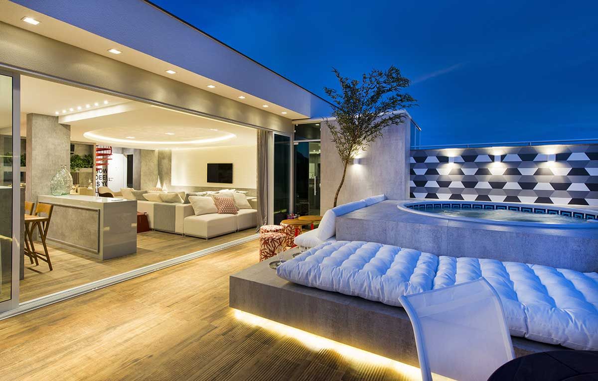 Já o segundo possuía dois dormitórios e um banheiro. Como solução para ampliação do espaço, Anna e Anderson derrubaram um dos quartos do primeiro piso. Em seguida cozinha, sala e o belo terraço com piscina e vista para a praia foram integrados, com os revestimentos fazendo a principal ligação entre eles.