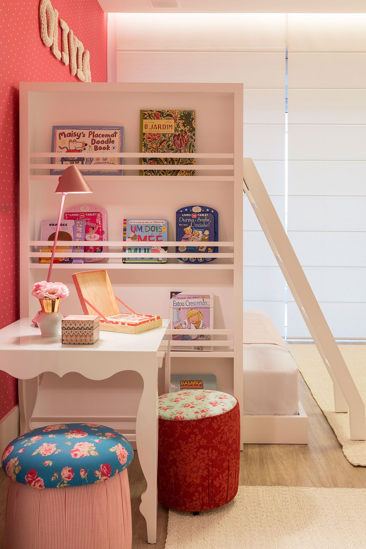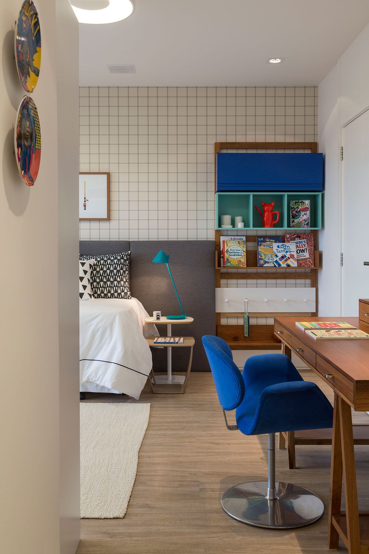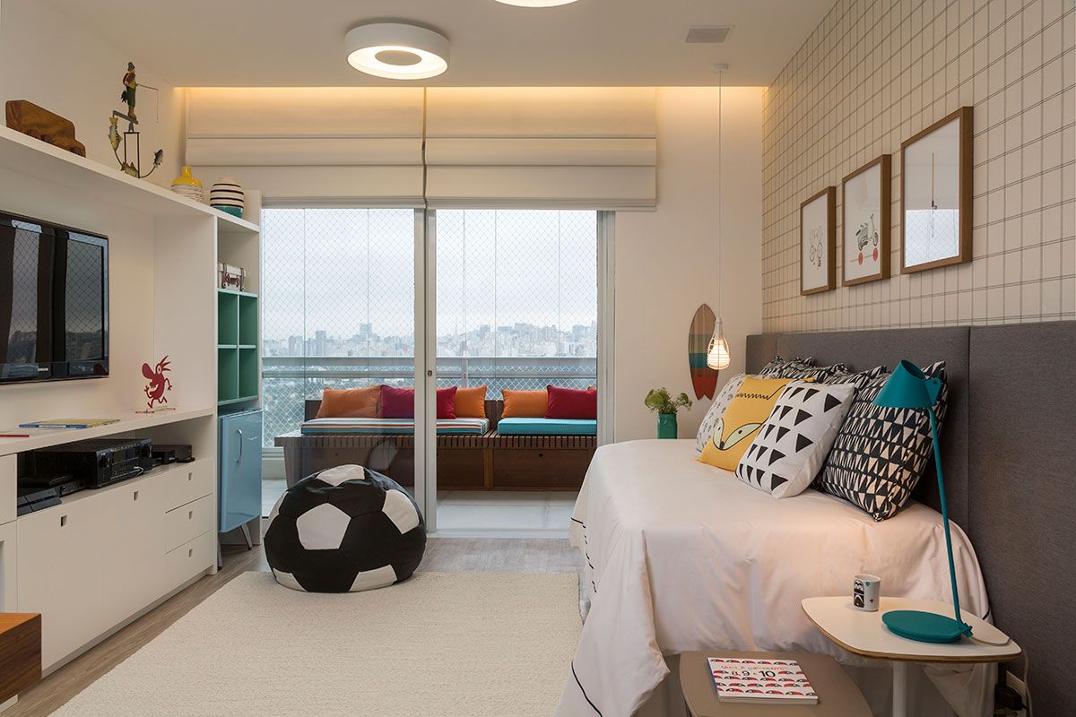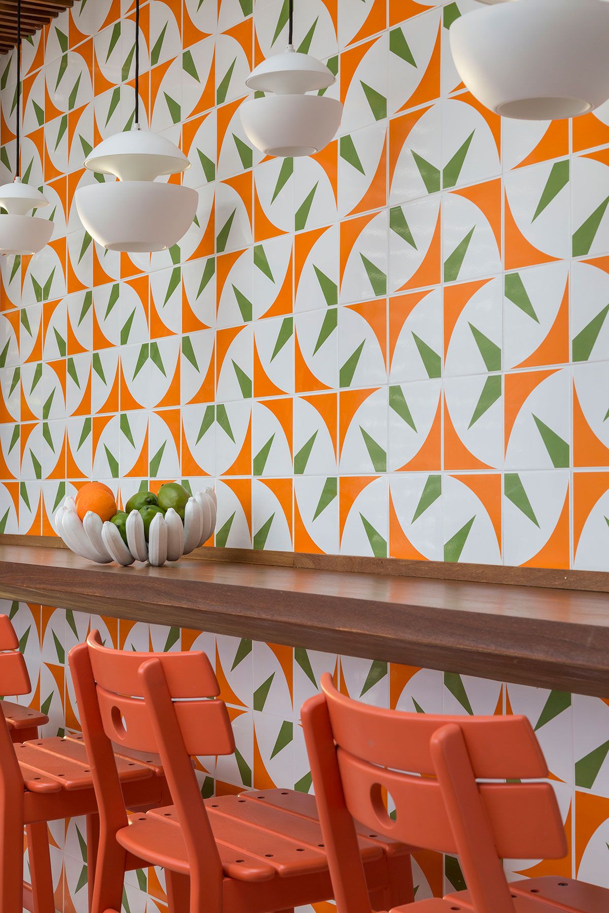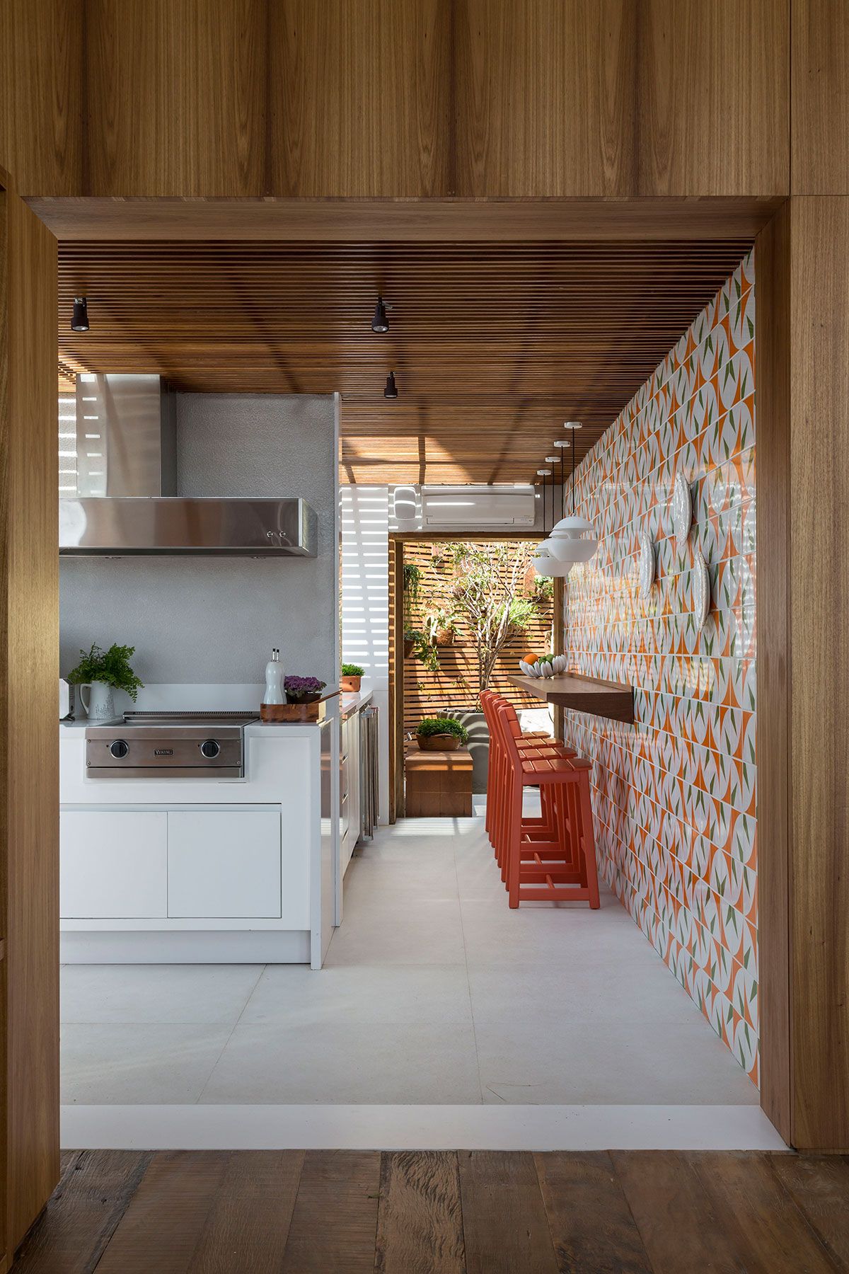 Um dos destaques do projeto é a cozinha gourmet na varanda, com parede de azulejos decorados artesanais e um toque divertido que remete às origens modernistas da azulejaria brasileira. Para completar a cena despojada, banquetas altas em tom laranja e tampo de madeira padrão demolição acomodam com conforto para os encontros nos finais de semana.