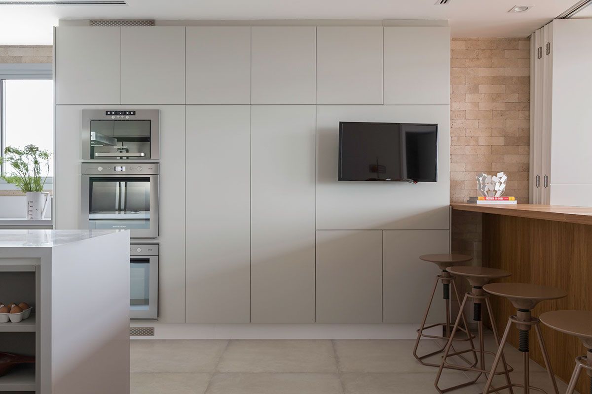 Depois dessa mudança, foi implantada uma ampla e útil despensa na parte posterior do ambiente, a qual pode ser isolada através de portas deslizantes de vidro.