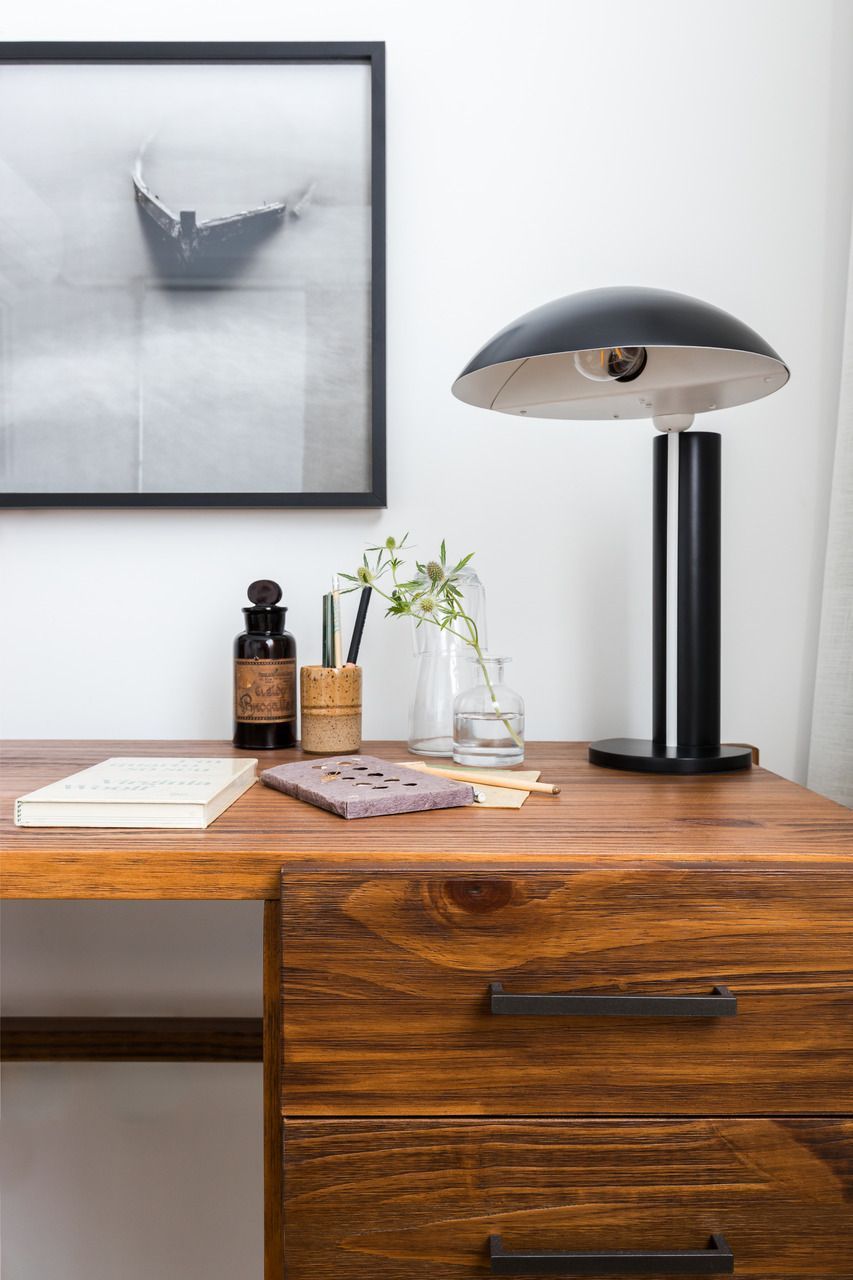 A suíte, ampliada durante a reforma, ganhou um espaço de home office essencial para a rotina do morador. Com tons claros e uma escrivaninha de madeira, o ambiente é ao mesmo tempo prático, elegante e acolhedor.