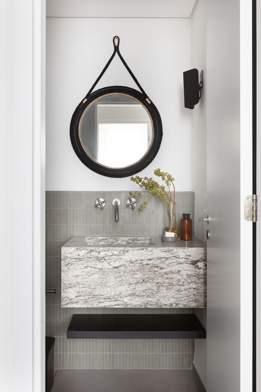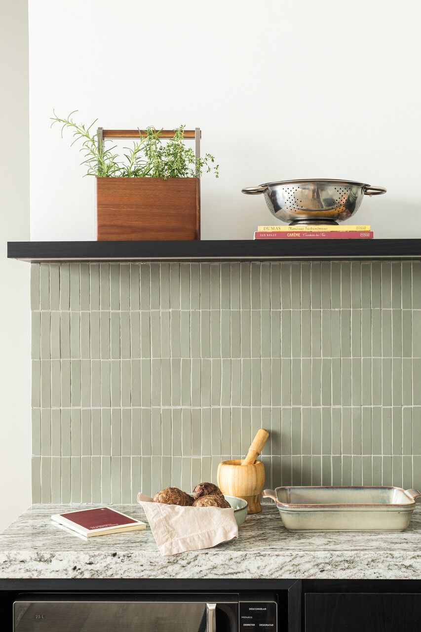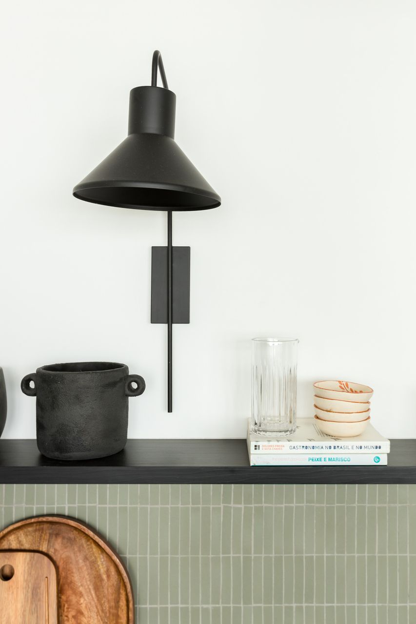 Nas escolhas estéticas, os arquitetos buscaram promover o encontro entre o industrial e o artesanal. Concreto aparente e tubulação exposta dialogam com madeira ebanizada e marcenaria planejada, equilibrando minimalismo e conforto. Na cozinha, o revestimento cerâmico verde percorre o ambiente, trazendo frescor e personalidade, enquanto detalhes de brasilidade surgem em pequenos objetos e acabamentos, criando identidade sem exageros. O mesmo cuidado se repete no lavabo, com pastilhas e bancada em granito, garantindo unidade visual e funcionalidade.