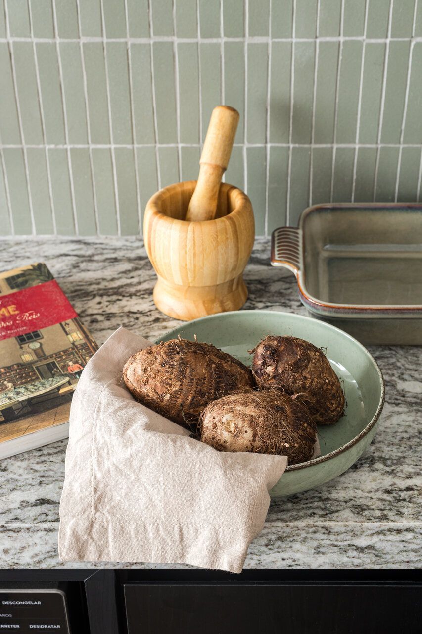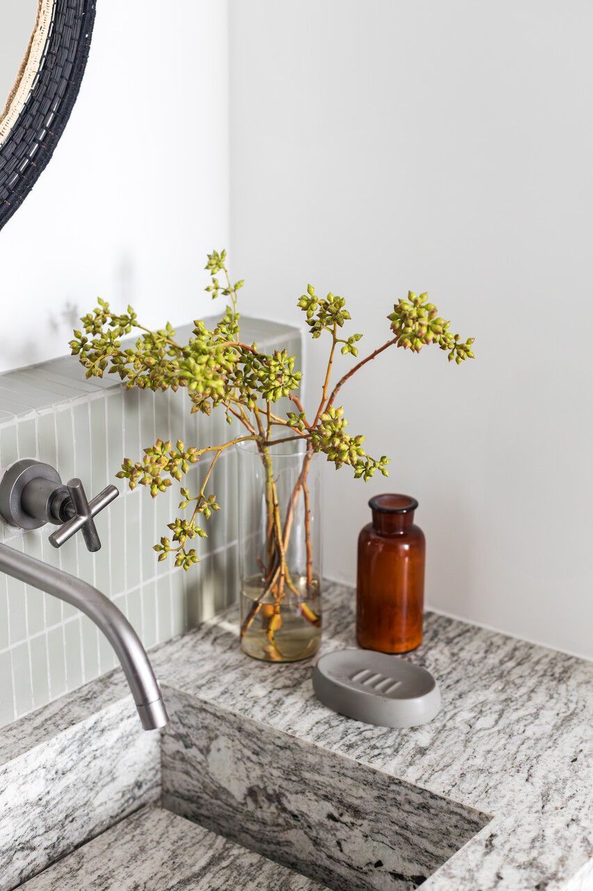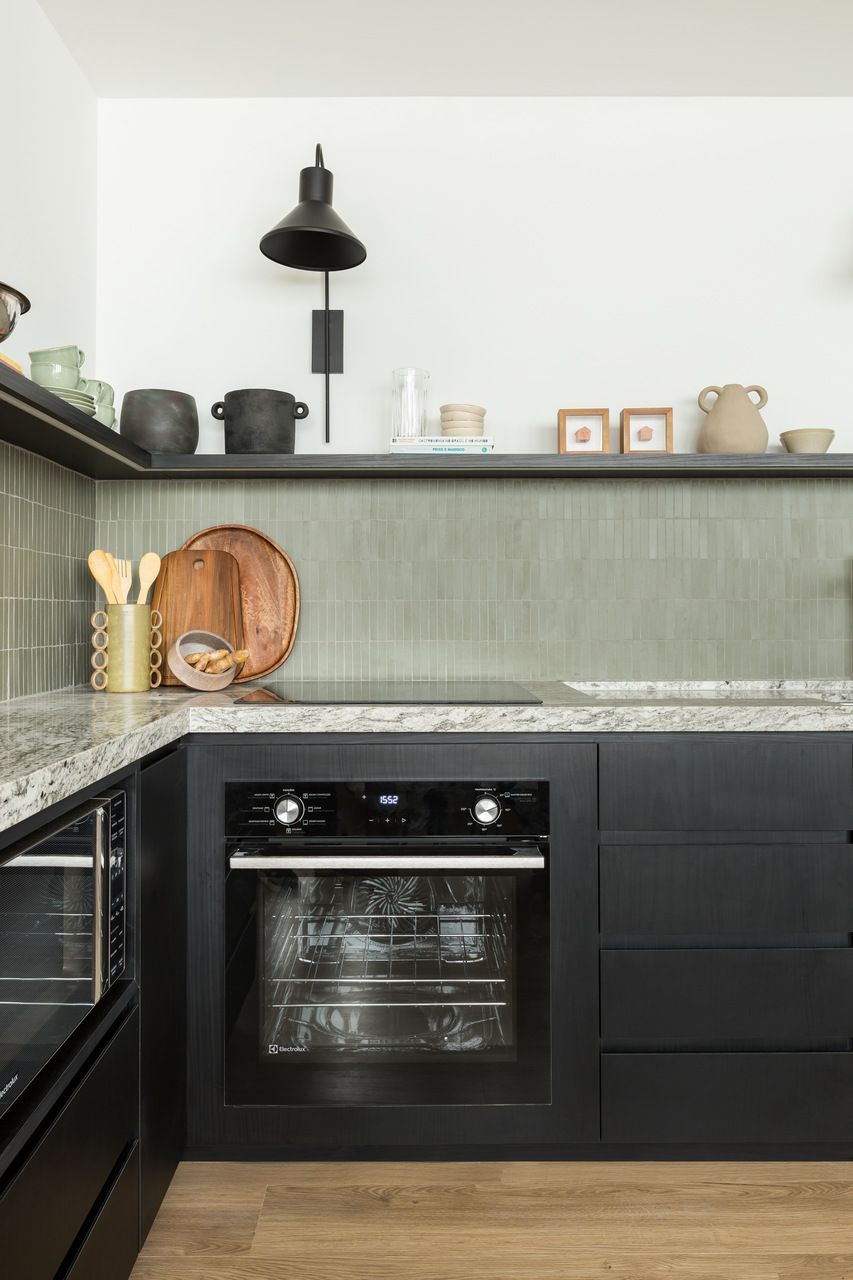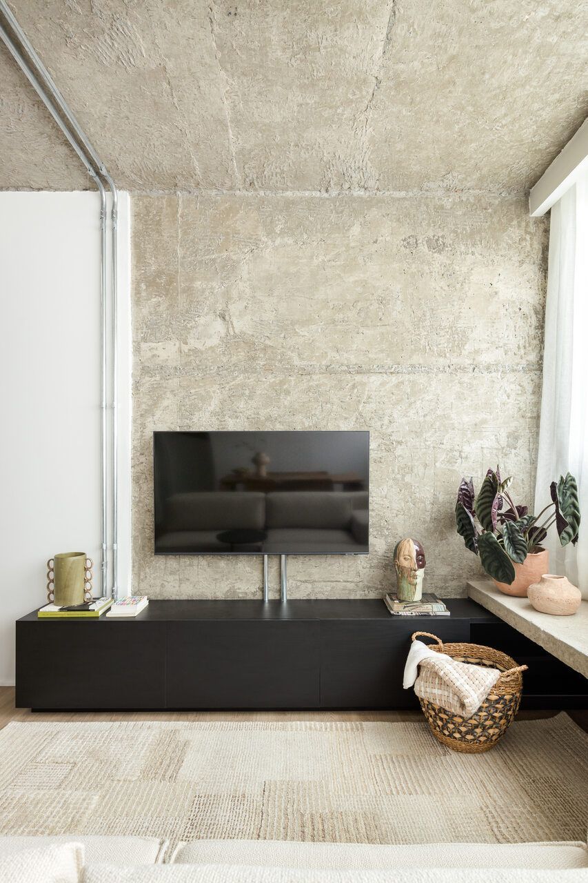 Nas escolhas estéticas, os arquitetos buscaram promover o encontro entre o industrial e o artesanal. Concreto aparente e tubulação exposta dialogam com madeira ebanizada e marcenaria planejada, equilibrando minimalismo e conforto. Na cozinha, o revestimento cerâmico verde percorre o ambiente, trazendo frescor e personalidade, enquanto detalhes de brasilidade surgem em pequenos objetos e acabamentos, criando identidade sem exageros. O mesmo cuidado se repete no lavabo, com pastilhas e bancada em granito, garantindo unidade visual e funcionalidade.