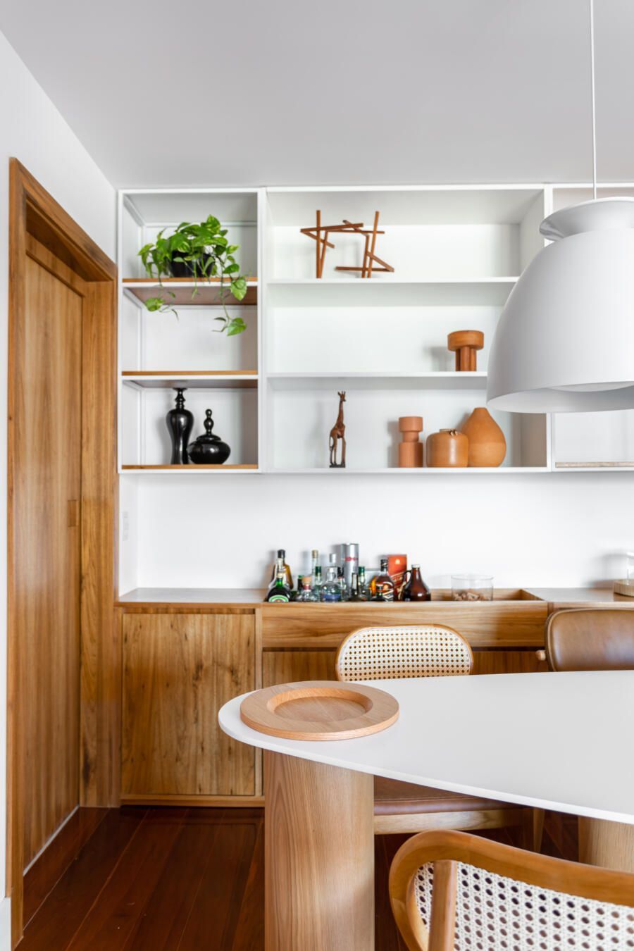 “Nos apropriamos do piso de madeira existente na sala para a escolha dos outros acabamentos e apostamos em uma marcenaria toda em folha natural de peroba e branco com puxadores em cava “escondidos”.”