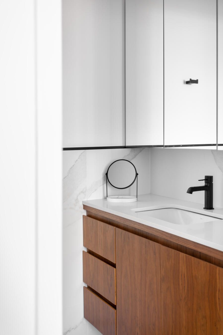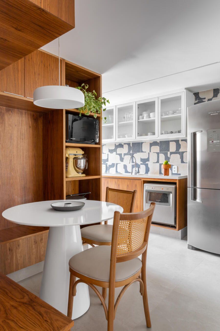 “Na cozinha, criamos um canto alemão super acolhedor que dá uma sensação de “casinha” que a gente adora.  Criamos um conceito único para os banheiros, usando a mesma solução espacial e revestimentos iguais de cores de diferentes – outro “truque” que adoramos para trazer uniformidade ao projeto.”