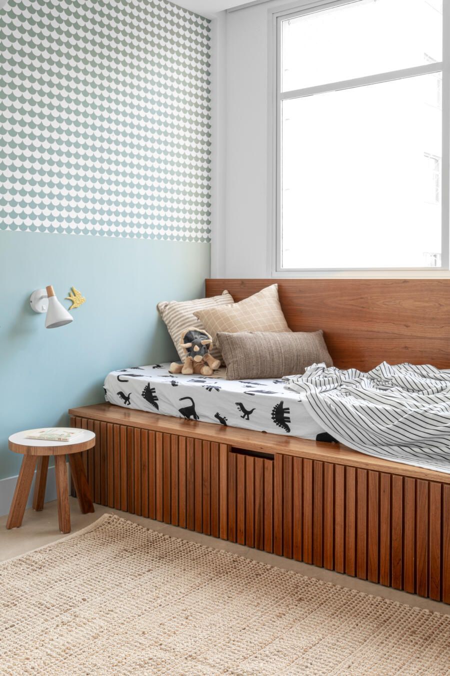 “No quartinho infantil, nossa sugestão foi um projeto atemporal, com o tema de Dinossauros apenas em detalhes que podem trocados mais facilmente. Isso permite mais longevidade de projeto, uma vez que a criança cresce e muda seus gostos e preferências. A mesinha de estudos que aumenta de acordo com o crescimento da criança foi o ponto alto do quartinho do Bê.”