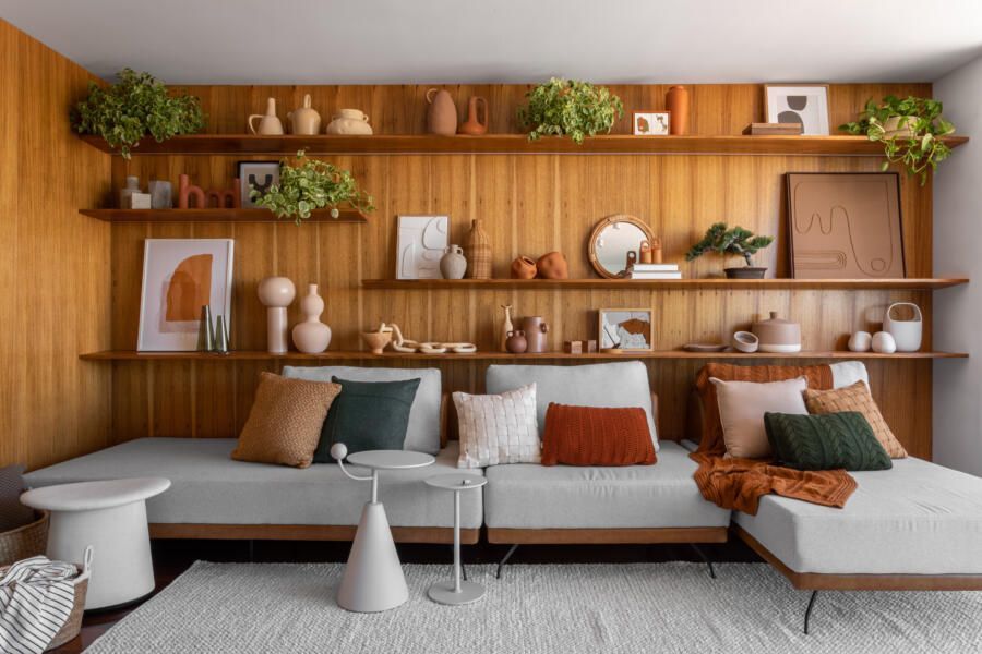 Na decoração, a aposta foi uma paleta de tons neutros terrosos e pequenos toques em verde para trazer a elegância que os clientes pediram. Sobre a cozinha, a designer Lívia Boechat explica: