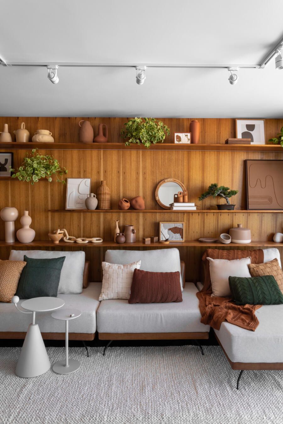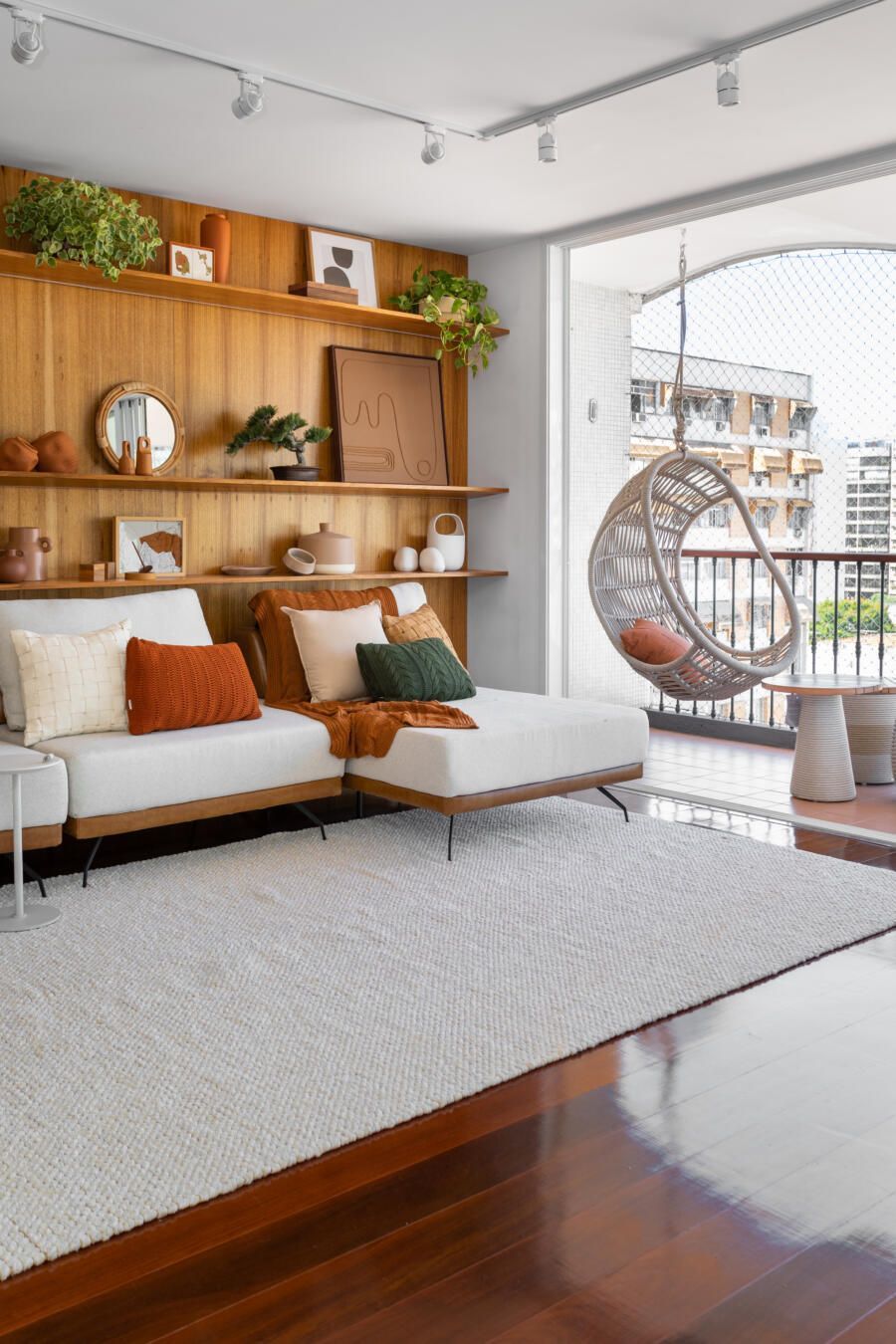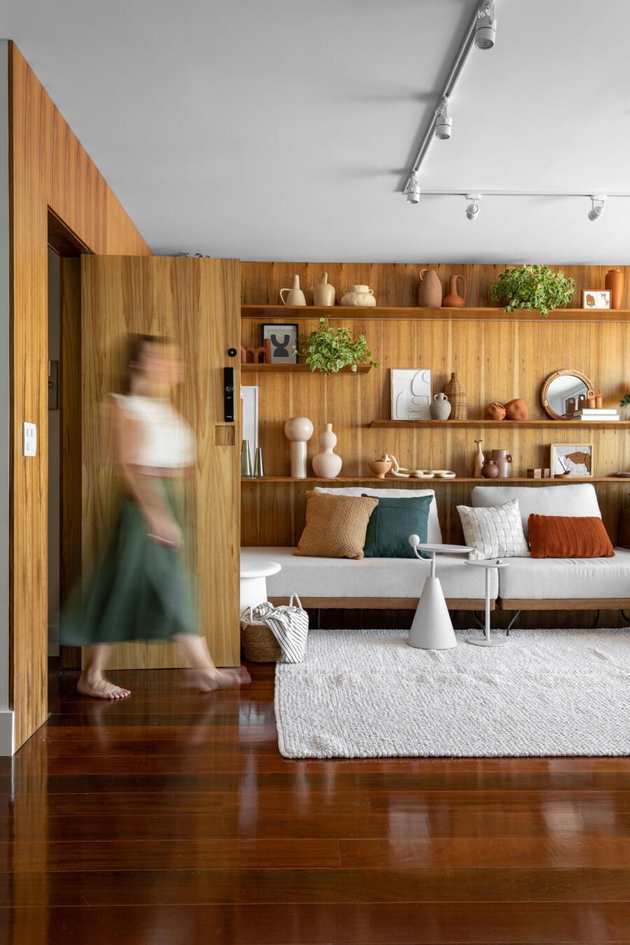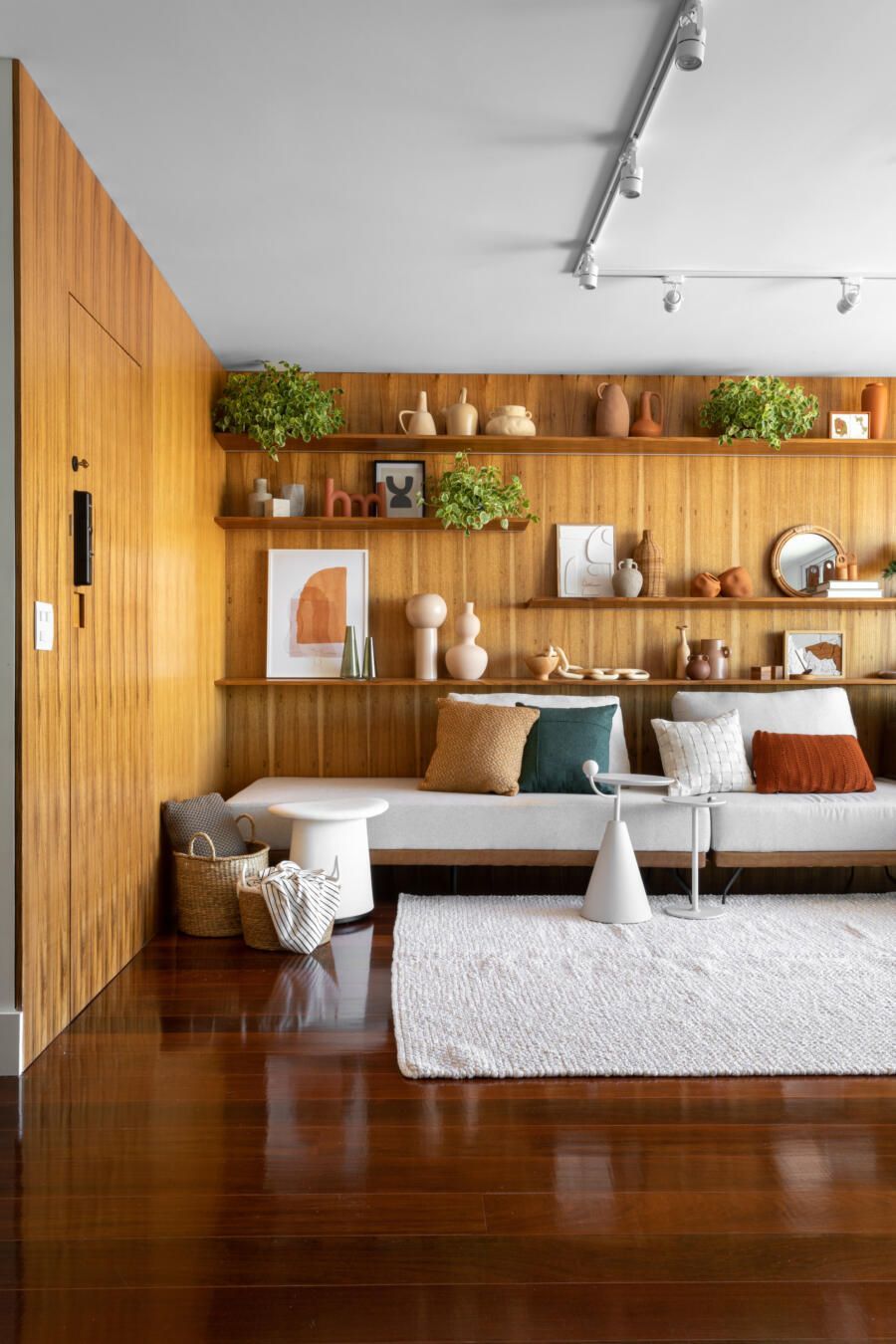 “Nos apropriamos do piso de madeira existente na sala para a escolha dos outros acabamentos e apostamos em uma marcenaria toda em folha natural de peroba e branco com puxadores em cava “escondidos”.”