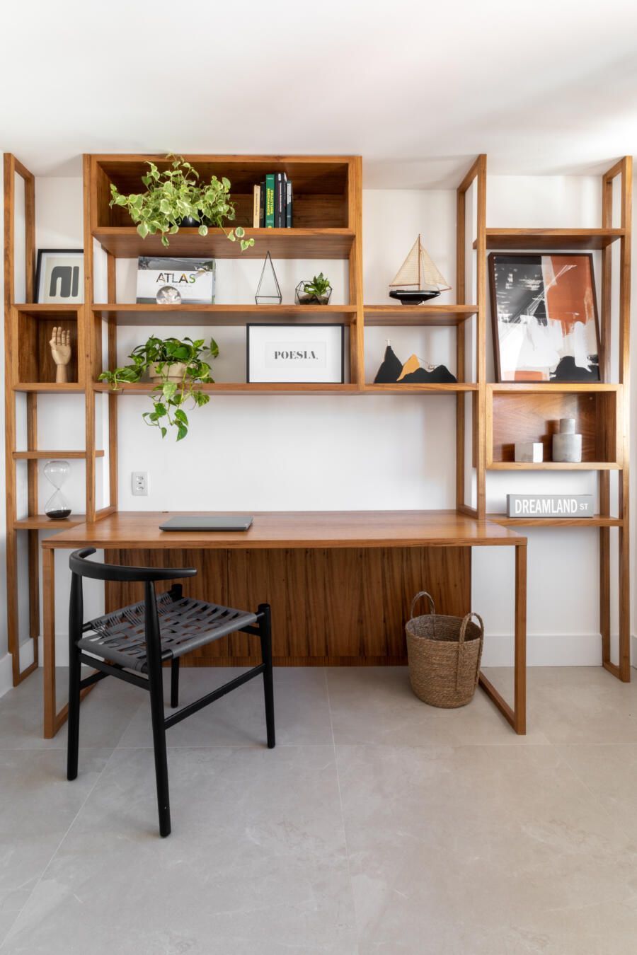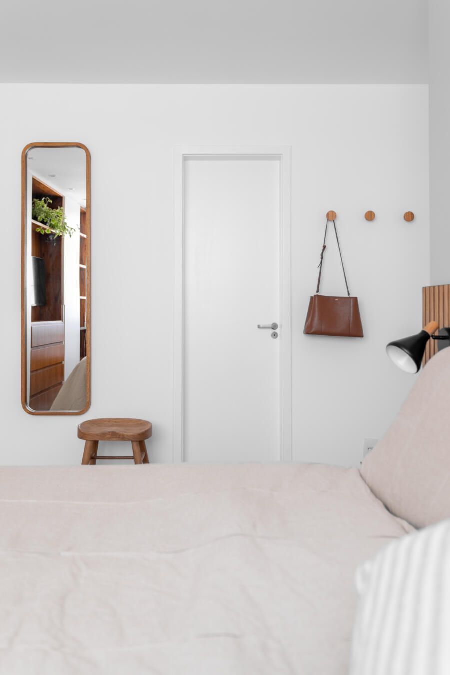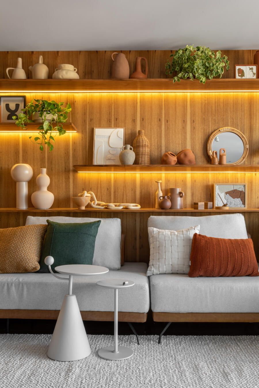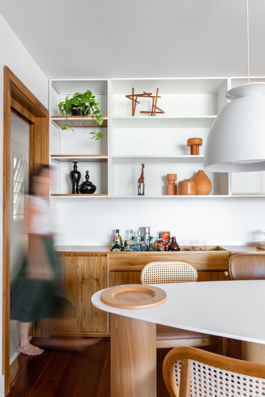 “Nos apropriamos do piso de madeira existente na sala para a escolha dos outros acabamentos e apostamos em uma marcenaria toda em folha natural de peroba e branco com puxadores em cava “escondidos”.”