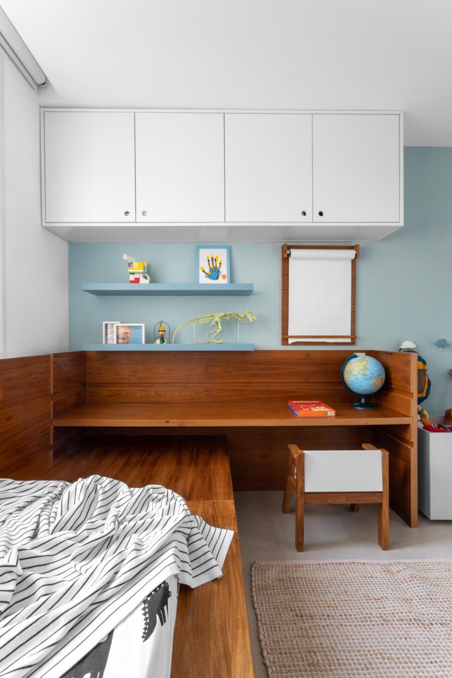 “No quartinho infantil, nossa sugestão foi um projeto atemporal, com o tema de Dinossauros apenas em detalhes que podem trocados mais facilmente. Isso permite mais longevidade de projeto, uma vez que a criança cresce e muda seus gostos e preferências. A mesinha de estudos que aumenta de acordo com o crescimento da criança foi o ponto alto do quartinho do Bê.”