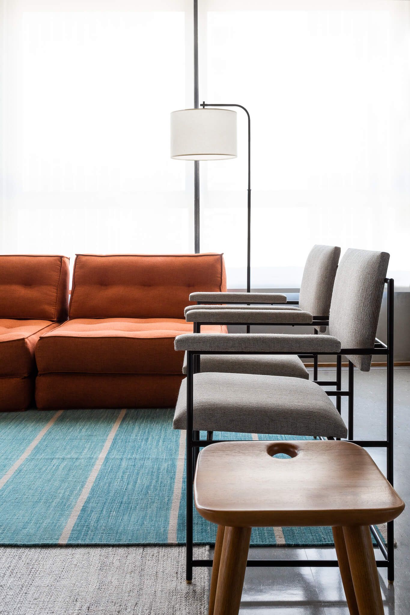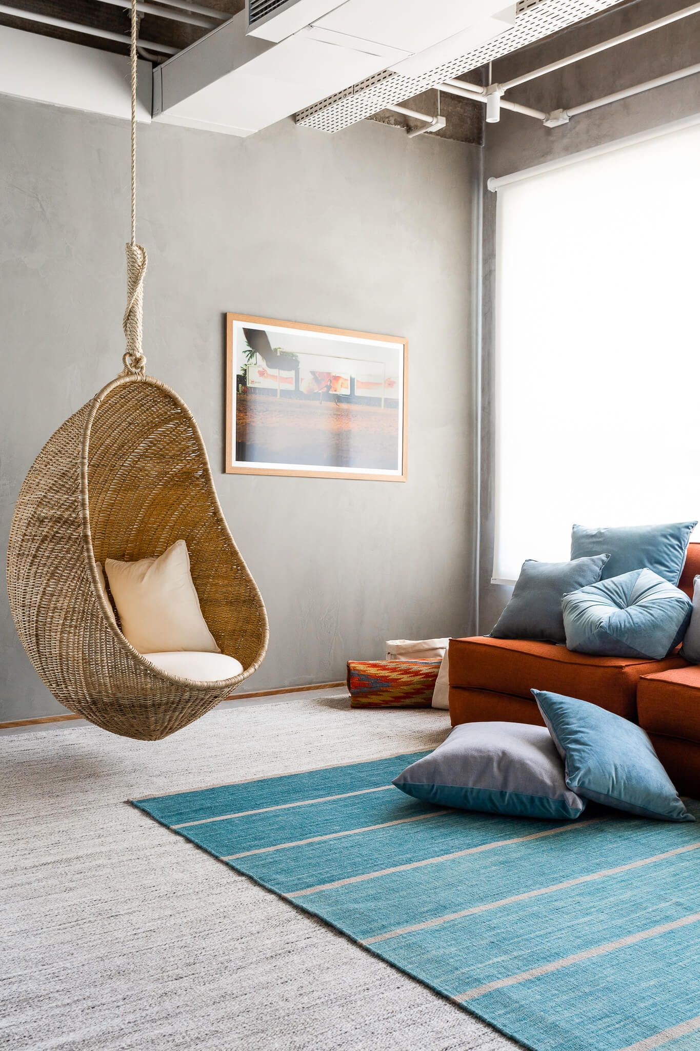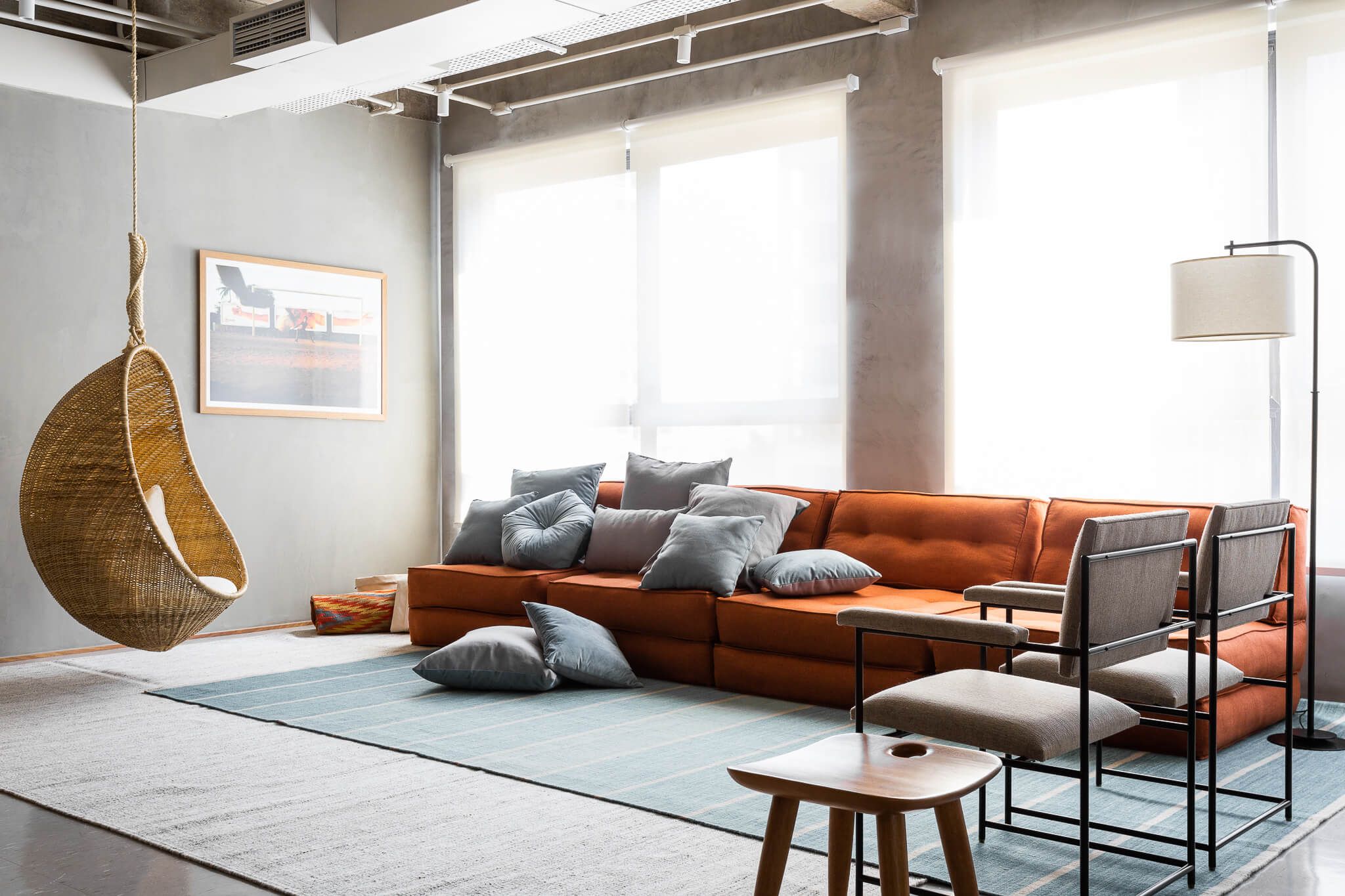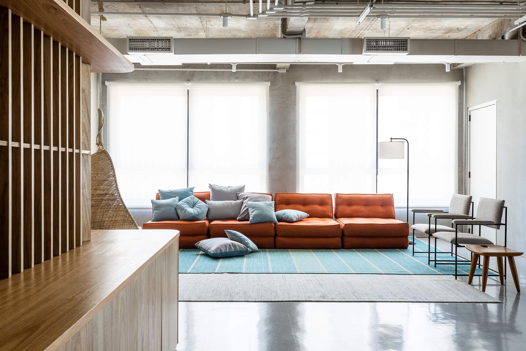 O projeto conta ainda com uma copa que repete os elementos dos demais ambientes, e confortáveis cadeiras de polipropileno injetado com serragem. O azul, cor importante na identidade visual da empresa, é destacado com uma cor oposta completar – o tom terroso do sofá da Futon Company.