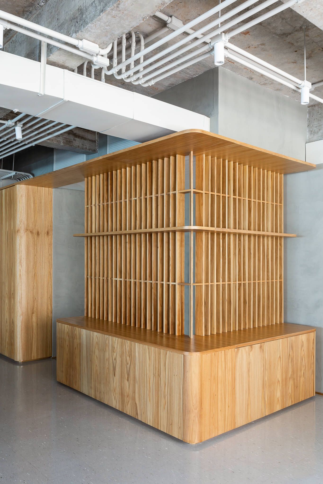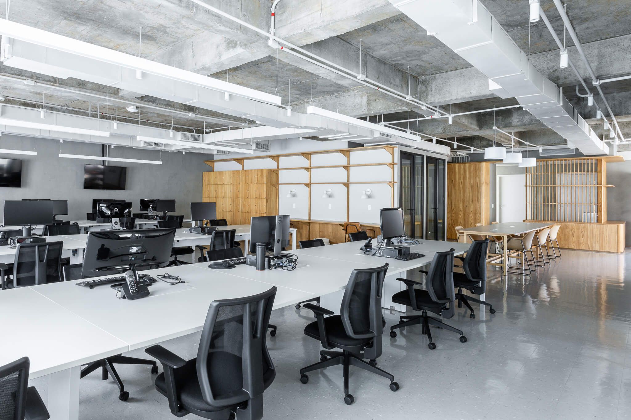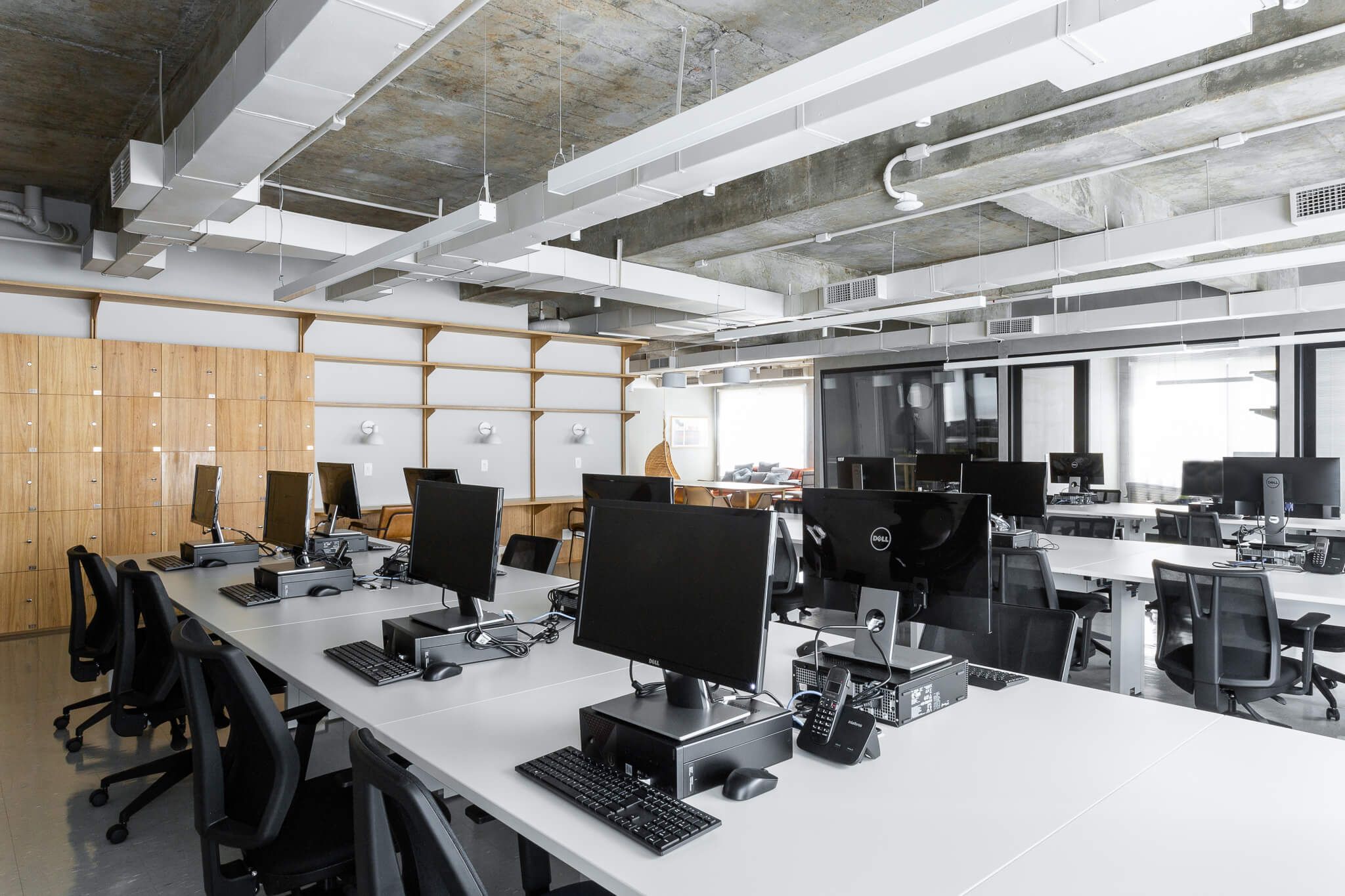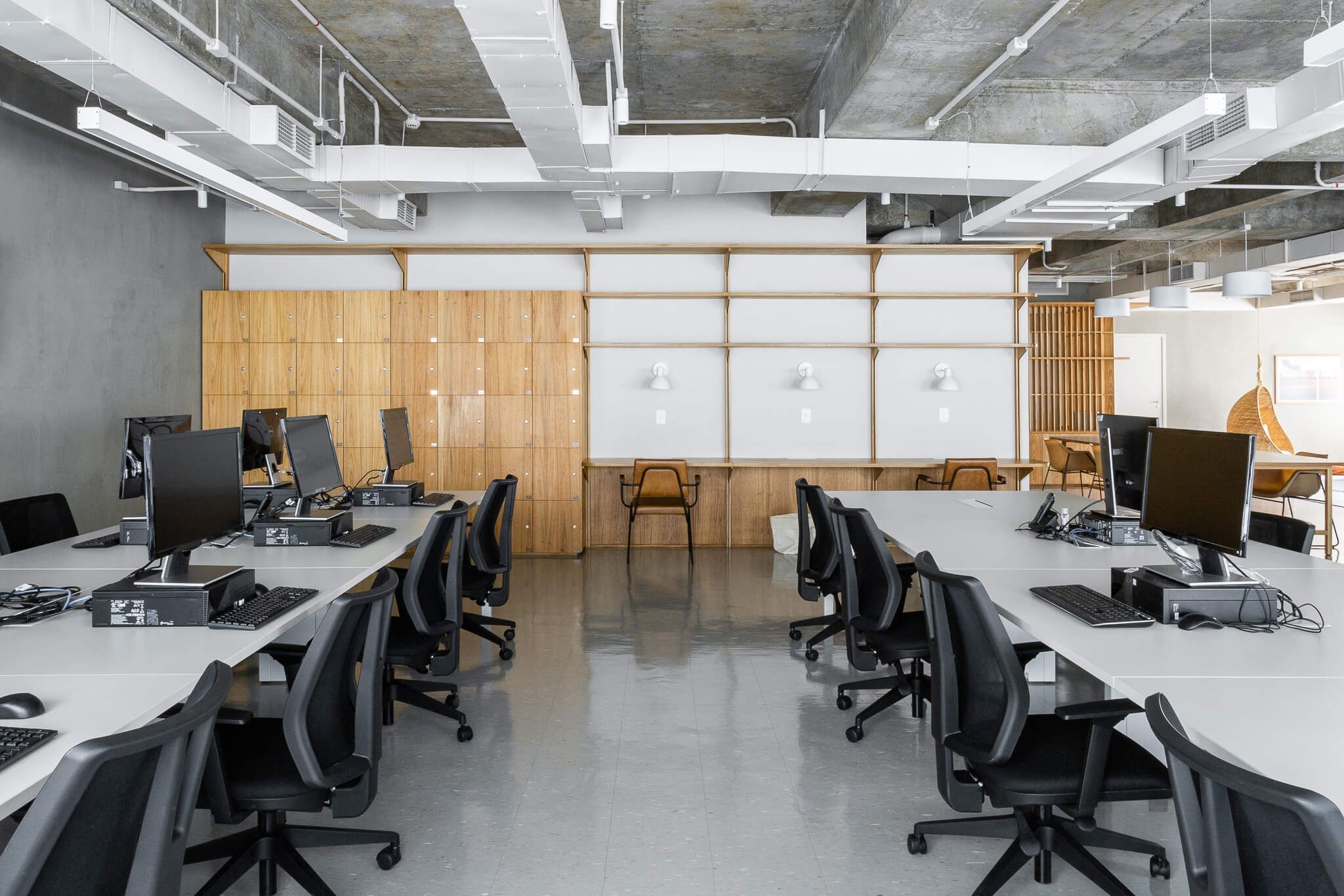 O antigo forro foi inteiramente removido, e a estrutura da laje em concreto exposta, toda a infraestrutura de ar condicionado foi reformada e pintada de uma cor clara. Elementos como o sistema de combate a incêndio, eletrodutos de iluminação e elétrica também ficaram aparentes contribuindo para a atmosfera descolada.