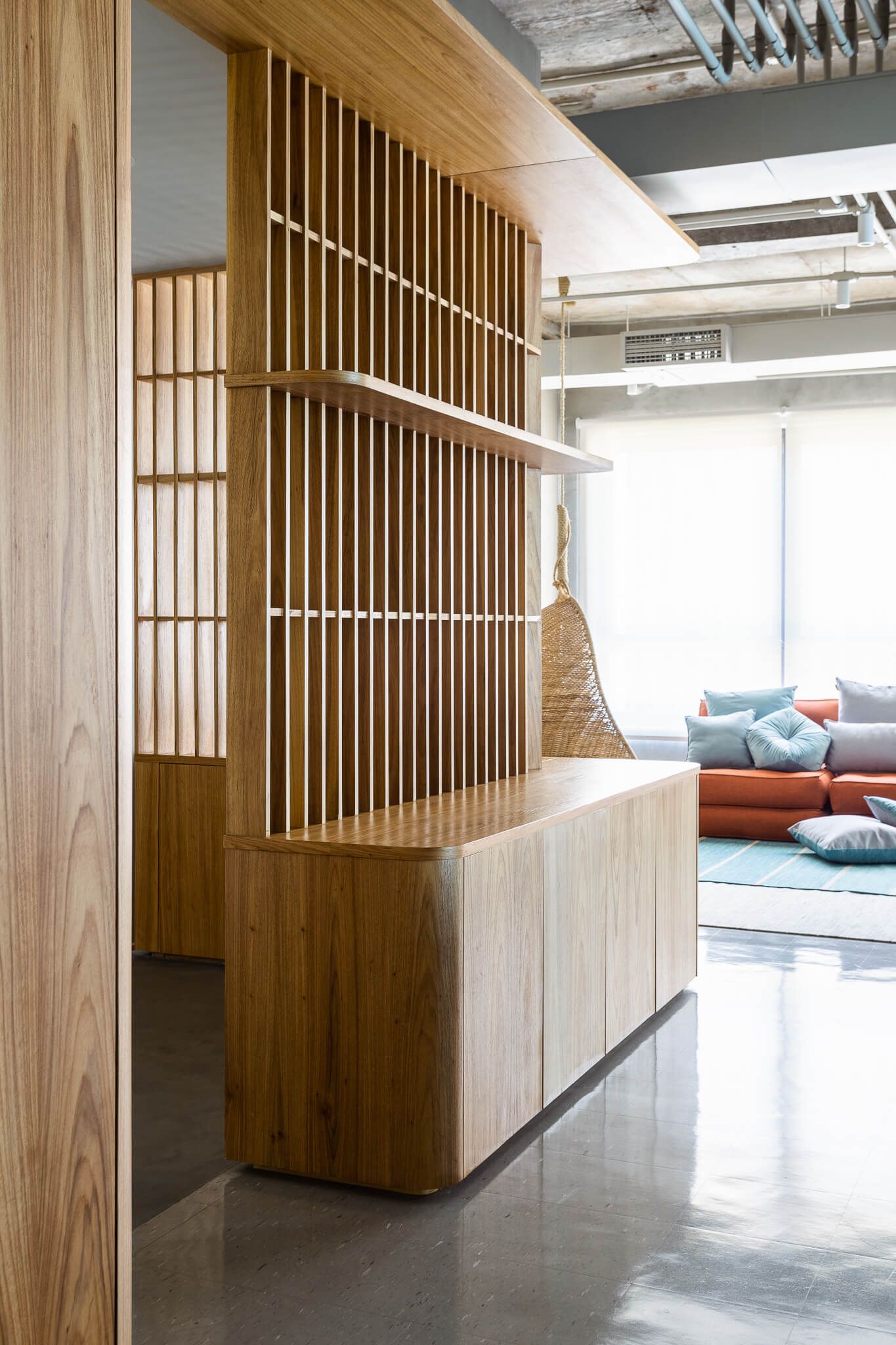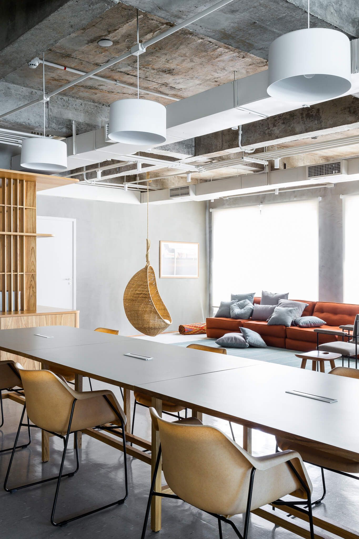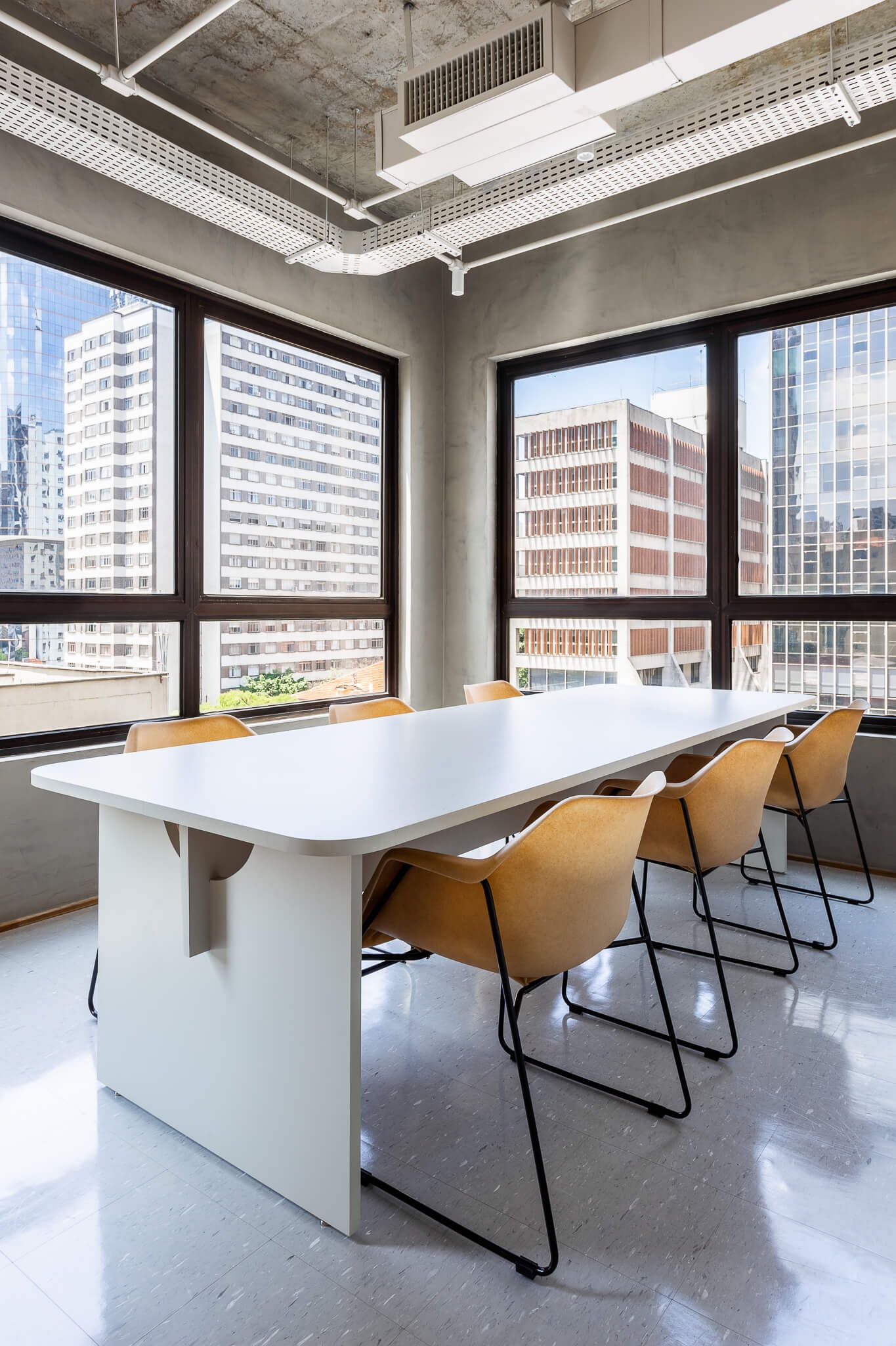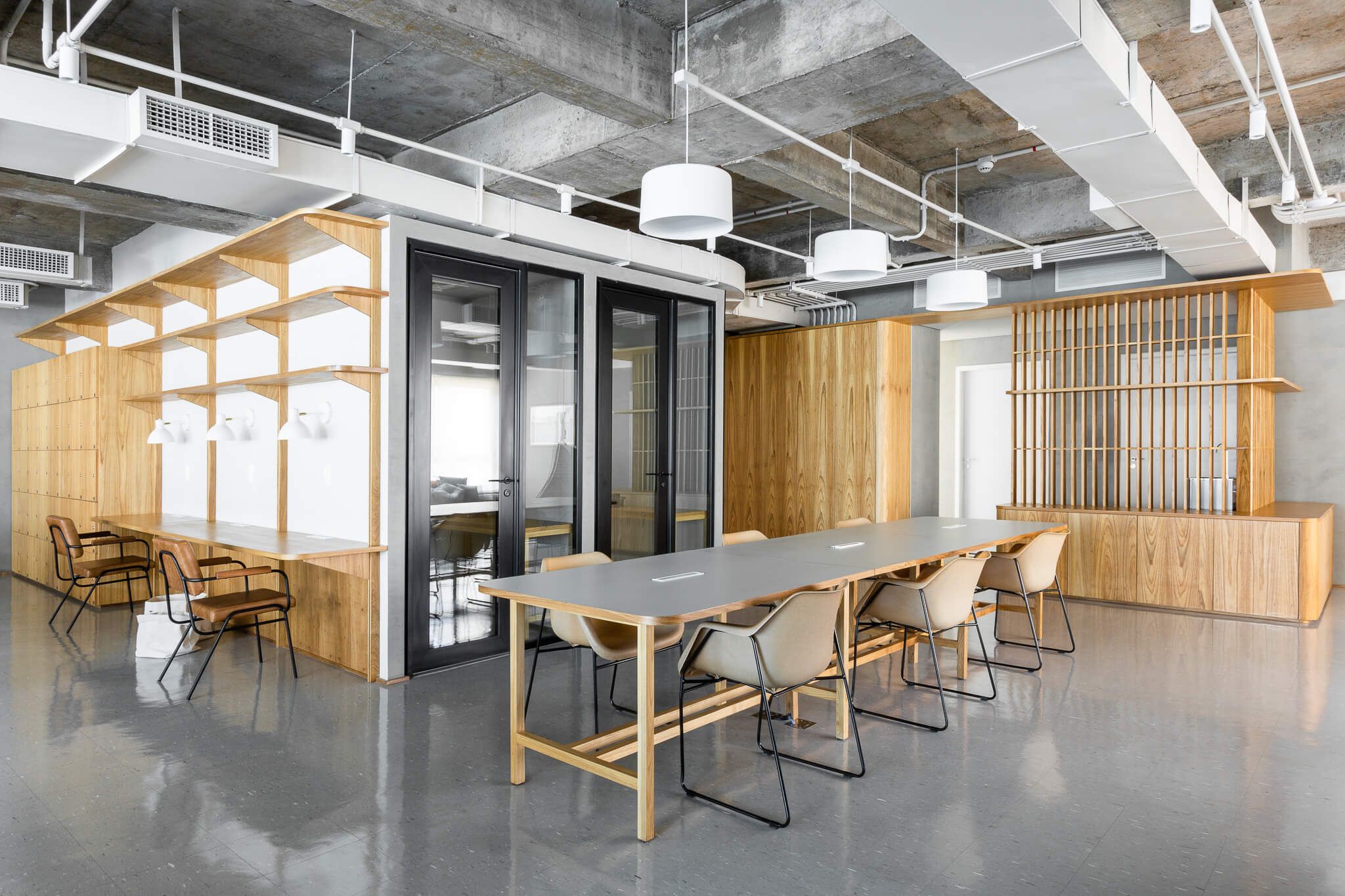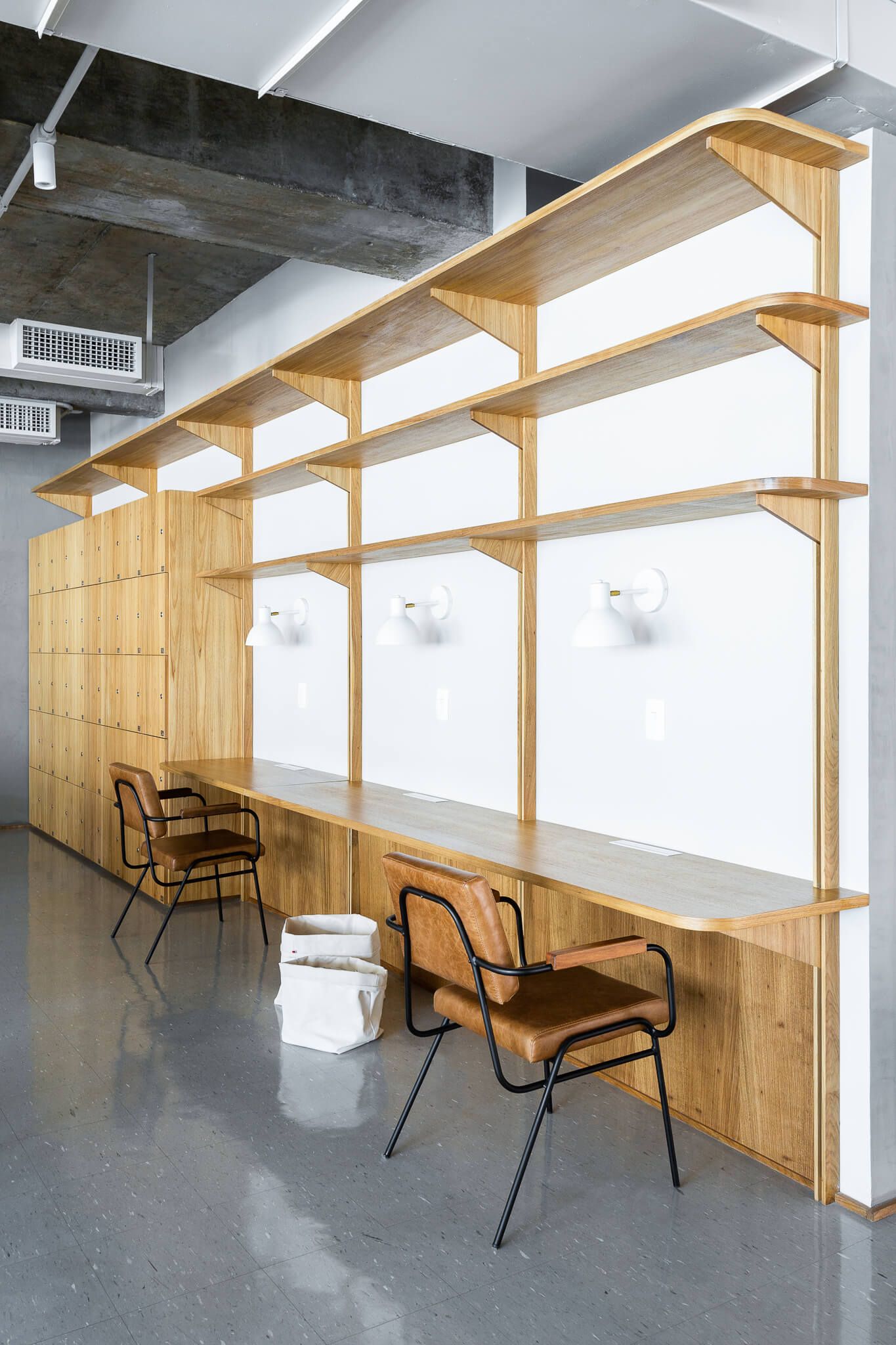 O antigo forro foi inteiramente removido, e a estrutura da laje em concreto exposta, toda a infraestrutura de ar condicionado foi reformada e pintada de uma cor clara. Elementos como o sistema de combate a incêndio, eletrodutos de iluminação e elétrica também ficaram aparentes contribuindo para a atmosfera descolada.