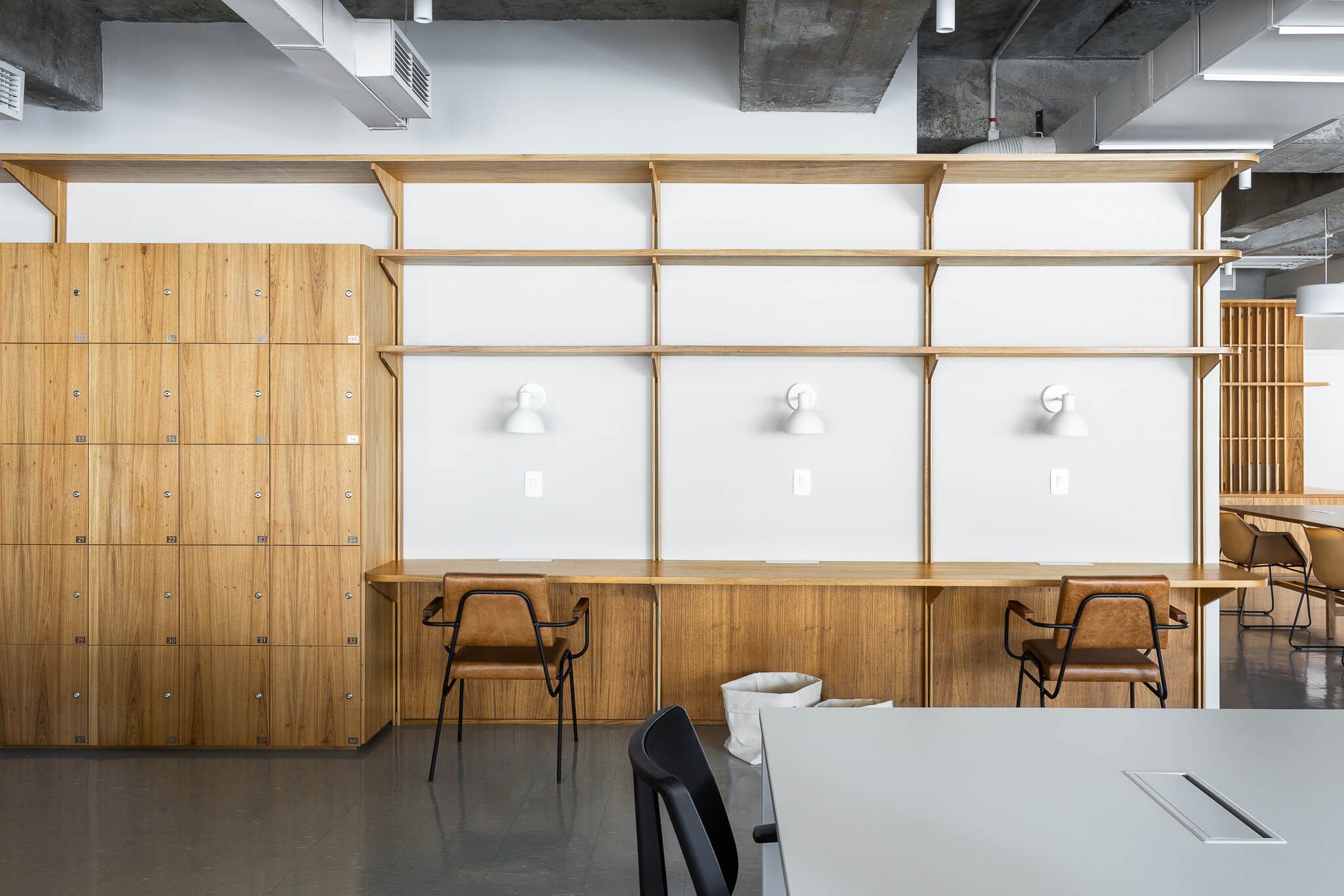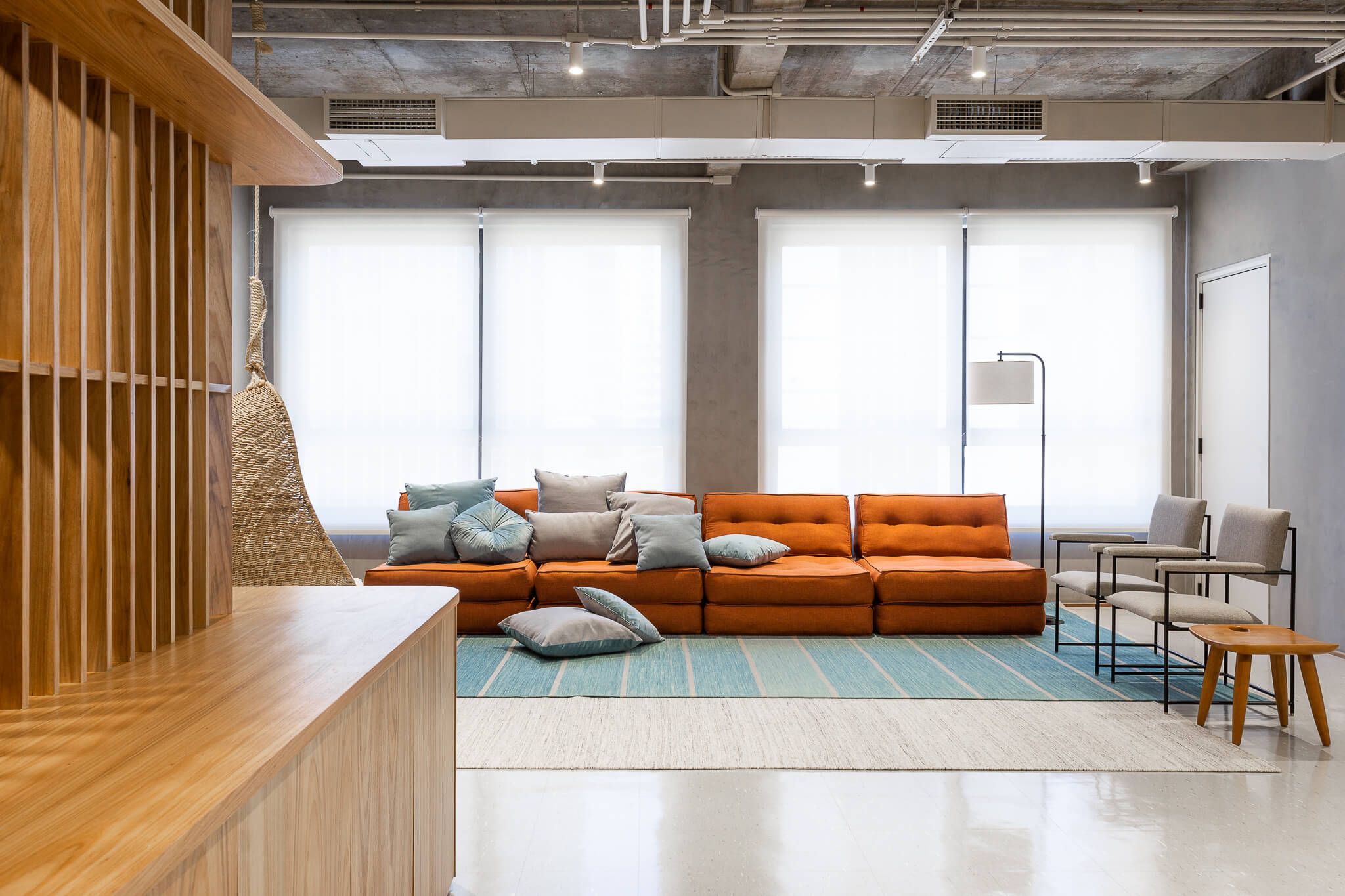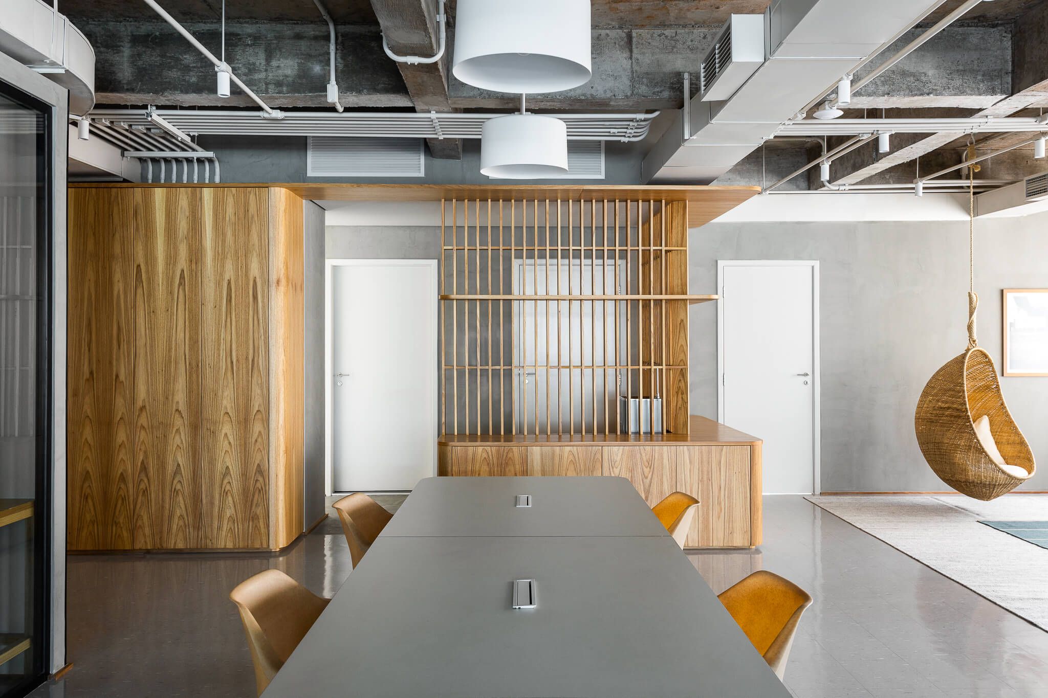 As paredes do espaço foram revestidas com uma textura de cimento queimado de uma cor bem próxima à da laje e piso vinílico. Para o mobiliário corporativo, o escritório mesclou a marcenaria revestida com folha natural de madeira Freijó.