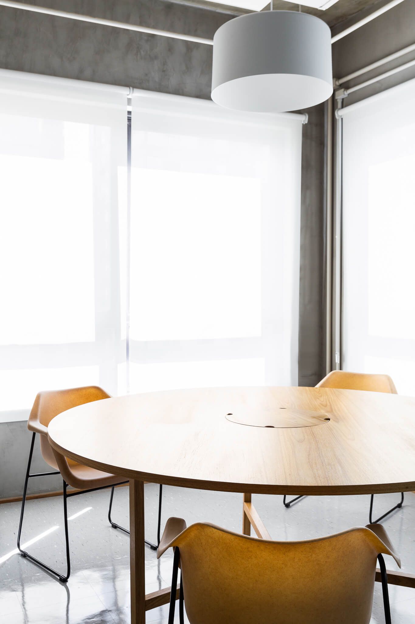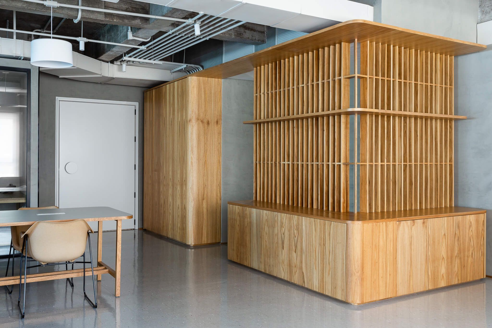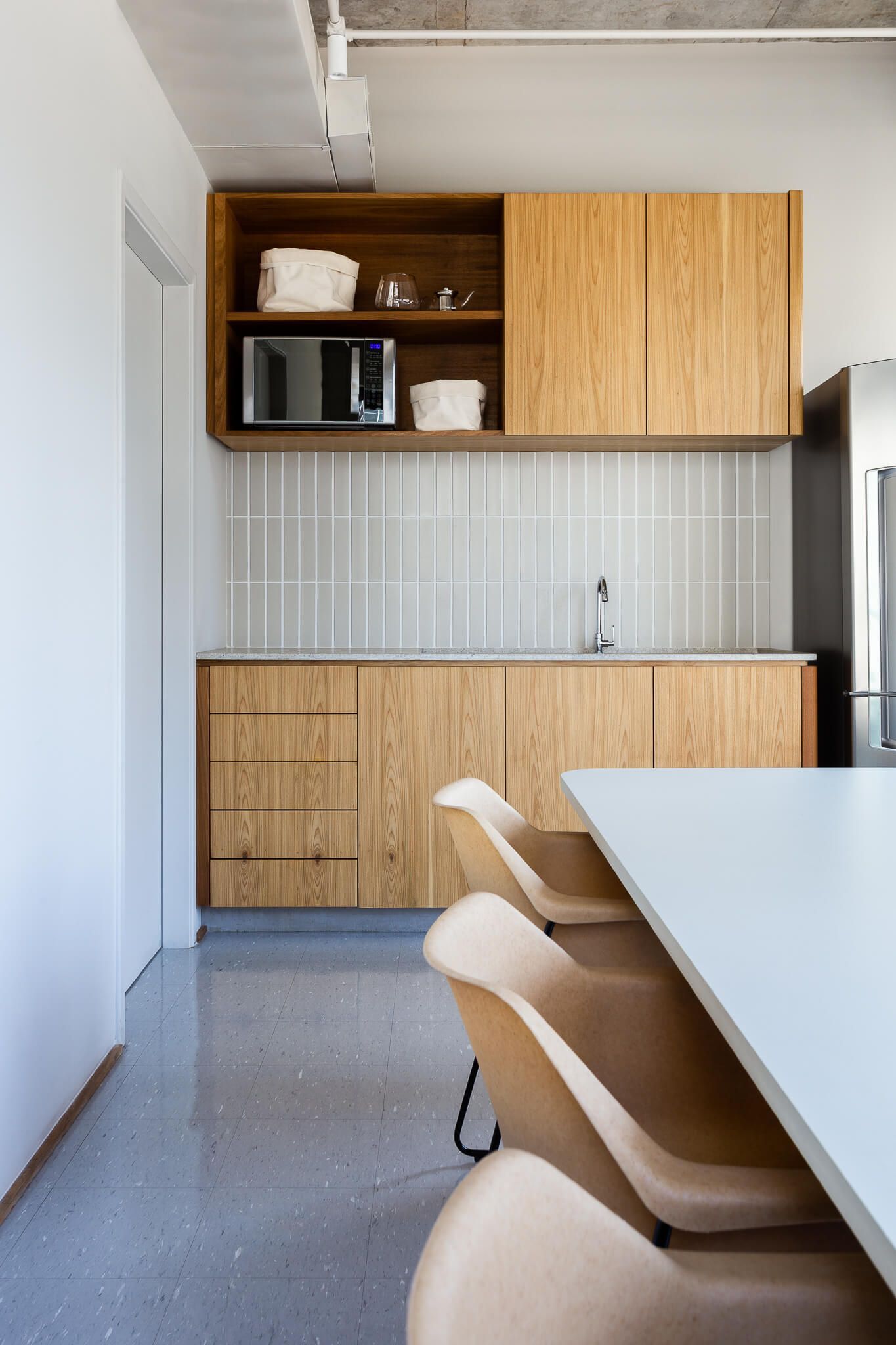 As paredes do espaço foram revestidas com uma textura de cimento queimado de uma cor bem próxima à da laje e piso vinílico. Para o mobiliário corporativo, o escritório mesclou a marcenaria revestida com folha natural de madeira Freijó.