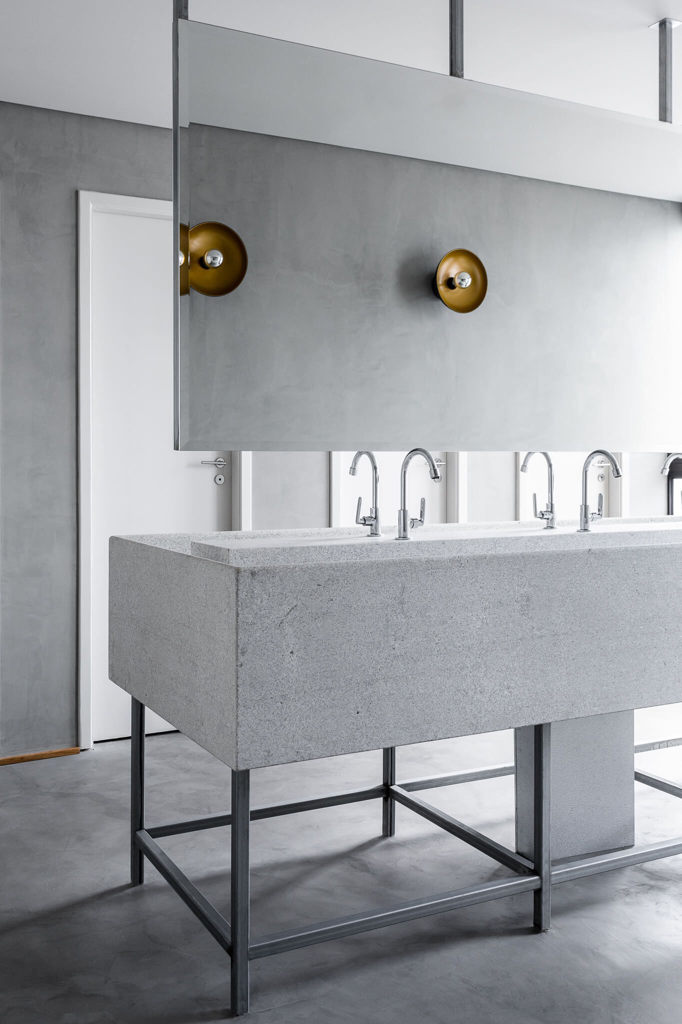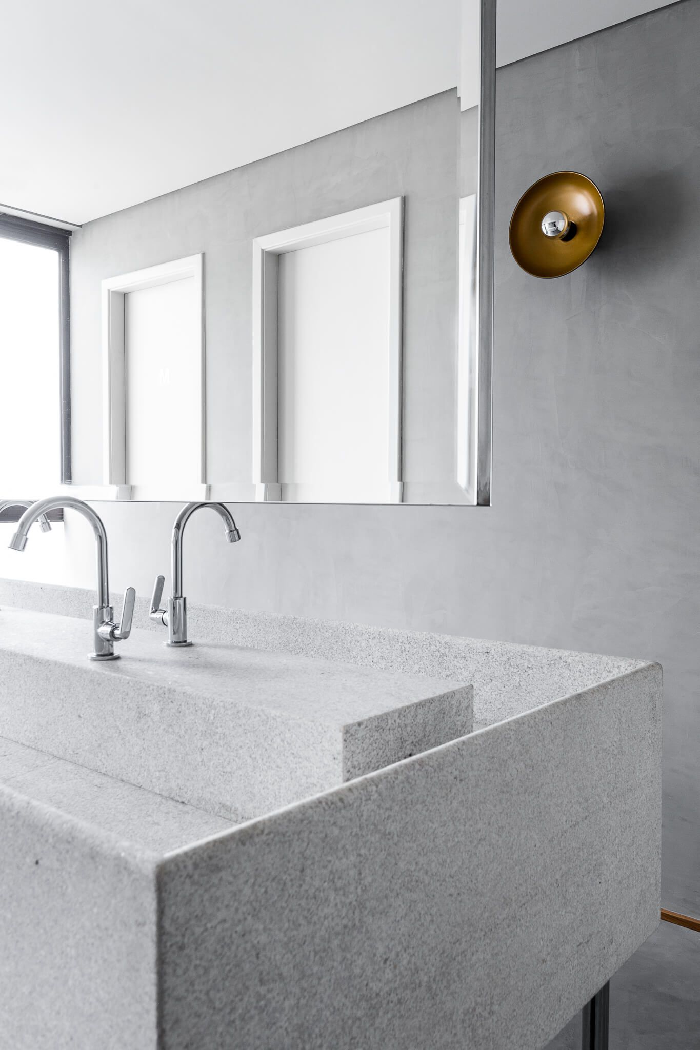 Os banheiros passaram por uma reforma maior, o Um Design Studio ampliou e a criou um espaço para pessoas com necessidades especiais. No espaço principal, um grande “tanque” de granito bruto pode ser usado por todos os lados, e completando, um grande espelho fixado no teto.