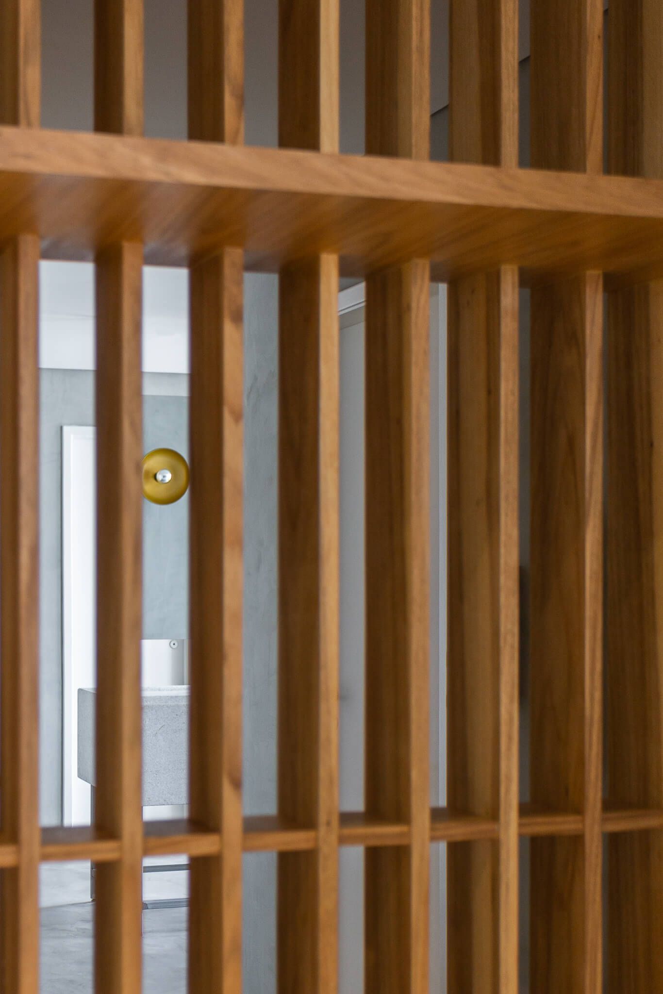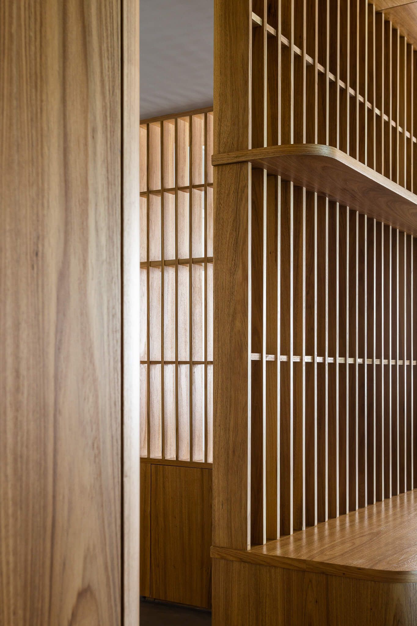 O mobiliário conta com detalhes afetivos como as quinas arredondadas, elementos vazados, prateleiras com estruturas verticais aparentes e mãos francesas na mesma madeira.