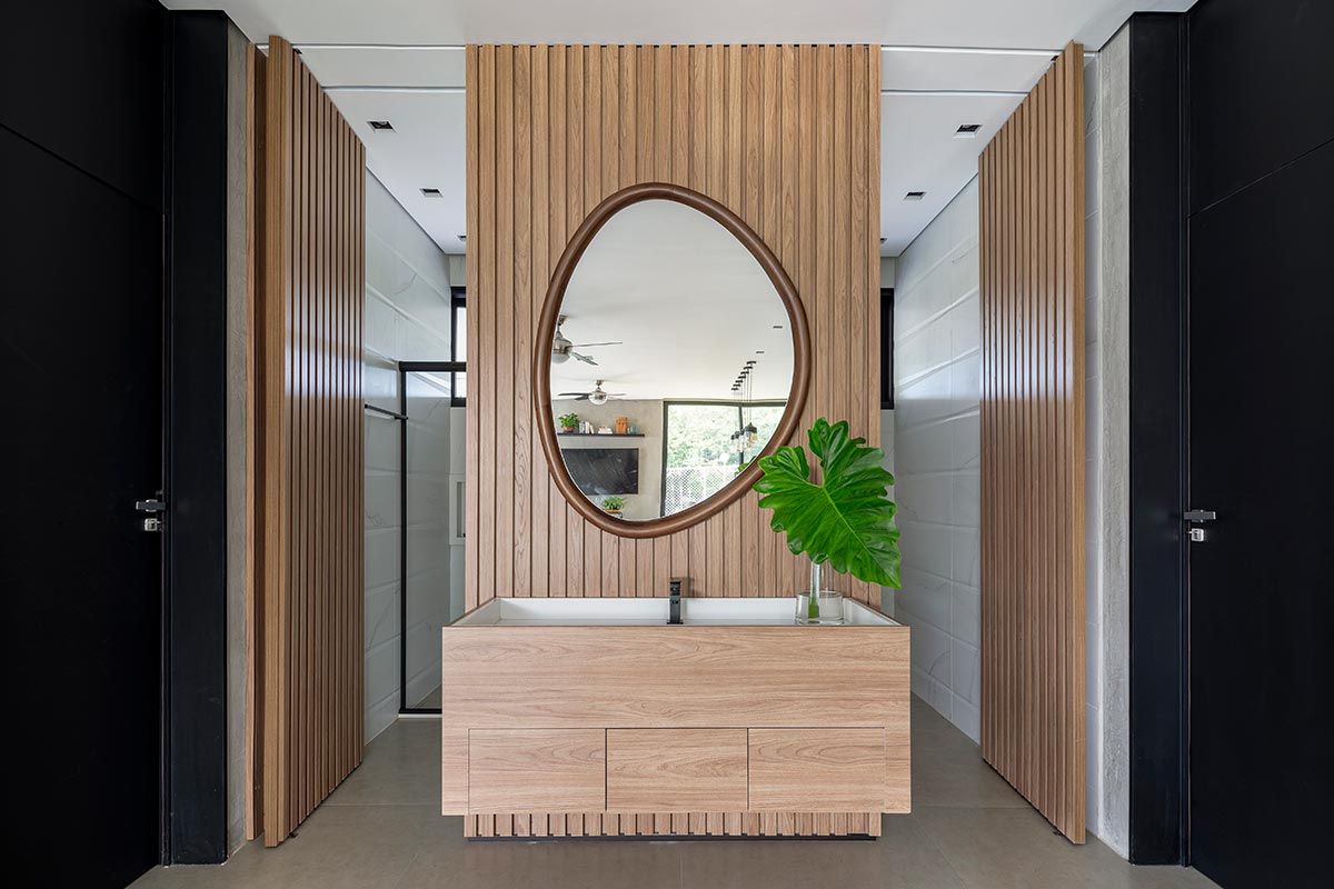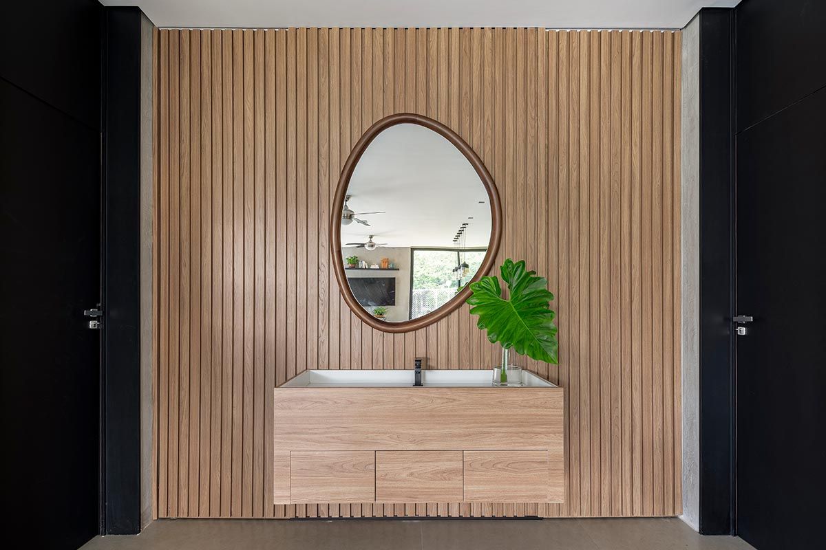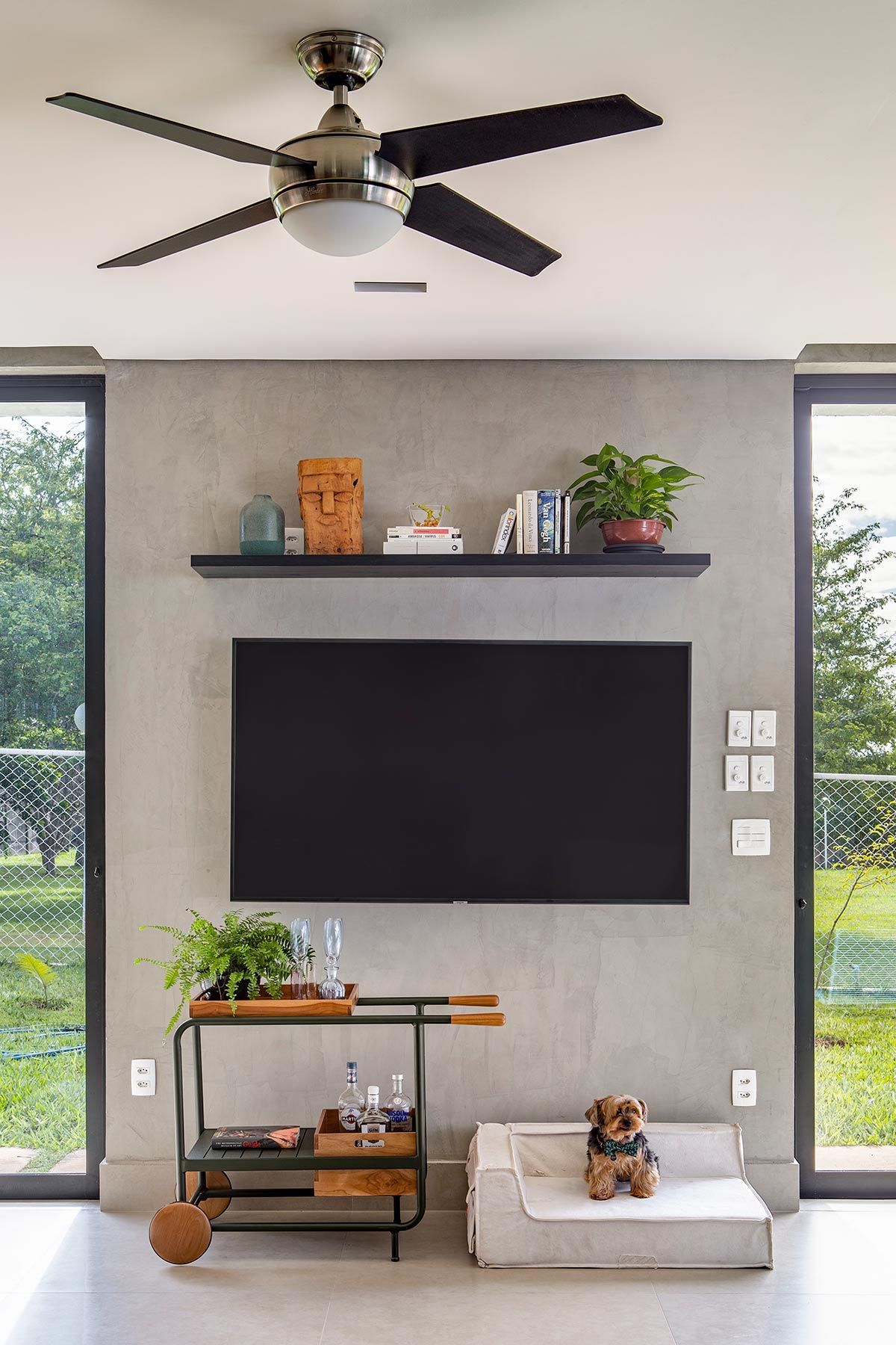 O resultado ficou convidativo e aconchegante. O concreto aparente, usado pensando na estética e custo total de obra, é um elemento marcante e atemporal desse projeto.