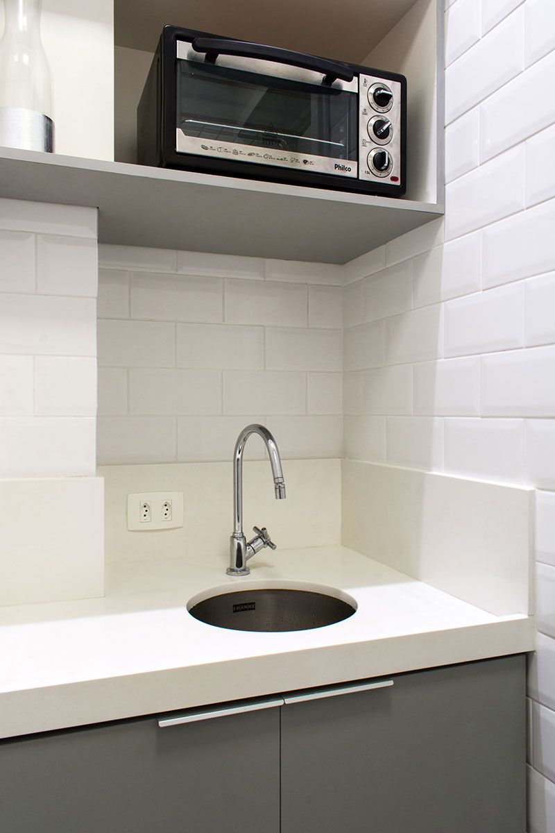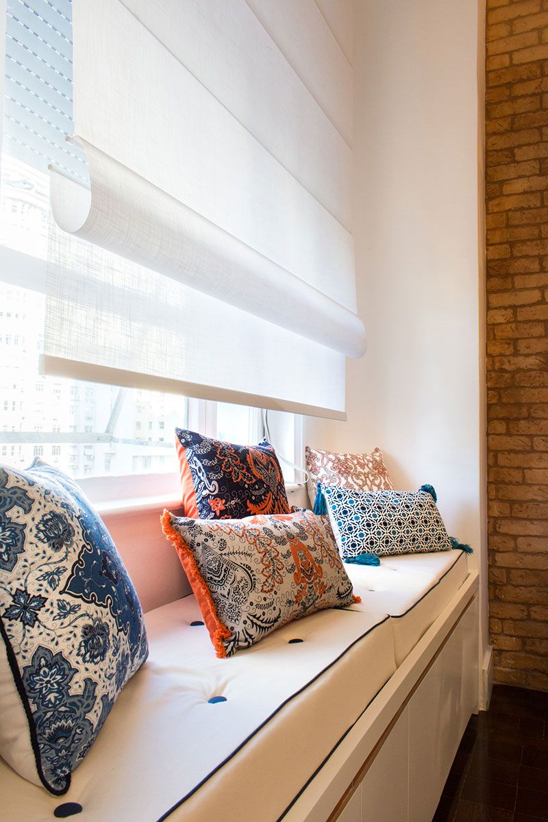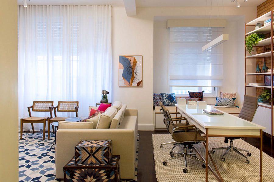 O mobiliário segue a mesma linguagem, com base neutra e clara e os toques de cor entram nos objetos. As esquadrias externas, originais do edifício, foram restauradas e foi usado o mesmo desenho nas novas esquadrias internas da sala.