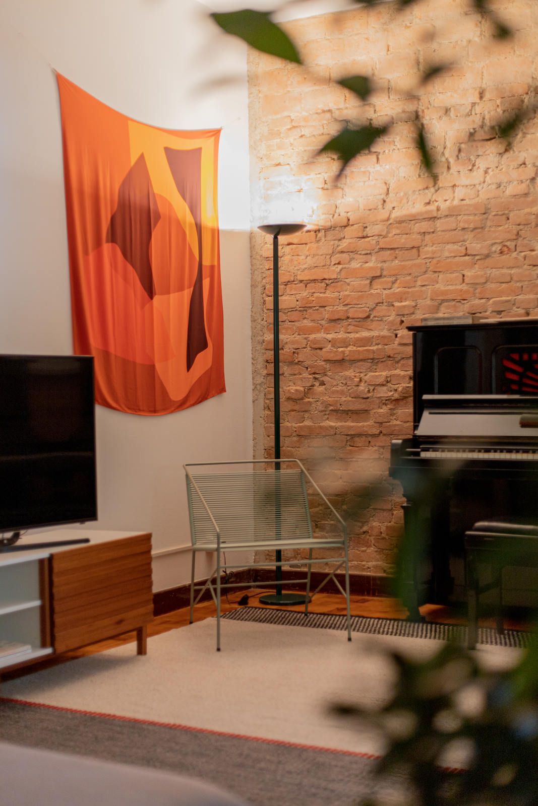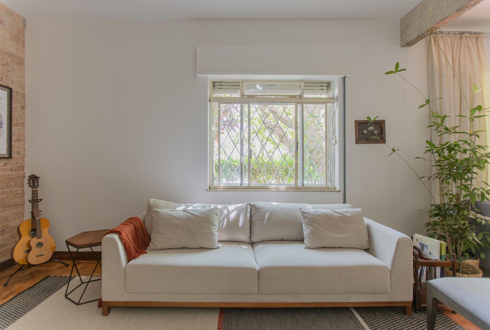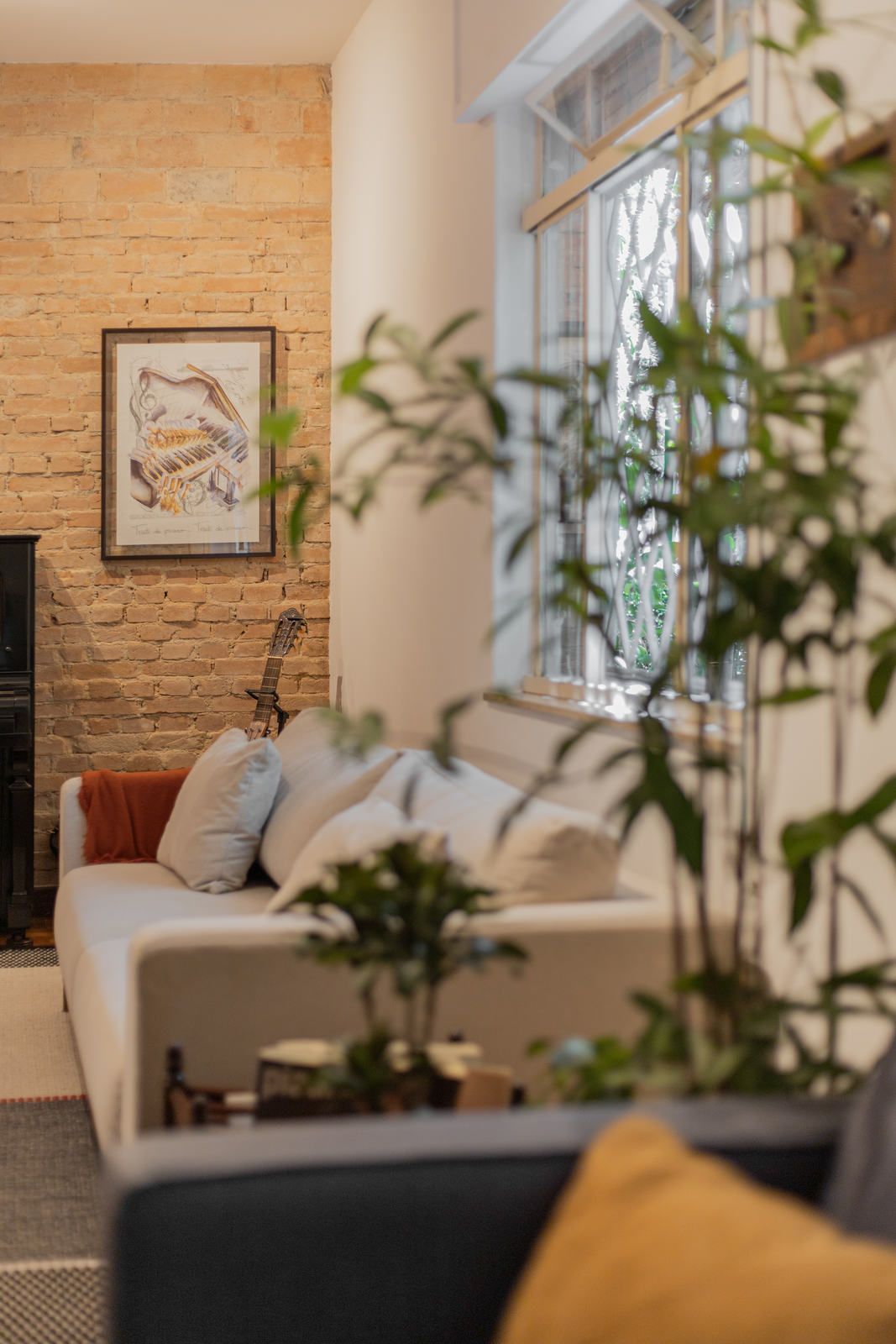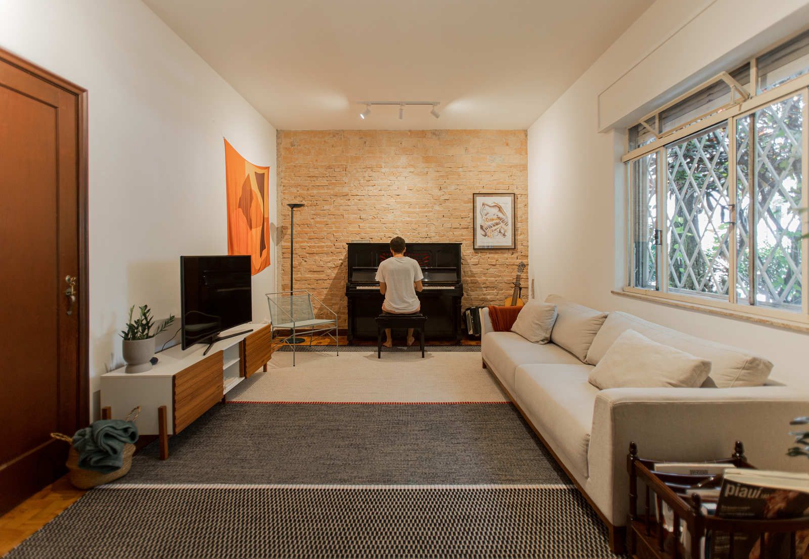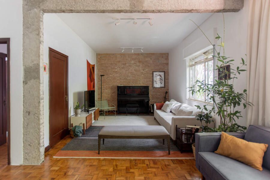 “Uma das paredes da sala foi descascada para ficar com os tijolos aparentes, criando um fundo para o piano. Os tijolos dessa demolição saíram inteiros e foram reutilizados em outro projeto nosso! Nos outros dois quartos, separamos o descanso do trabalho. O cômodo do meio virou o quarto, com cama e armários. Já a iluminação foi resolvida com uma peça desenhada por nós: uma eletrocalha pintada de branco e solta do teto serve como suporte de spots e lâmpadas tubulares, que oferecem uma luz mais intimista.”