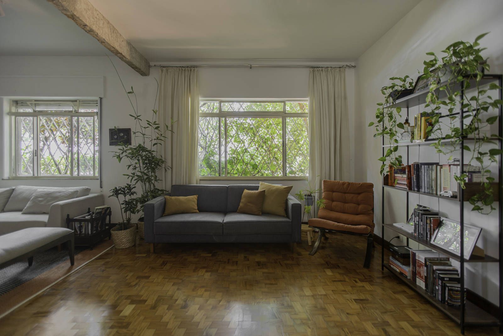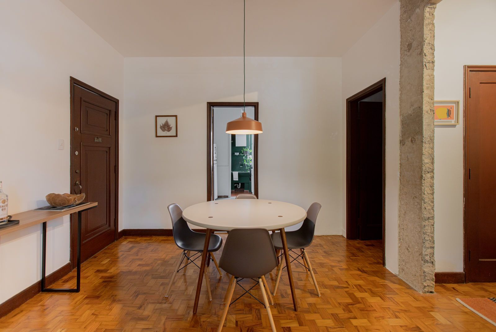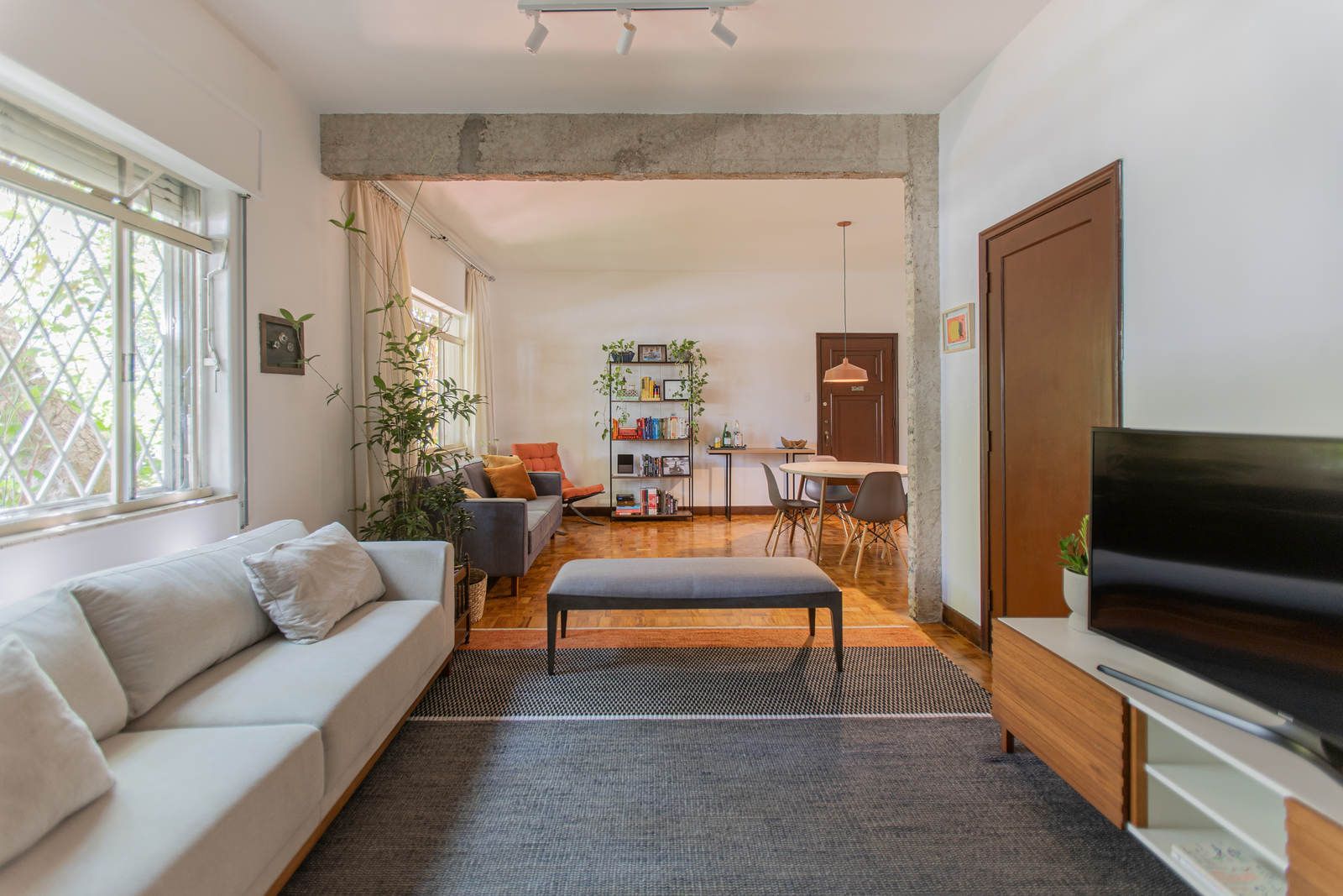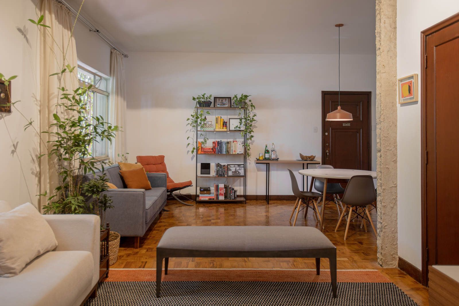 “Uma das paredes da sala foi descascada para ficar com os tijolos aparentes, criando um fundo para o piano. Os tijolos dessa demolição saíram inteiros e foram reutilizados em outro projeto nosso! Nos outros dois quartos, separamos o descanso do trabalho. O cômodo do meio virou o quarto, com cama e armários. Já a iluminação foi resolvida com uma peça desenhada por nós: uma eletrocalha pintada de branco e solta do teto serve como suporte de spots e lâmpadas tubulares, que oferecem uma luz mais intimista.”