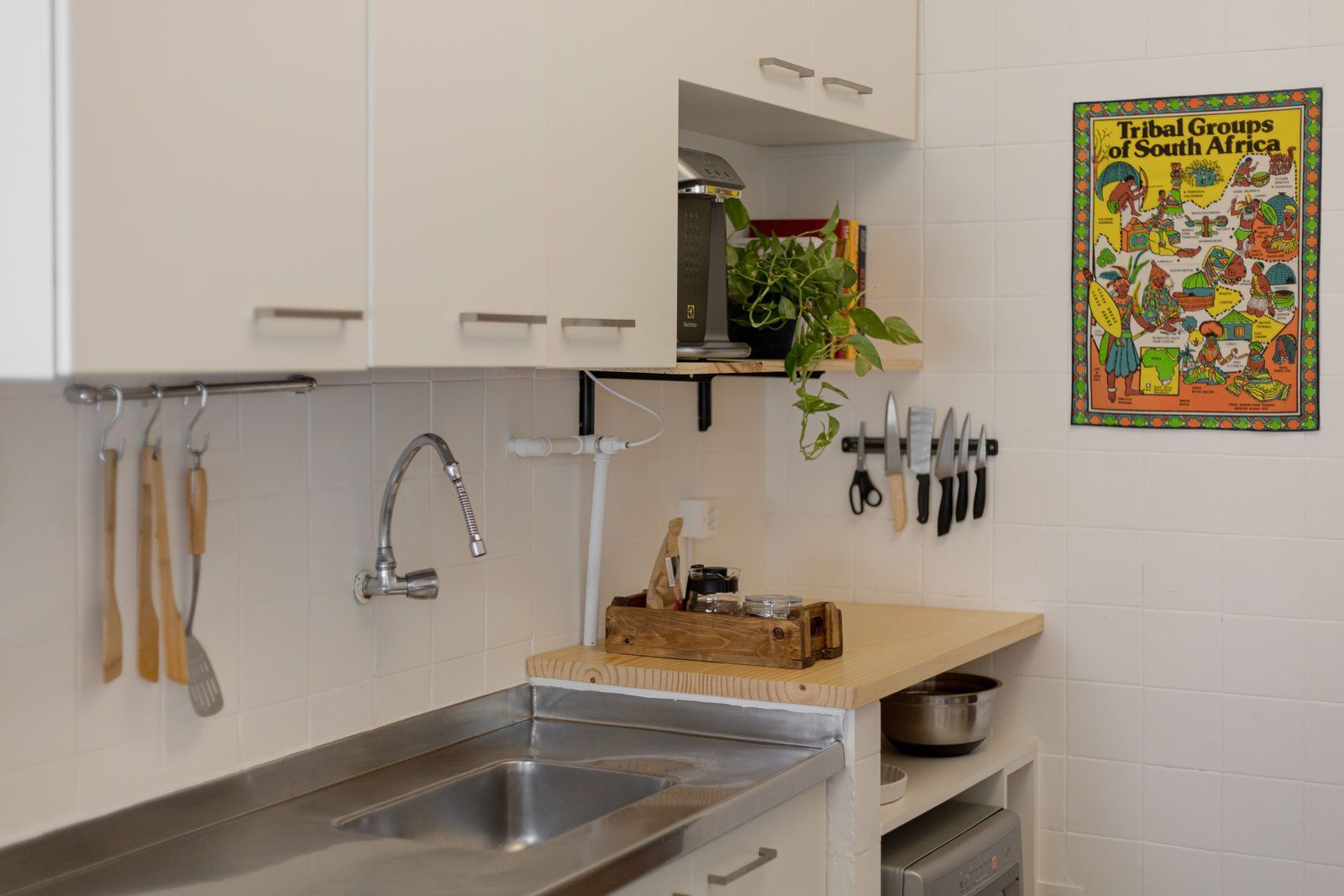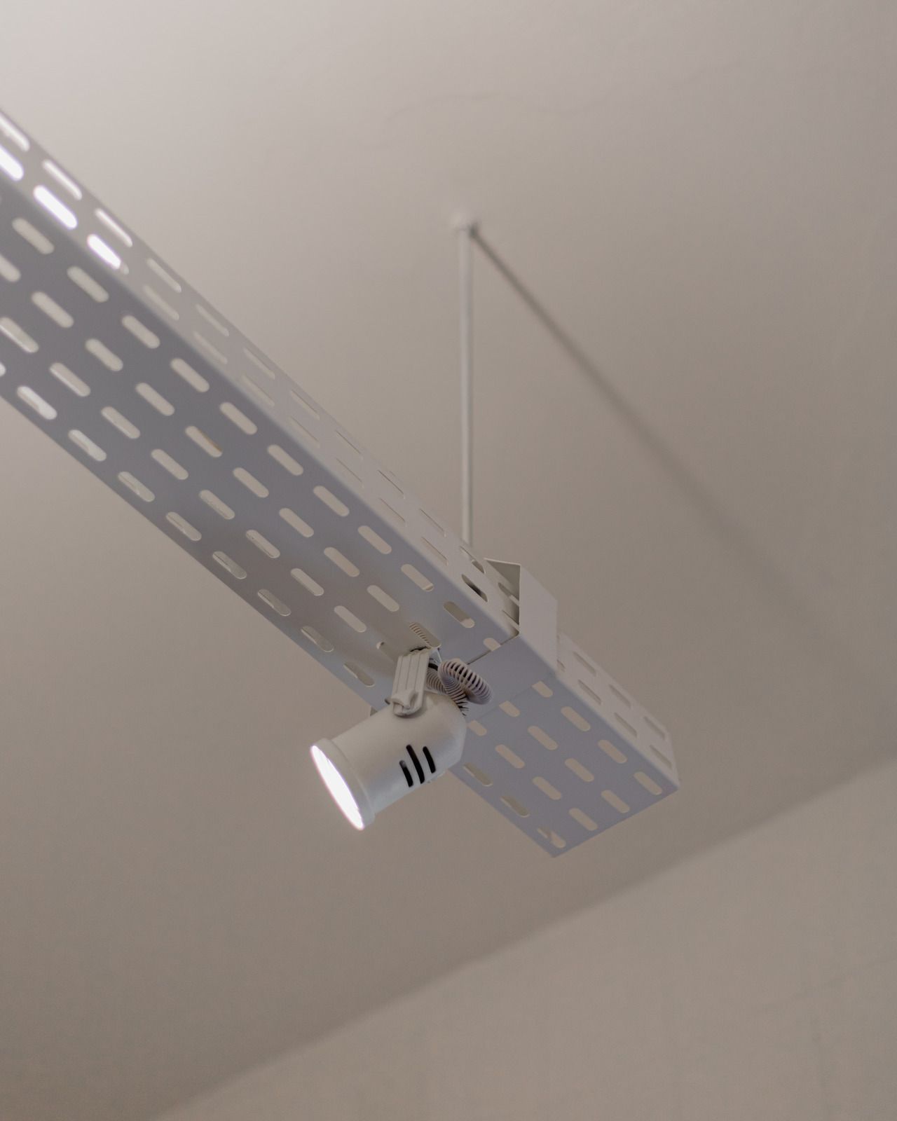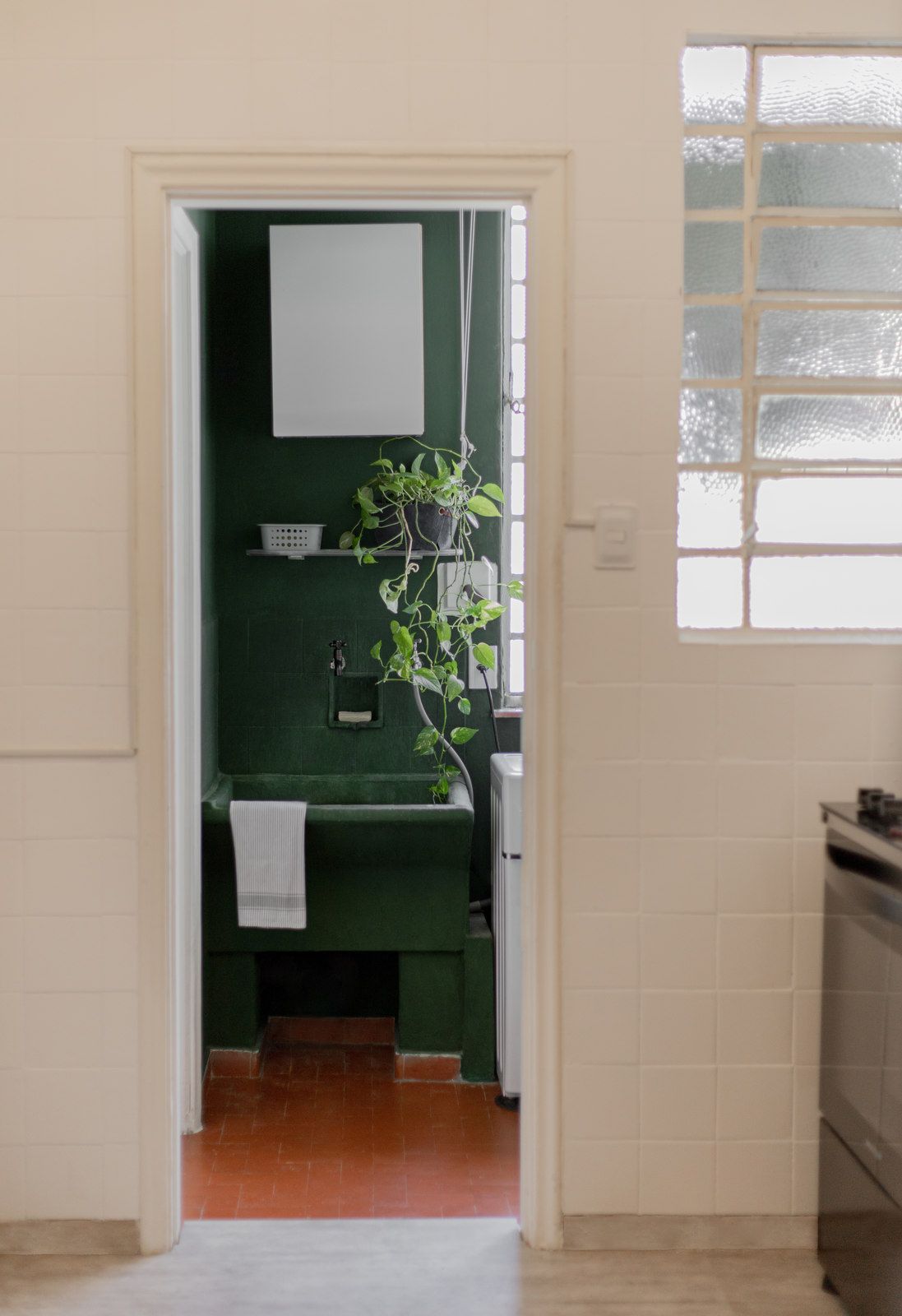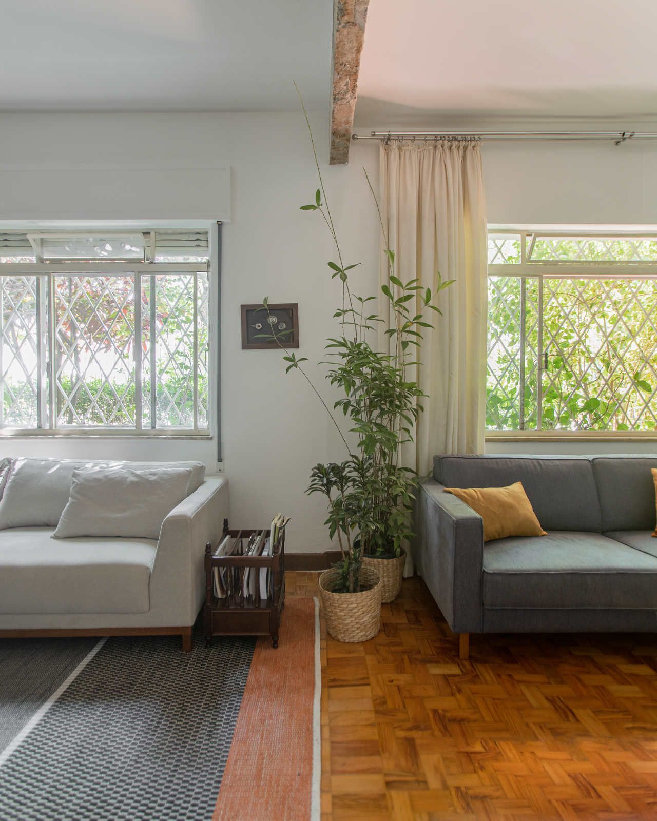 “Uma das paredes da sala foi descascada para ficar com os tijolos aparentes, criando um fundo para o piano. Os tijolos dessa demolição saíram inteiros e foram reutilizados em outro projeto nosso! Nos outros dois quartos, separamos o descanso do trabalho. O cômodo do meio virou o quarto, com cama e armários. Já a iluminação foi resolvida com uma peça desenhada por nós: uma eletrocalha pintada de branco e solta do teto serve como suporte de spots e lâmpadas tubulares, que oferecem uma luz mais intimista.”