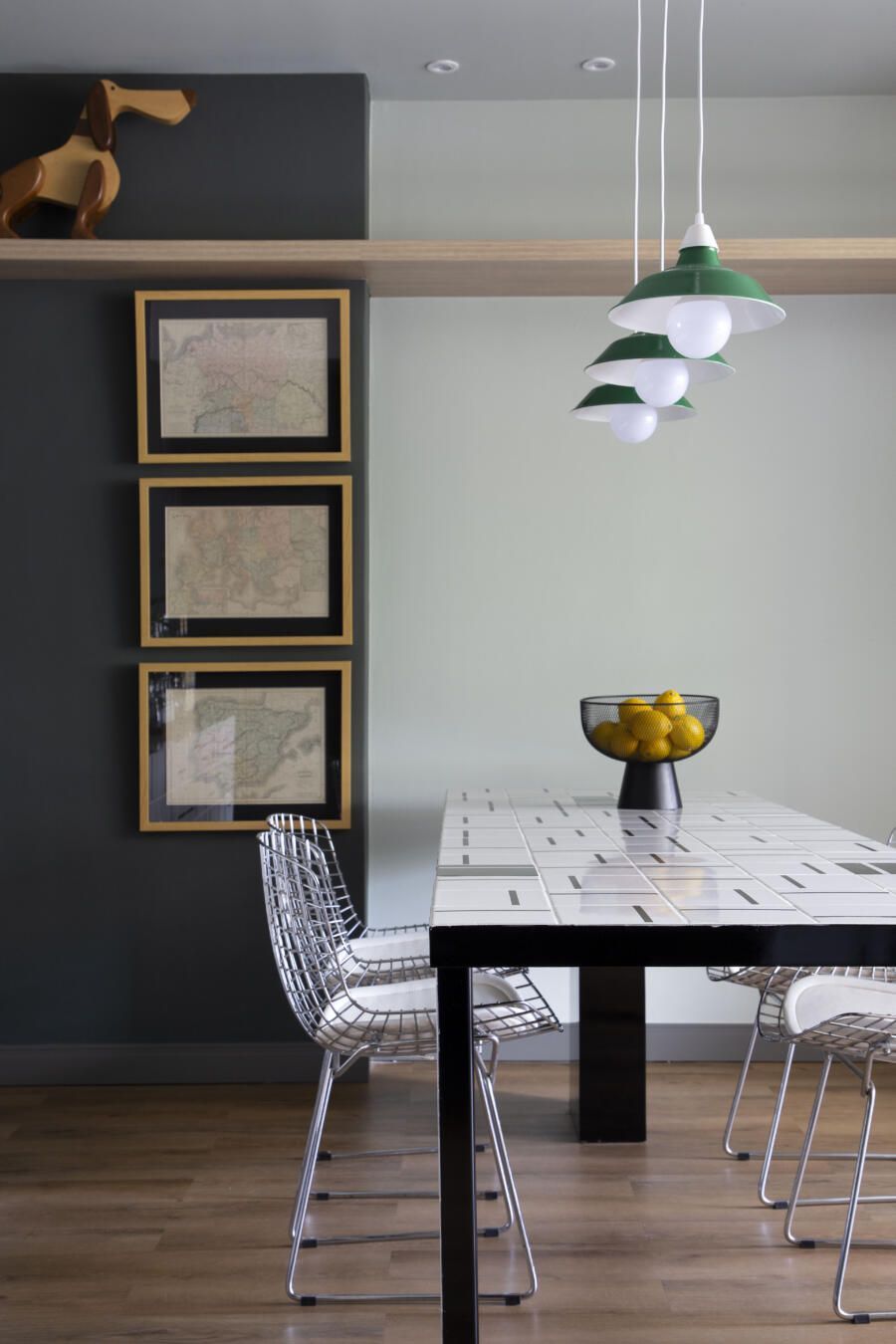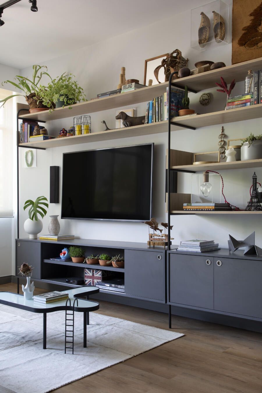 “Nos inspiramos principalmente na arquitetura nórdica, com destaque para a grande estante de ferro com madeira de visual bem leve, desenhada por nós. O móvel percorre toda a sala, acumulando diferentes funções (TV, biblioteca e louceiro) e fazendo o ambiente parecer mais alongado.”