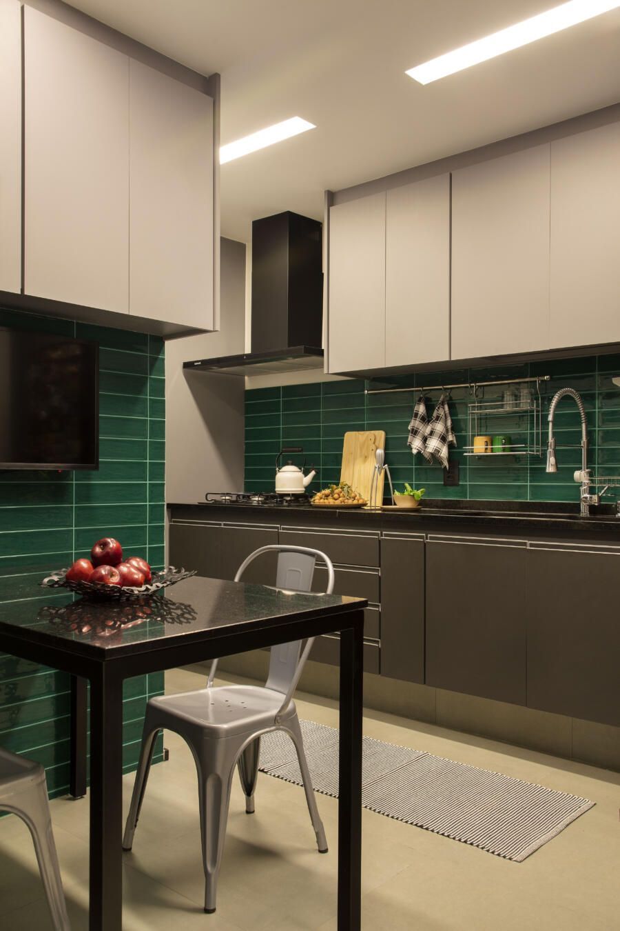 “Como o casal queria que a obra não fosse muito custosa, realizamos poucas modificações na planta do imóvel. Ampliamos a porta da cozinha para que ela ficasse mais integrada a sala, eliminamos a porta que separava a área íntima e ampliamos a área de serviço, dando espaço para uma despensa”