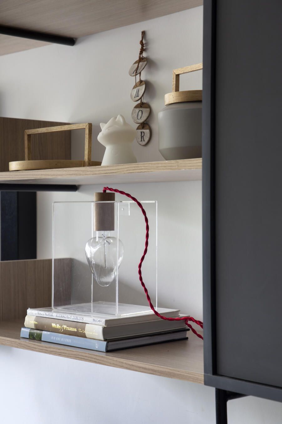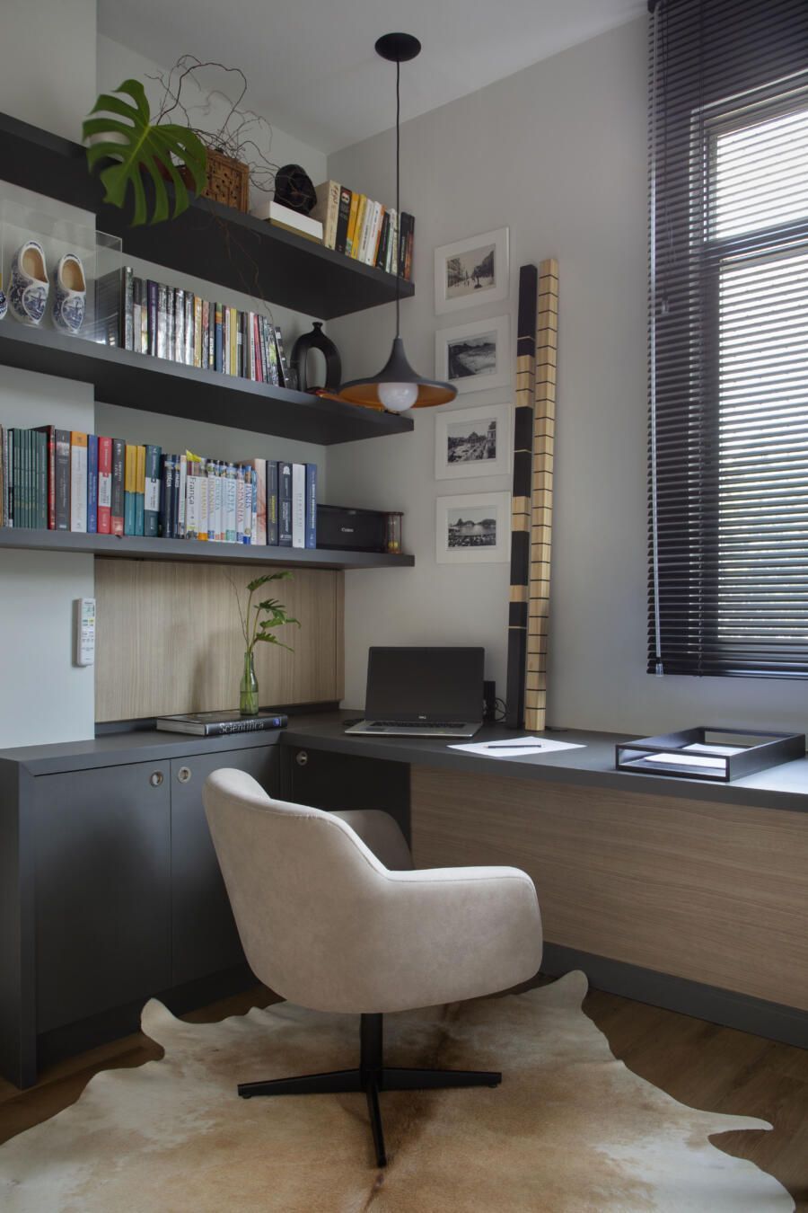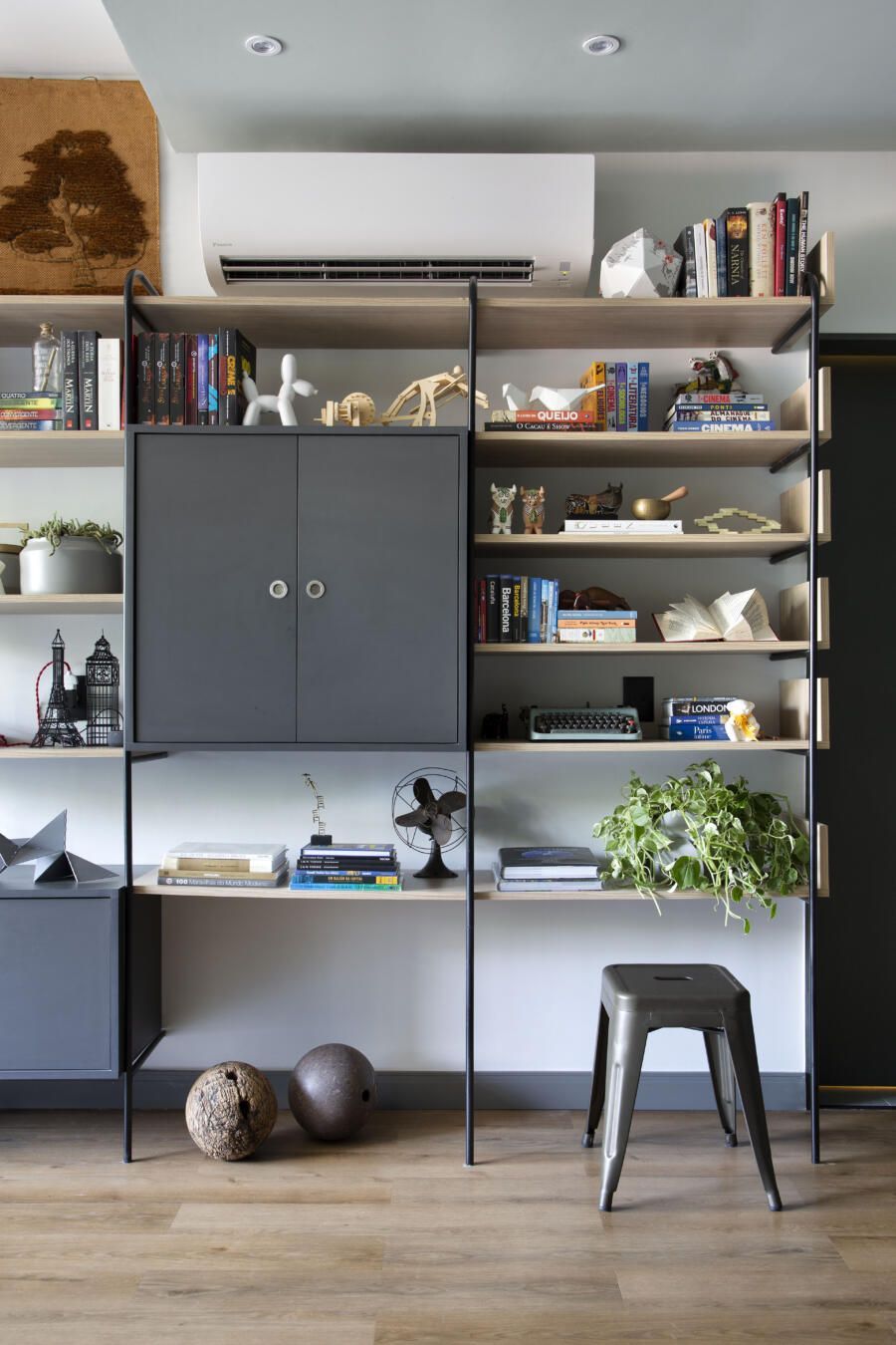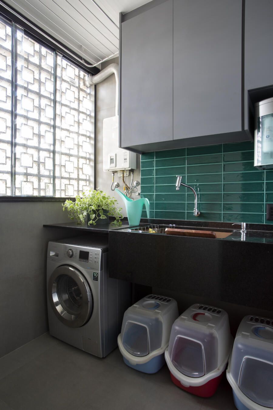 “Projetamos uma estante para os felinos interagirem na sala, e a área de serviço ganhou uma cuba-tanque com espaço embaixo para acomodar todas as caixas de areia. Vale ressaltar que o casal notou que o apartamento mais amplo e claro deixou os gatos muito mais felizes, impactando diretamente no humor e na sociabilidade deles. Então os felinos acabaram ficando mais carinhosos depois da mudança, e o mesmo vale para o próprio casal.”