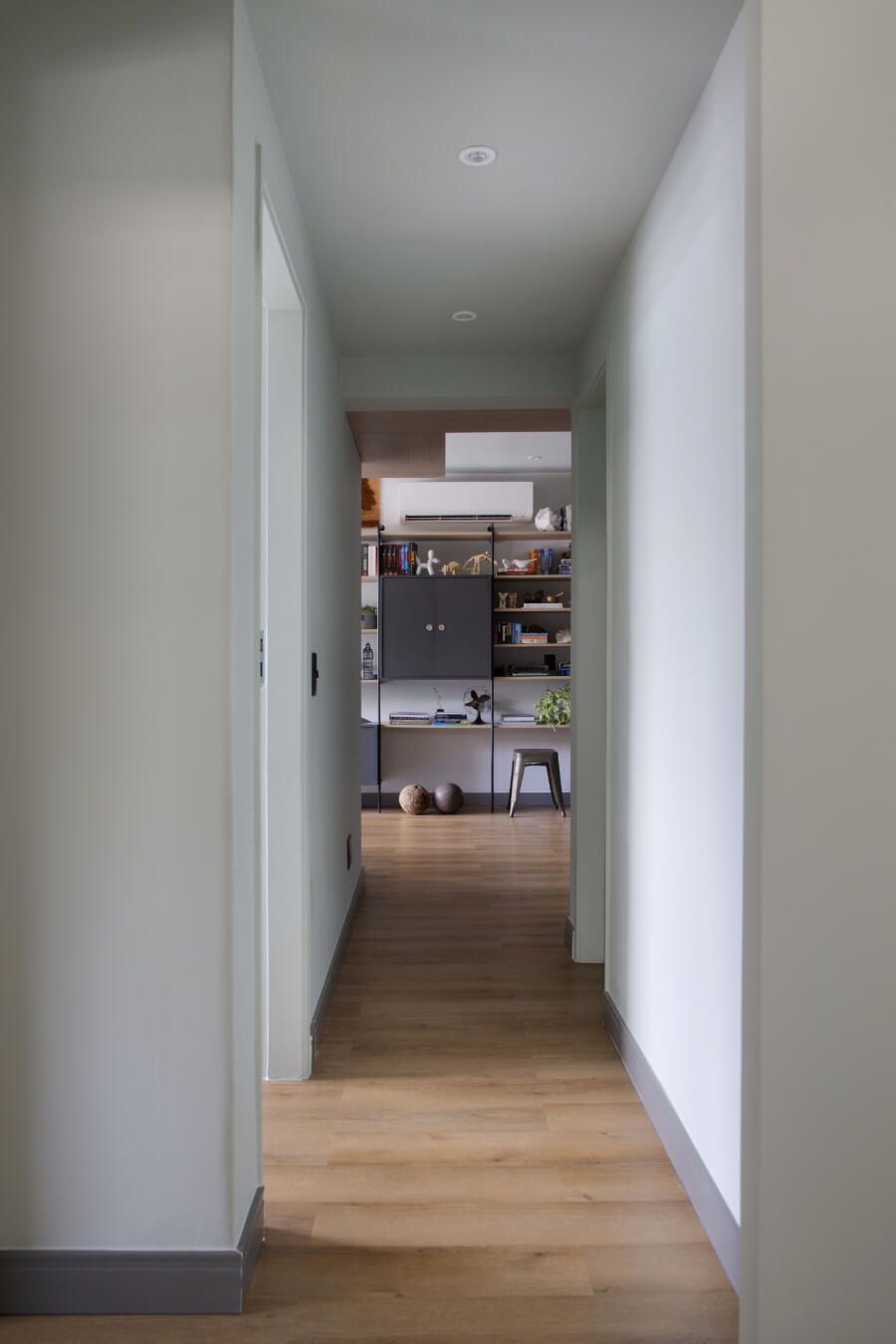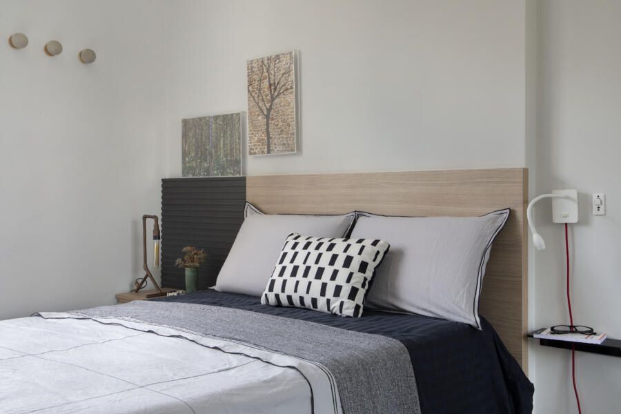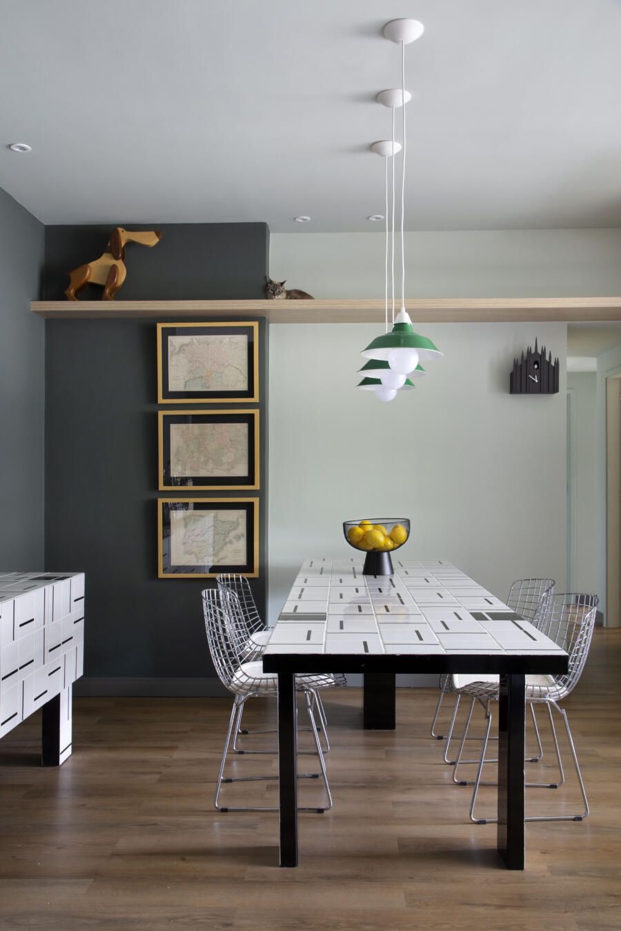 “Uma vez que o Wilson não queria nada branco, propusemos colocar um piso vinílico no padrão amadeirado por ter um custo acessível, ser de fácil execução e trazer visualmente a madeira para o projeto. Também acrescentamos alguns tons de cinzas e verdes, que se espalham pelos ambientes e imprimem um efeito color-block interessante.”