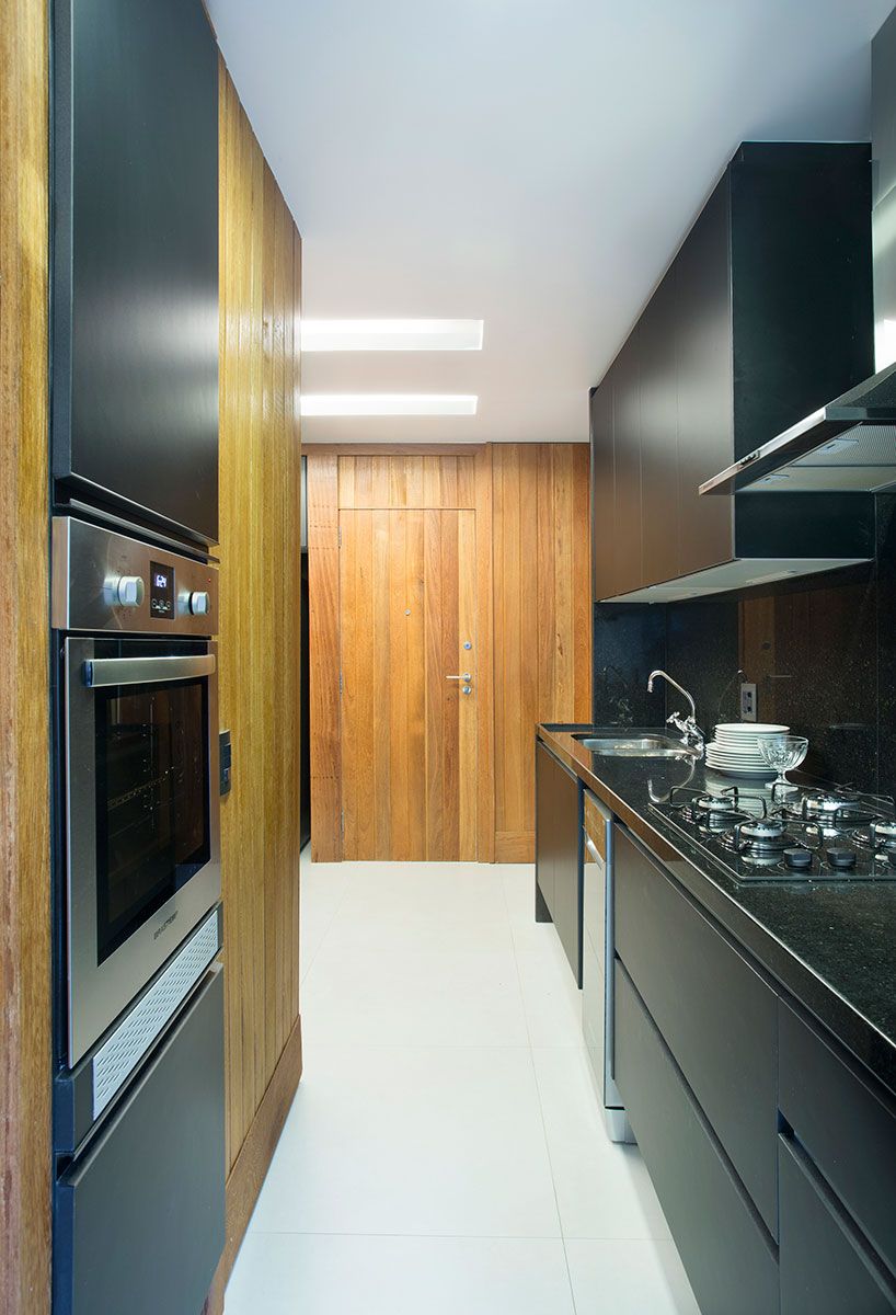 Após a reforma, o apartamento ganhou sala ampla integrada ao escritório que pode ser transformado em suíte de hóspedes. A varanda também foi incorporada ao living. A antiga copa foi incorporada à cozinha, que ganhou dimensões proporcionais ao living. A área de serviço tem continuidade visual com a cozinha. O apartamento conta ainda com a suíte do proprietário, compacta como assim desejava ele. O box do banheiro da suíte ganhou parede de vidro translúcido e uma fonte de luz natural durante o dia. As dependências de serviço foram mantidas a pedido do cliente.