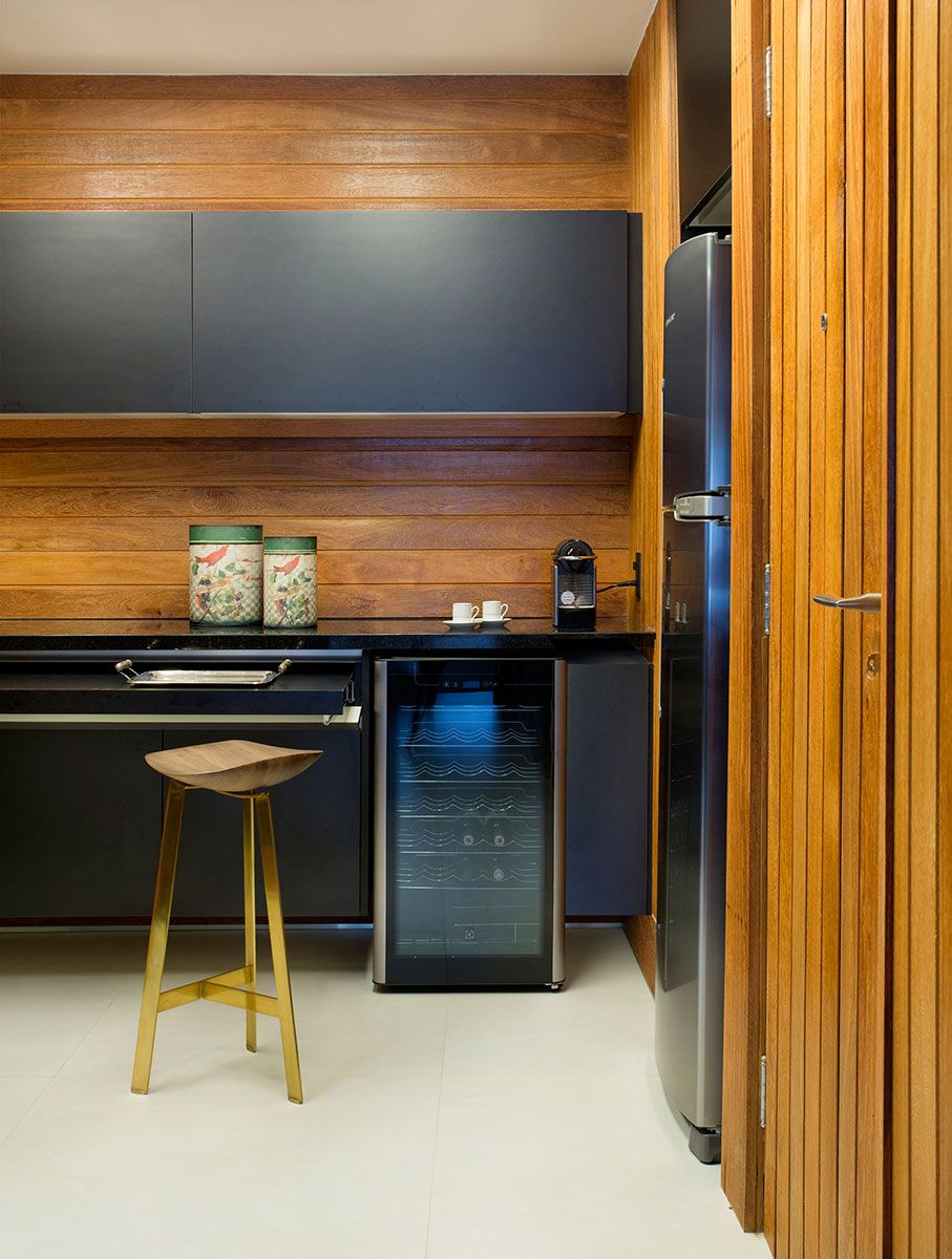 Tendo a sustentabilidade em mente, o projeto de marcenaria teve o grande desafio extra de aproveitar vários elementos de mobiliário do cliente, portas da antiga varanda e até mesmo o antigo piso da sala de estar do apartamento na composição dos novos armários, estantes e forração de paredes.