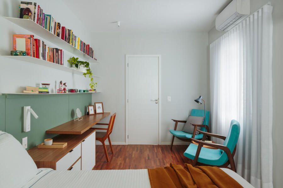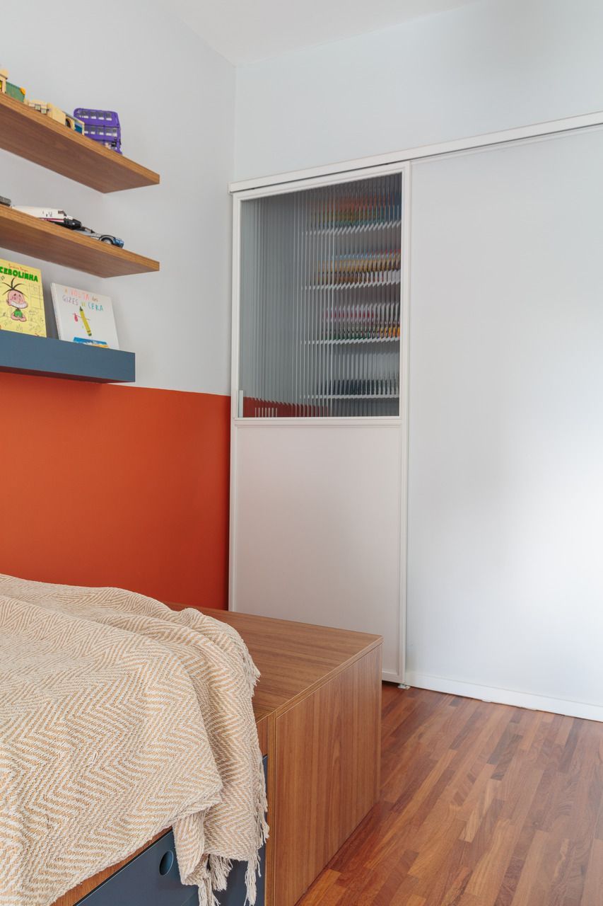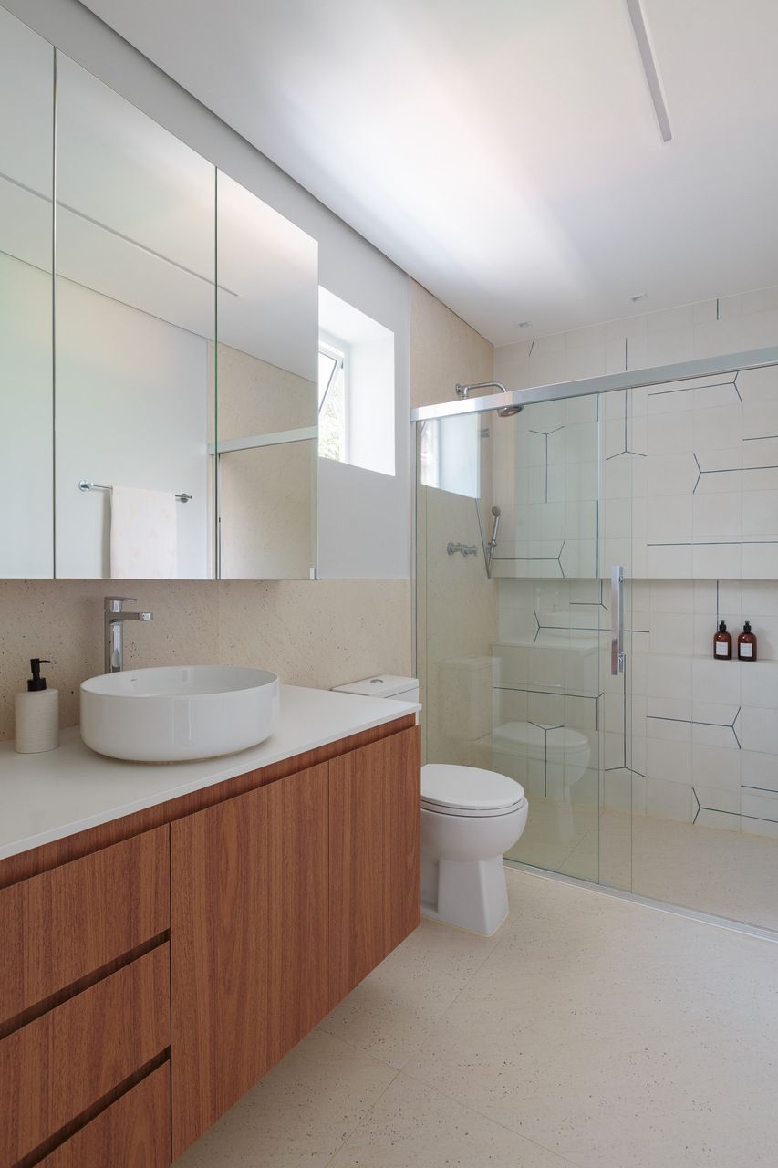No andar superior, o piso de madeira foi restaurado, mantendo a identidade original da casa. O quarto do filho foi reformado para ter mais espaço para estudo e lazer, enquanto um novo closet ajudou a liberar o ambiente. O banheiro que atende ao quarto e também ao de hóspedes recebeu acabamentos neutros, garantindo um visual atual por mais tempo.