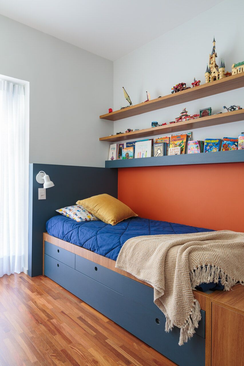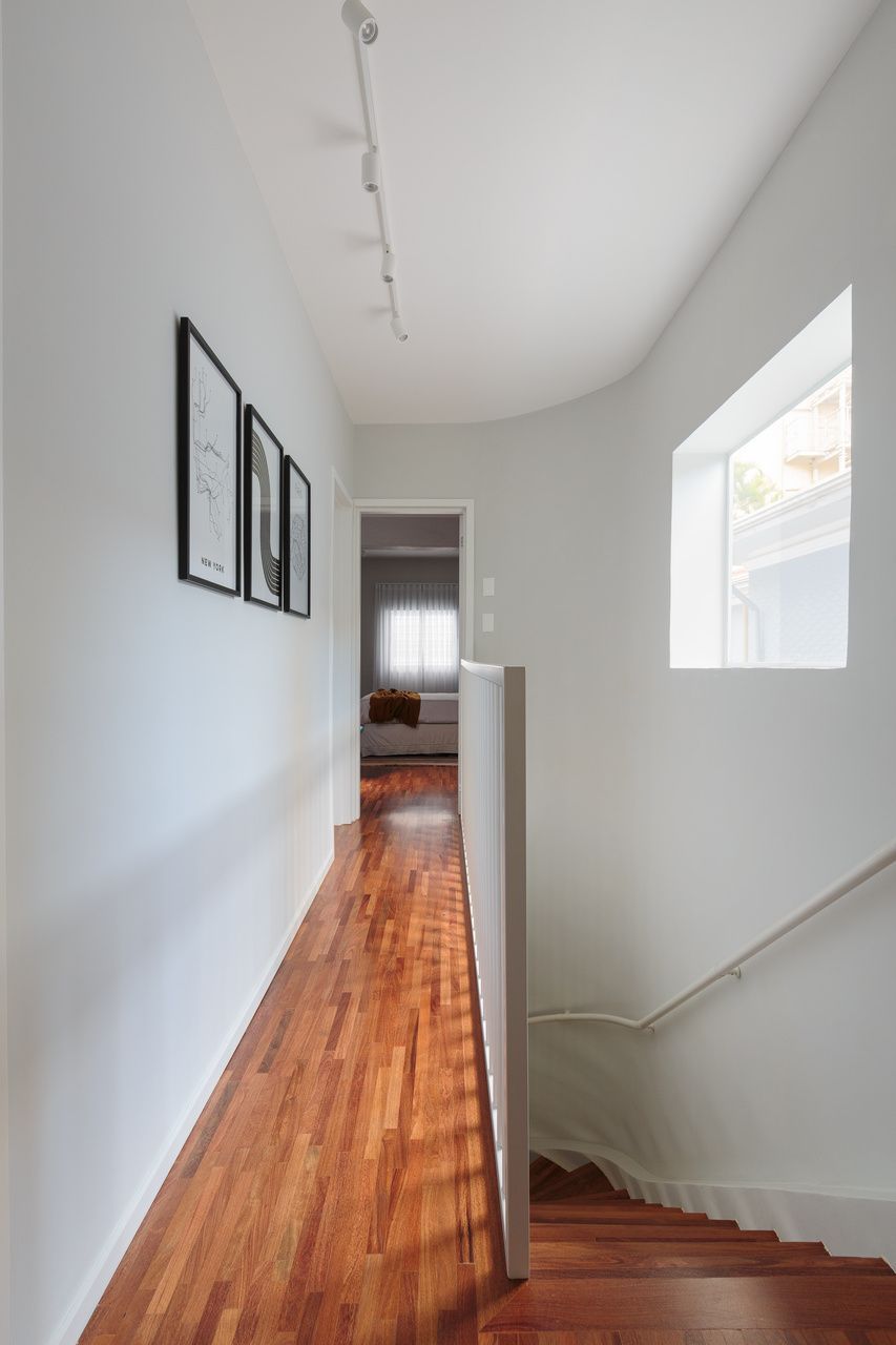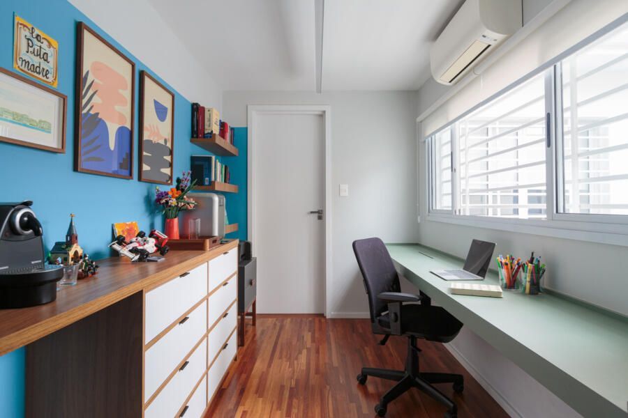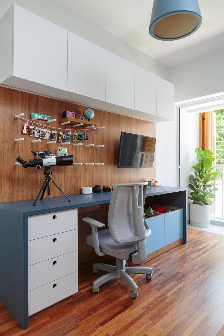 No andar superior, o piso de madeira foi restaurado, mantendo a identidade original da casa. O quarto do filho foi reformado para ter mais espaço para estudo e lazer, enquanto um novo closet ajudou a liberar o ambiente. O banheiro que atende ao quarto e também ao de hóspedes recebeu acabamentos neutros, garantindo um visual atual por mais tempo.