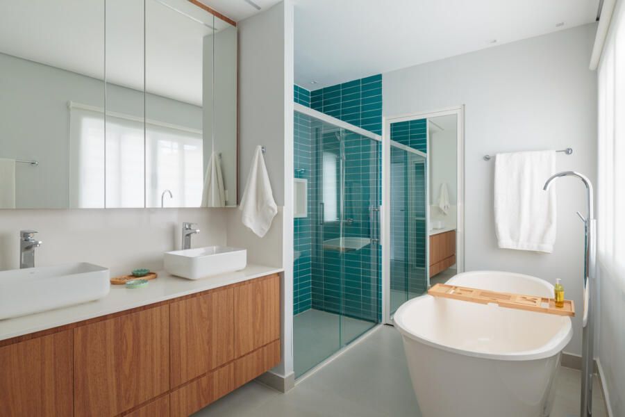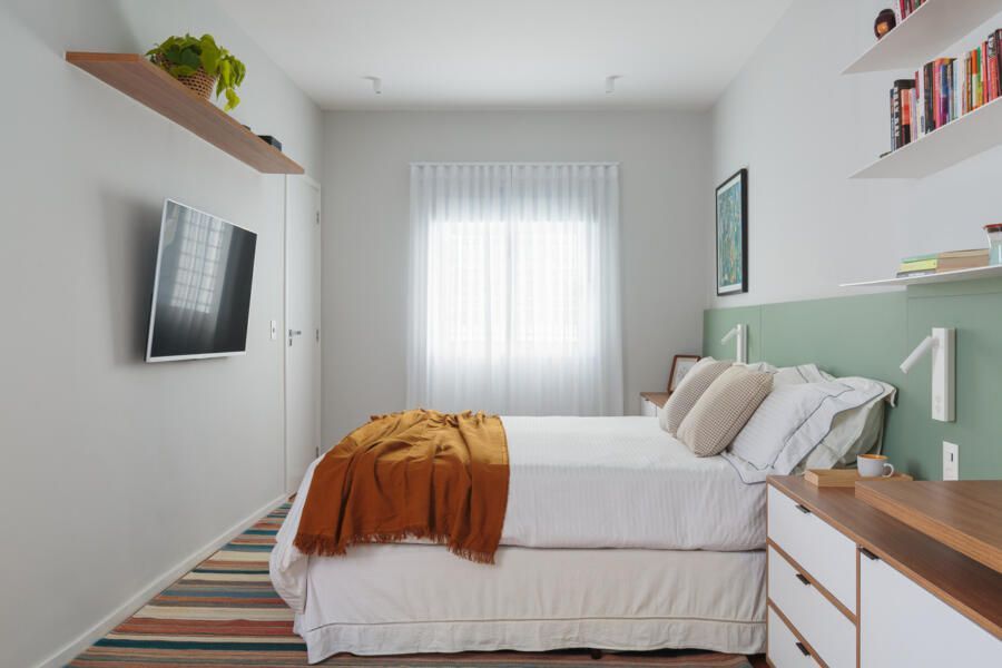O quarto do casal foi reorganizado para acomodar, além da cama, uma área de trabalho e uma penteadeira. A marcenaria foi planejada para integrar esses elementos sem comprometer a circulação. O banheiro também foi renovado, aproveitando a banheira já existente e adicionando soluções que garantem mais praticidade no dia a dia.