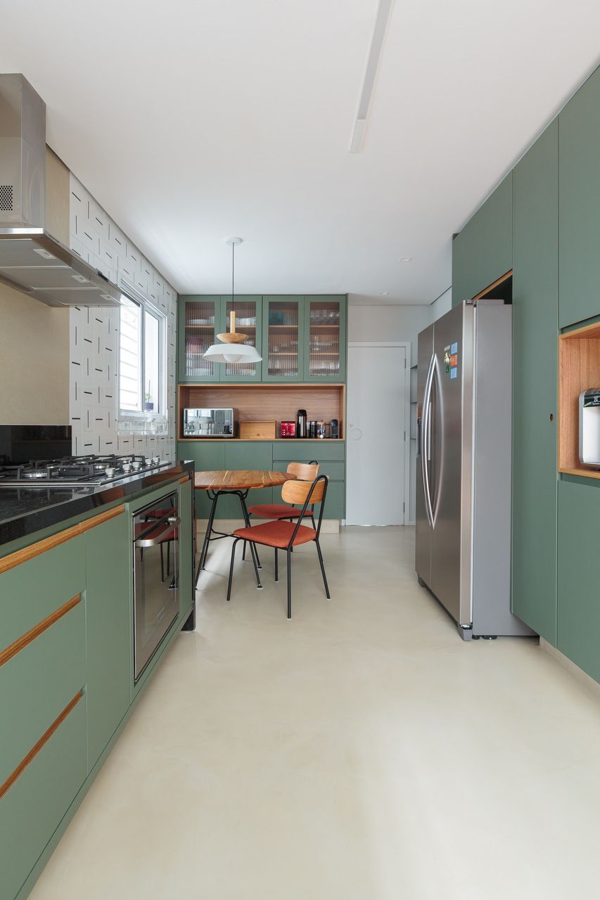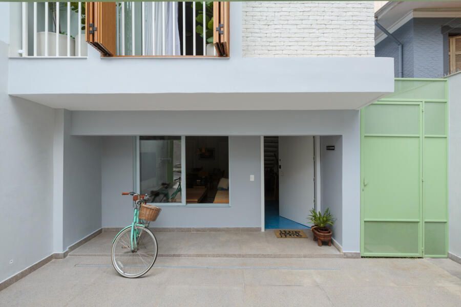 A escolha dos materiais foi pensada para trazer mais calor e personalidade. O piso em tom terroso e os detalhes em verde na marcenaria deram um toque especial aos ambientes. Na sala, um banco de concreto moldado no local trouxe mais opções de uso para o espaço. O piso monolítico, presente na sala, lavabo e cozinha, ajudou a criar uma sensação de continuidade, deixando os ambientes mais harmônicos. Já na entrada da casa, o destaque fica por conta do piso colorido, que dá mais vida ao espaço.