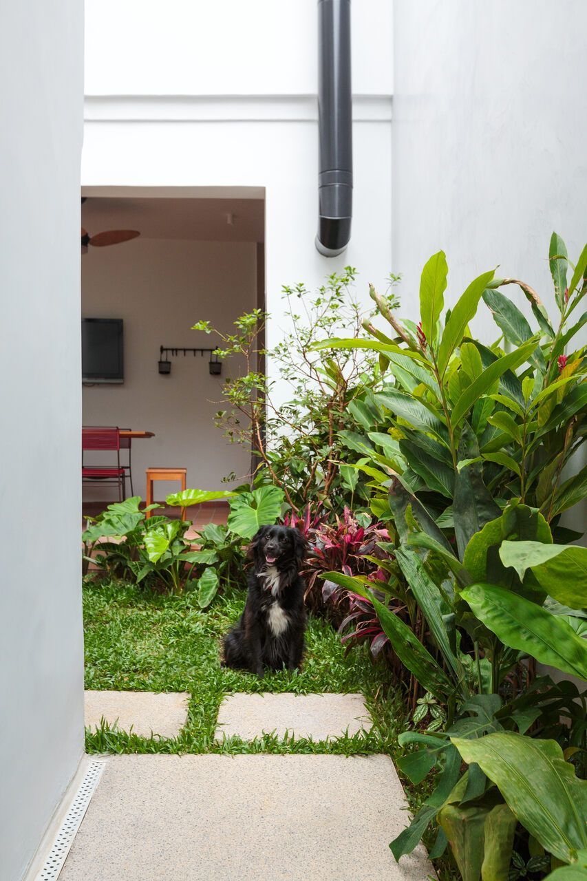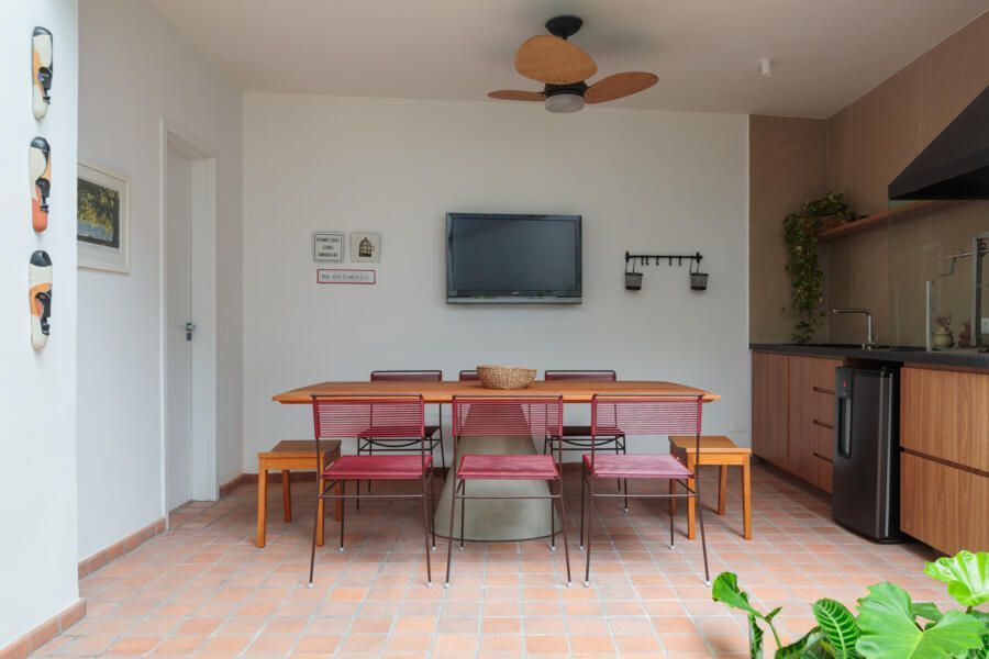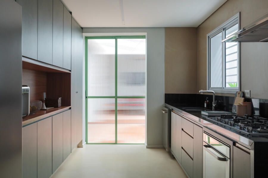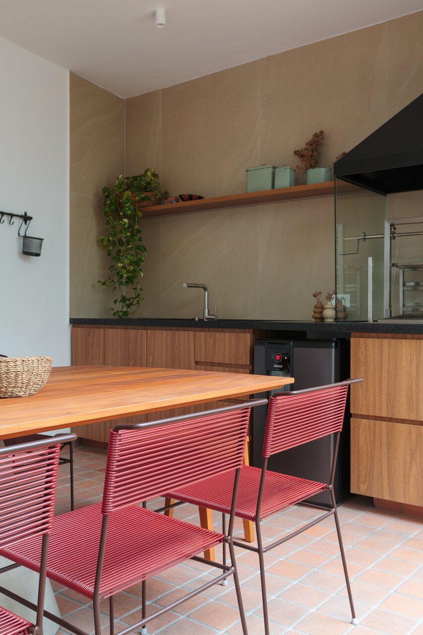 A principal mudança aconteceu no pavimento térreo, onde a cozinha foi reposicionada para se conectar melhor ao quintal. Antes fechado e pouco utilizado, o espaço externo ganhou um novo acesso, permitindo mais entrada de luz natural e aumentando a circulação entre os ambientes. Um antigo depósito deu lugar a uma nova área para receber amigos e família, enquanto o gramado deixou o quintal mais agradável.