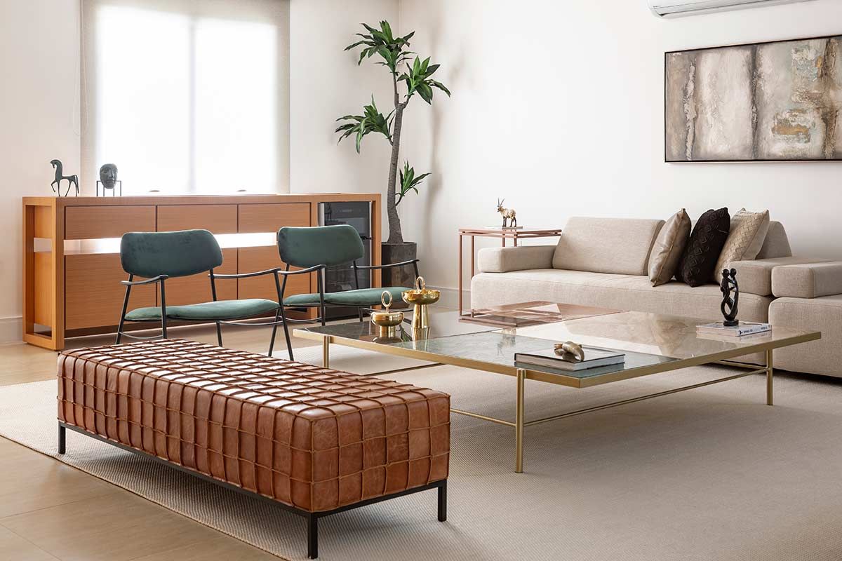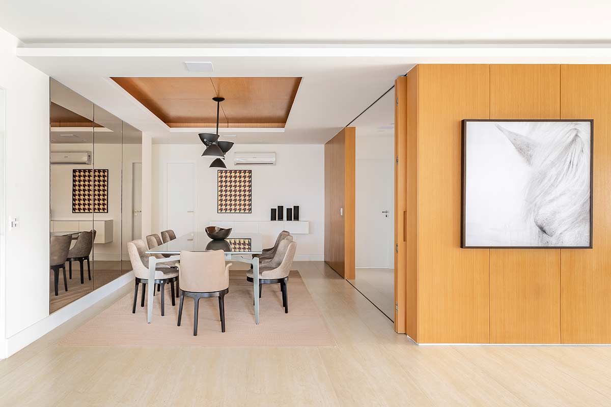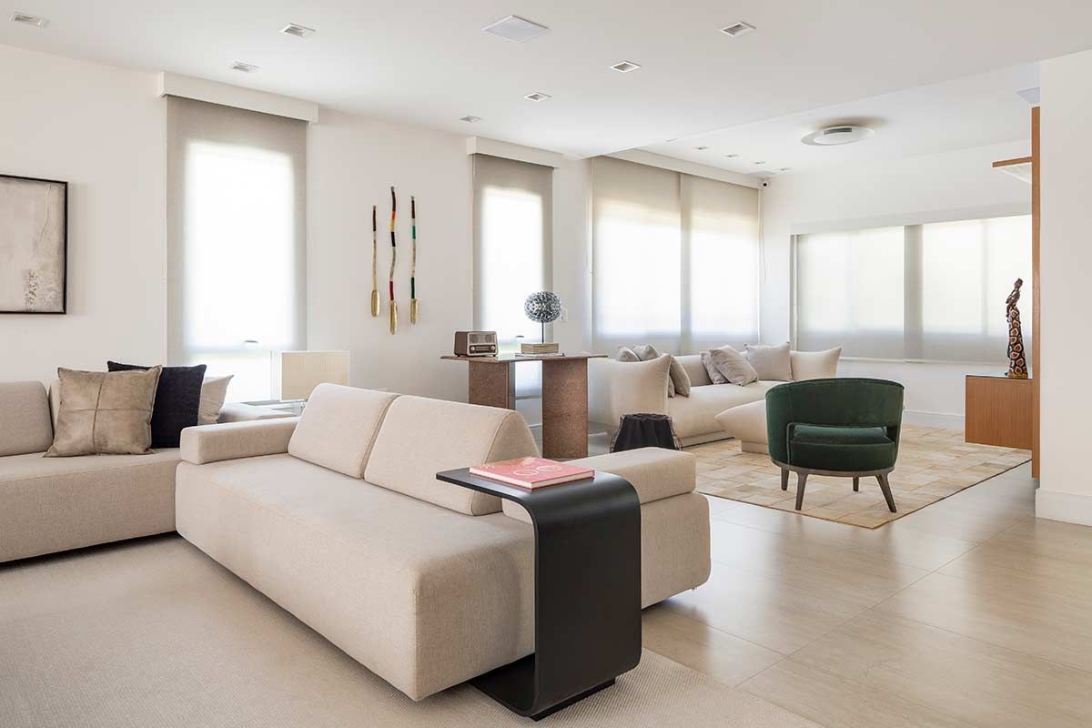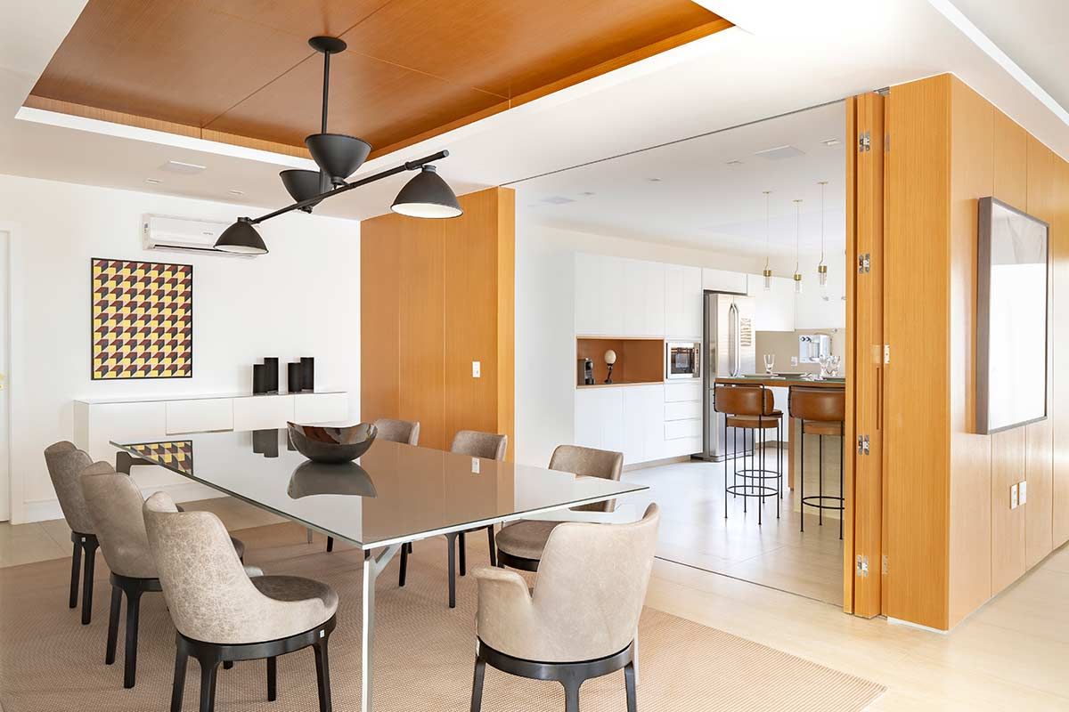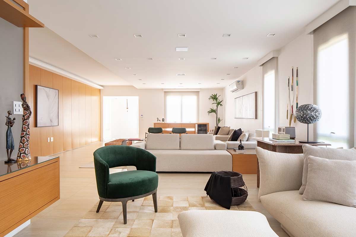 Entre os pedidos do casal estavam a valorização da luz natural, e uma área social ampla e prática para receber. Então, integramos as salas de jantar, estar e TV, para eles recepcionarem os amigos e familiares em um lugar confortável e atemporal.