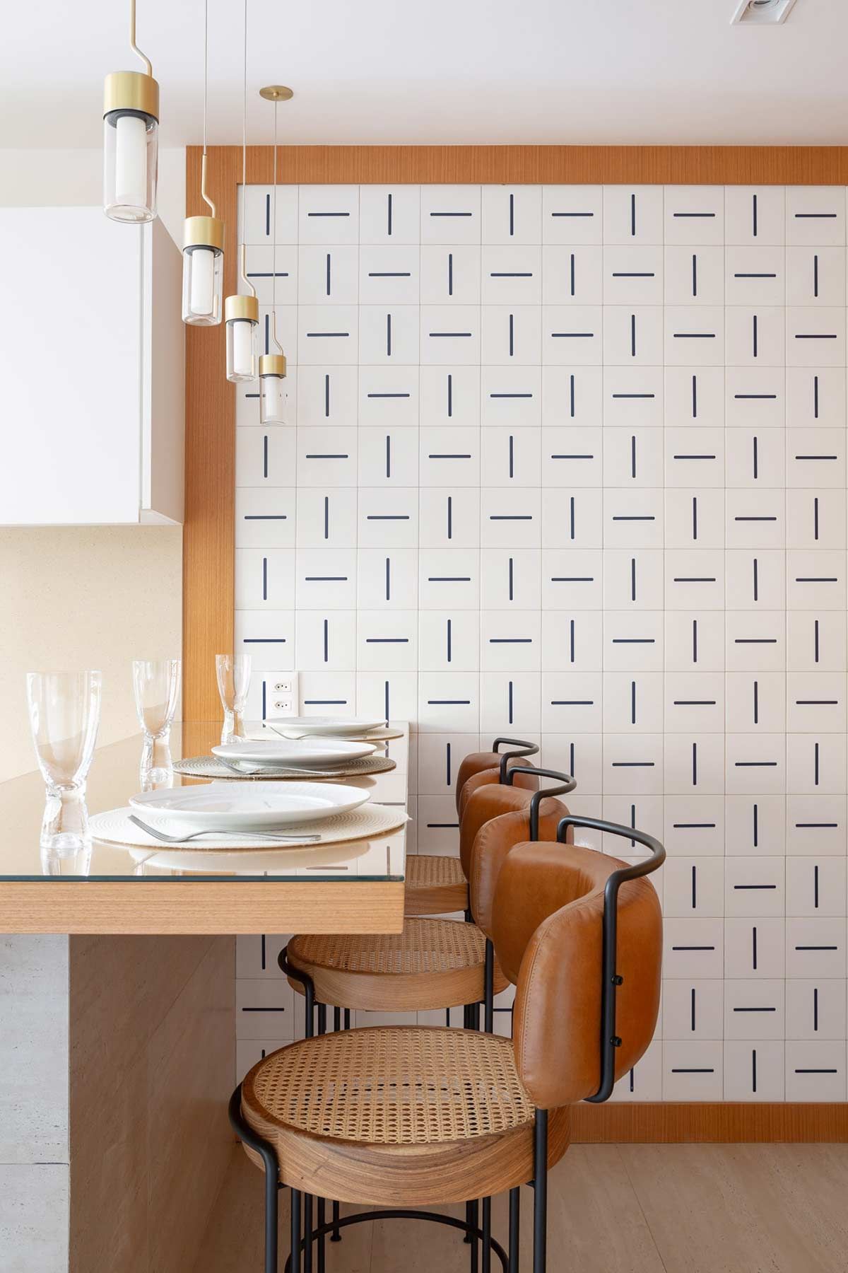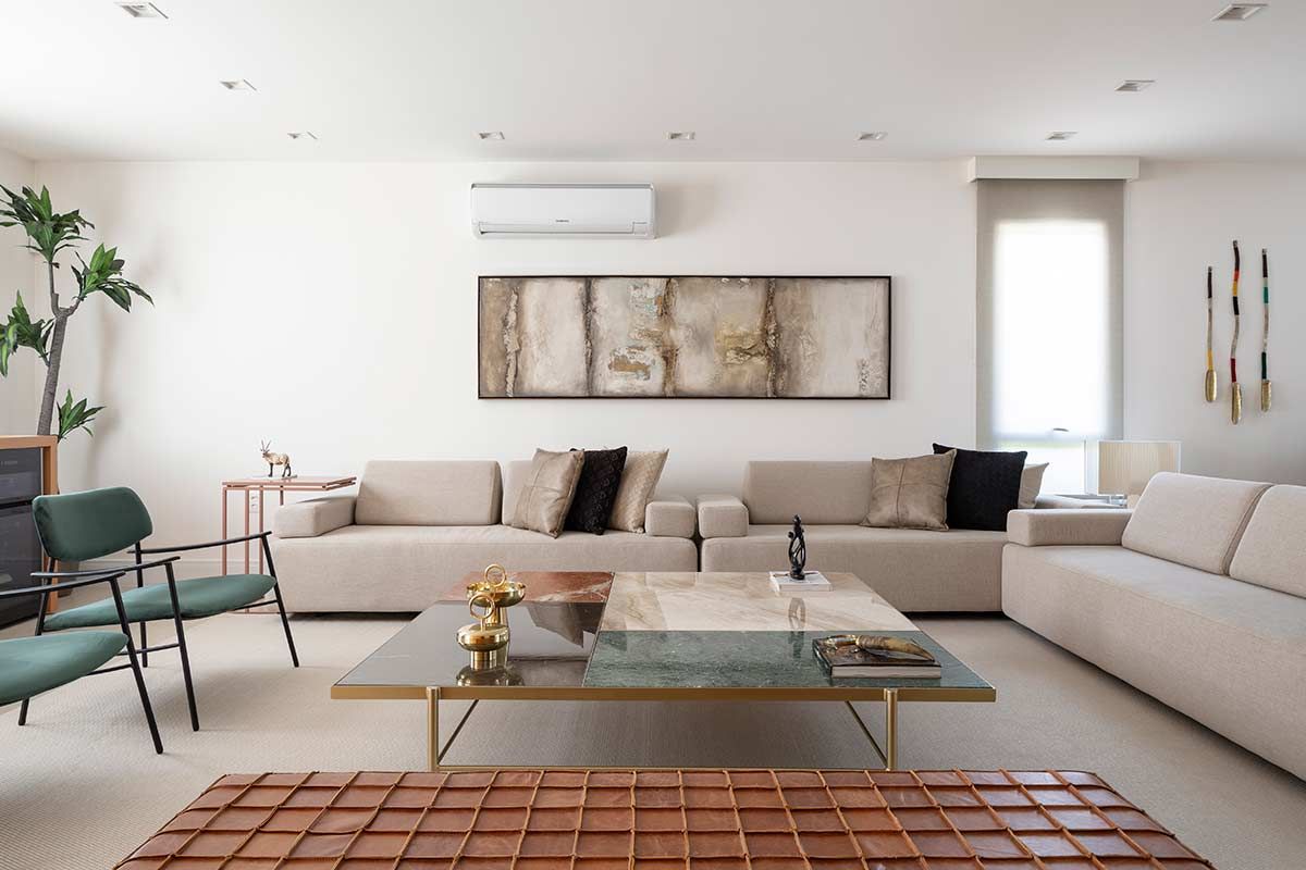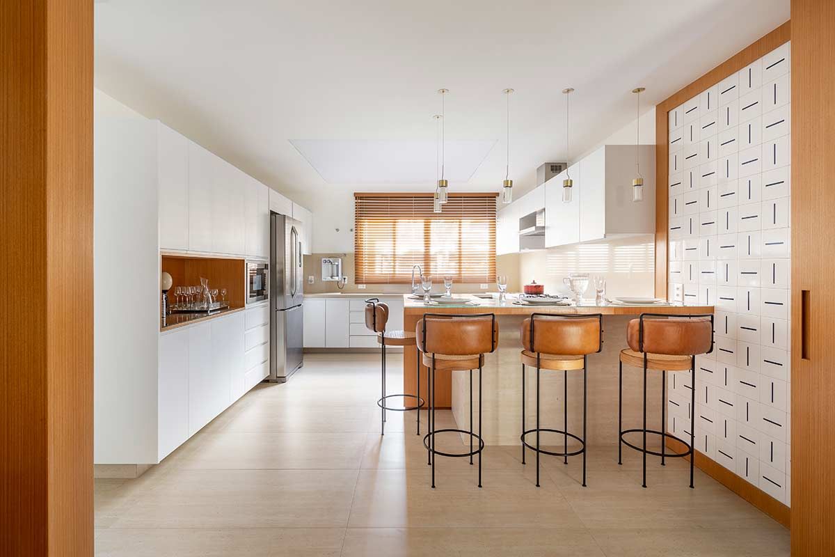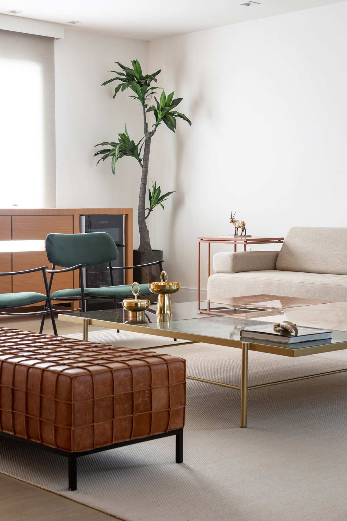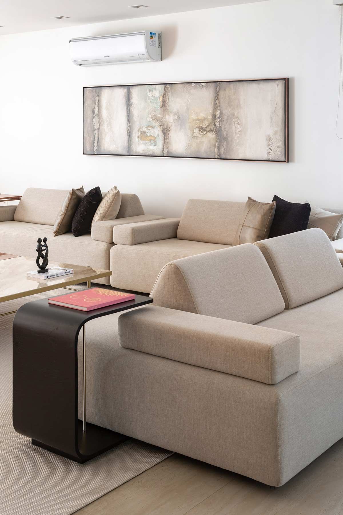 Entre os pedidos do casal estavam a valorização da luz natural, e uma área social ampla e prática para receber. Então, integramos as salas de jantar, estar e TV, para eles recepcionarem os amigos e familiares em um lugar confortável e atemporal.
