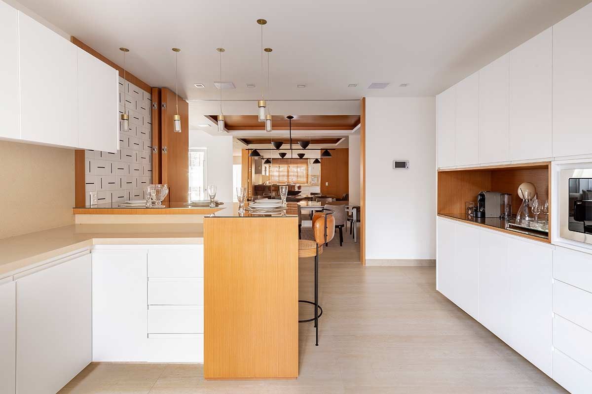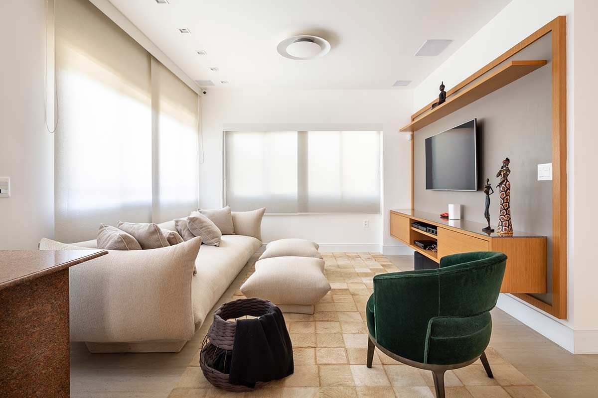 O principal desafio da obra foram os problemas prévios que a residência possuía, como a infiltração pelo solo no piso de madeira, que levantou algumas placas, necessitando de correção rápida para que a reforma prosseguisse tranquilamente. Seguindo como premissa a integração, o aconchego e atemporalidade, a decoração conta com técnicas de continuidade de acabamentos no piso, parede e teto; com marcenaria inteligente através de painéis que podem ser movimentados de acordo com o uso; e por fim, o uso do mobiliário solto como aliado para setorizar os cômodos. O resultado traz um lar versátil e acolhedor, bem como a família sonhava.