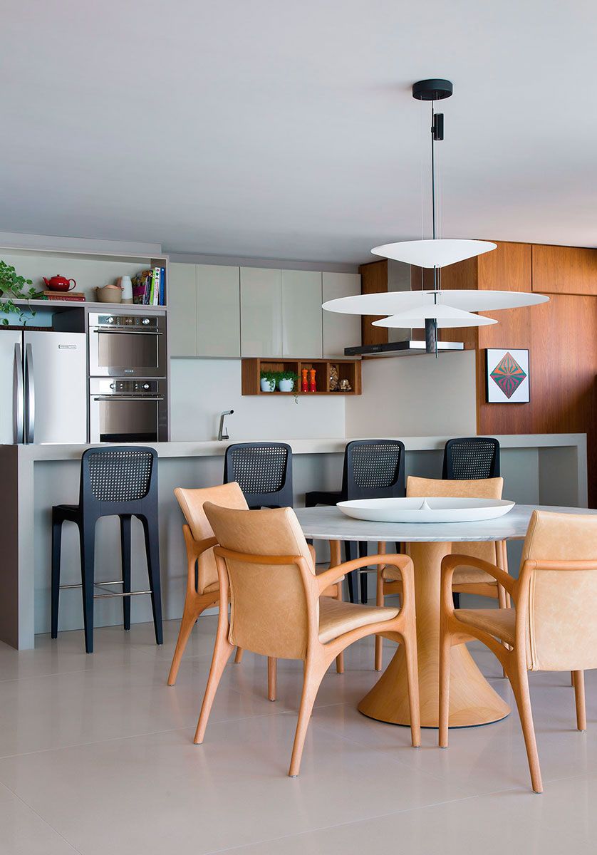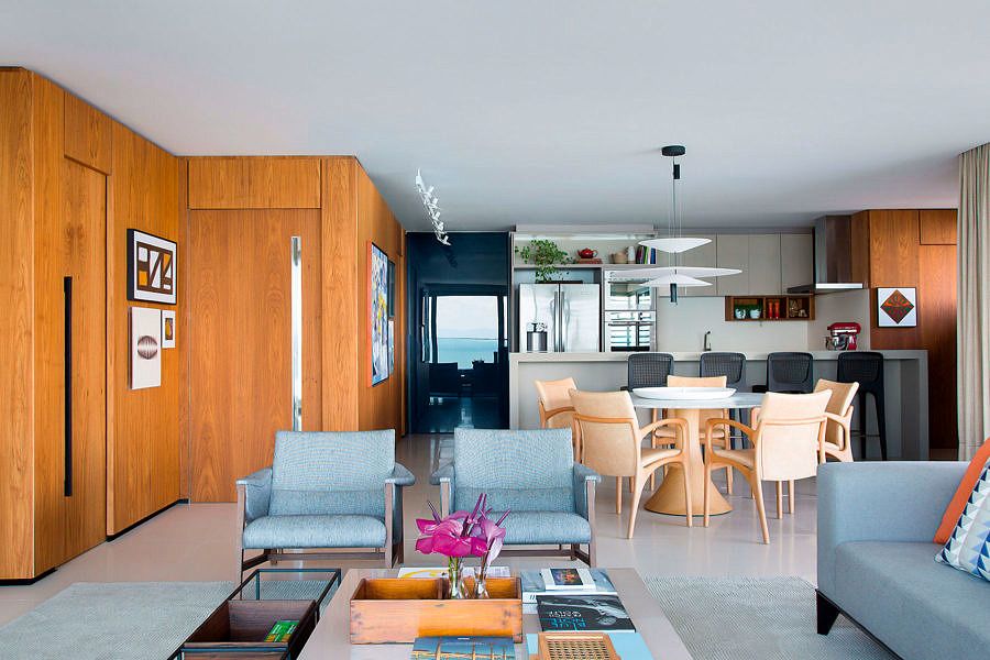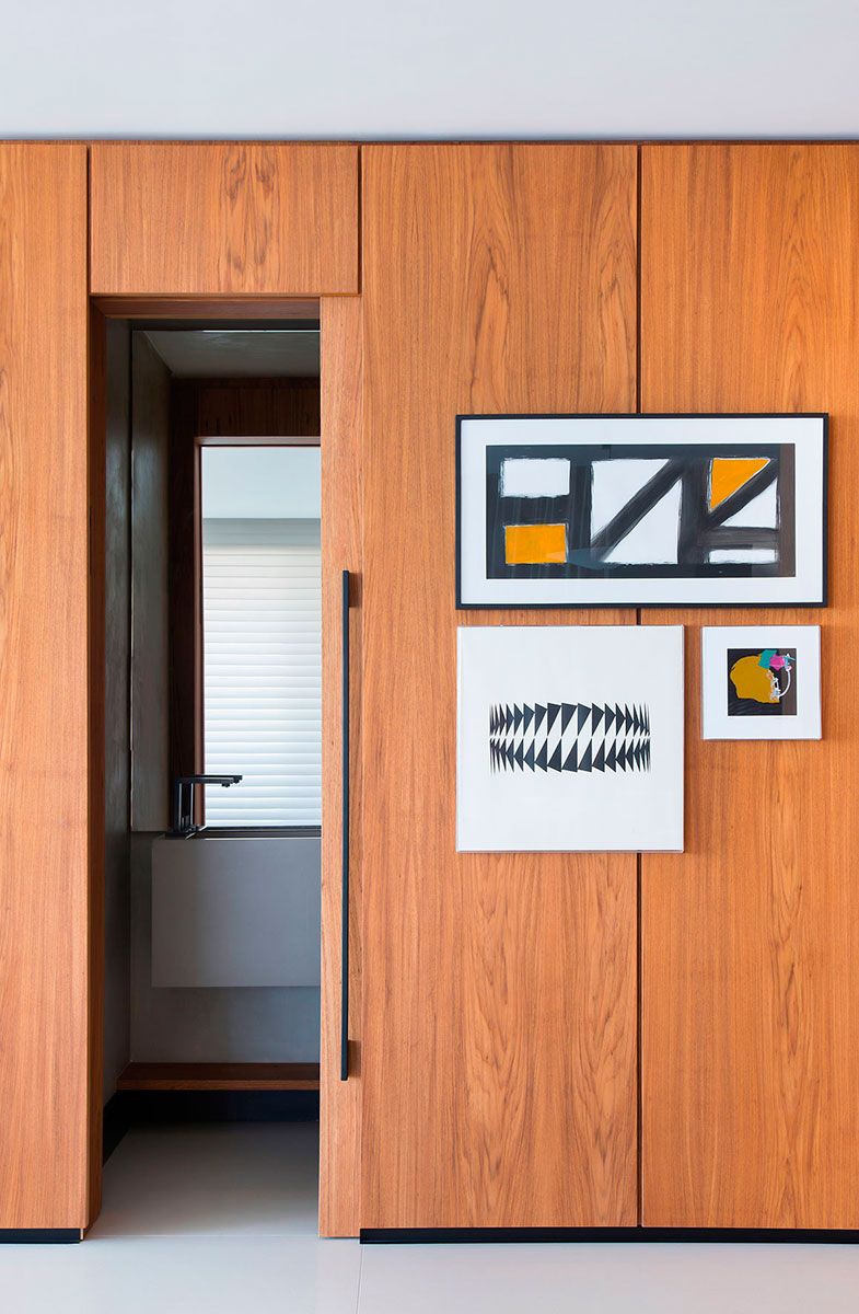 A cozinha e o living são ambientes integrados do apartamento, interligados por um corredor amadeirado. À direita, o decór é incrementado com quadros de Hércules Barsotti, Amilcar de Castro e Manabu Mabe. Ao fundo, a bancada do lavabo 01é esculpida em Corian.