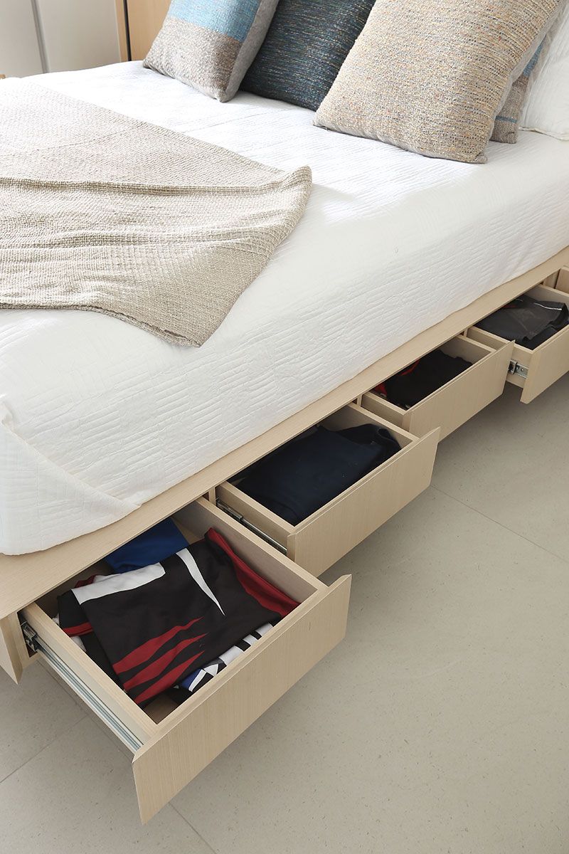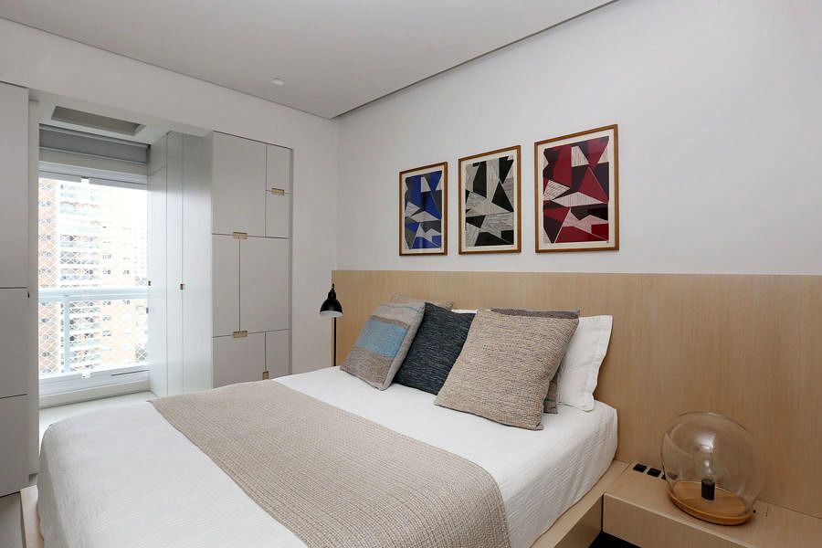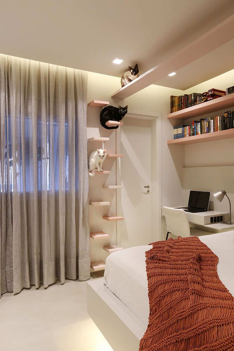 No quarto da filha foi criada uma marcenaria interativa para os gatos com escadas, caminhas e passarelas para eles se divertirem. E na suíte máster, armário era um problema, então a varanda foi integrada ao quarto criando um closet amplo e usando esses armários para criar uma área separada para a condensadora do ar condicionado.