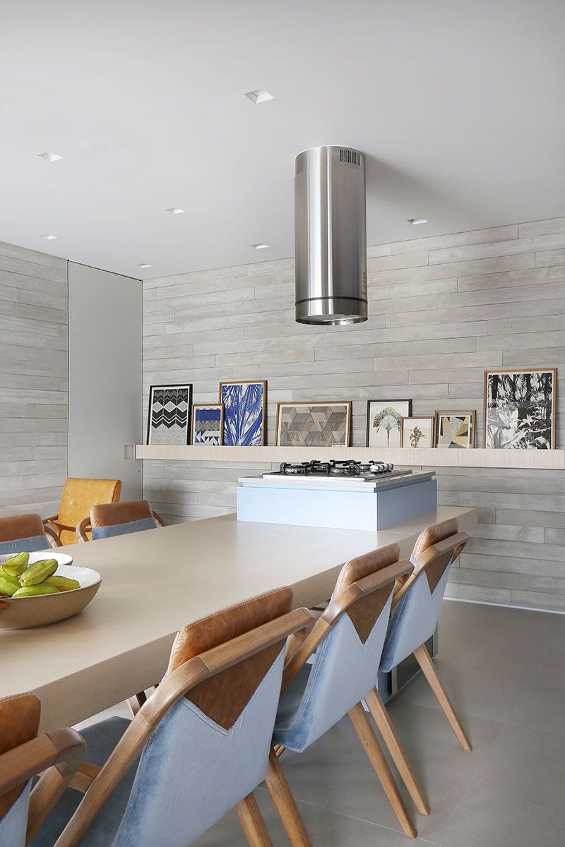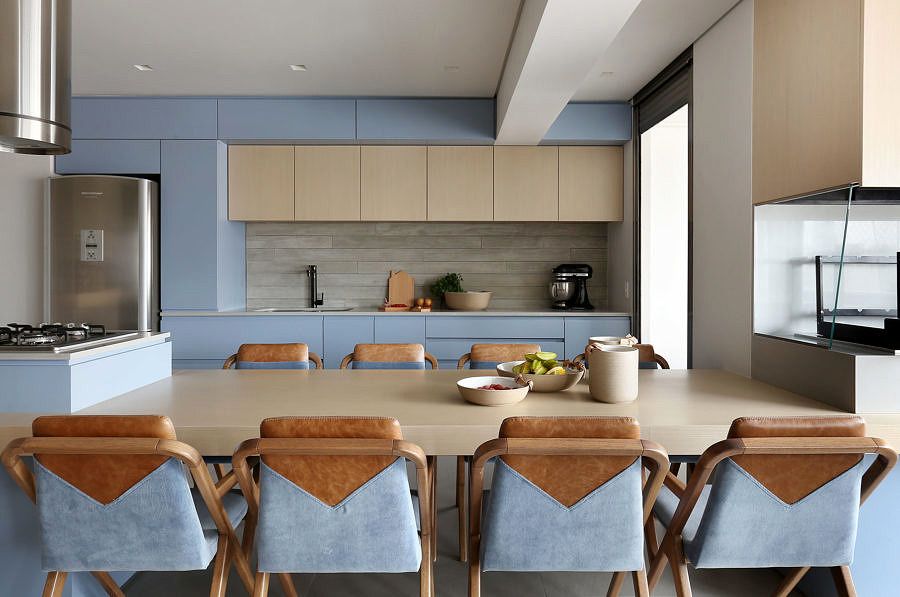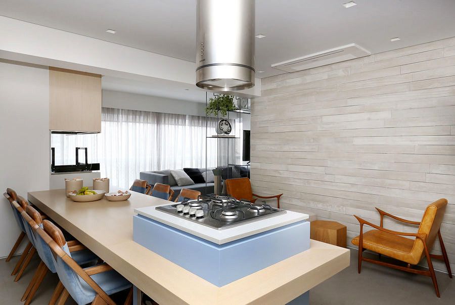 O maior destaque está na integração completa da varanda, sala e cozinha, deixando a cozinha em destaque logo na entrada do apartamento. Na ilha, onde estão o forno e o cooktop, sai a mesa de jantar que se estende, em uma peça única, até a churrasqueira.