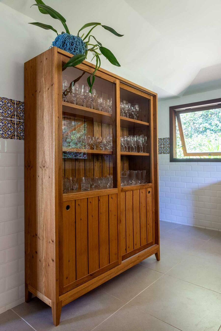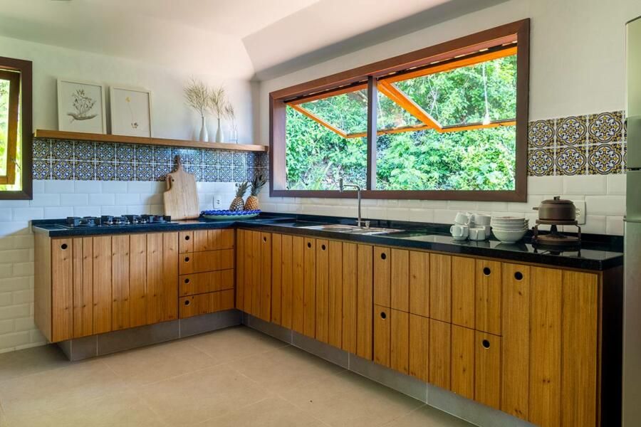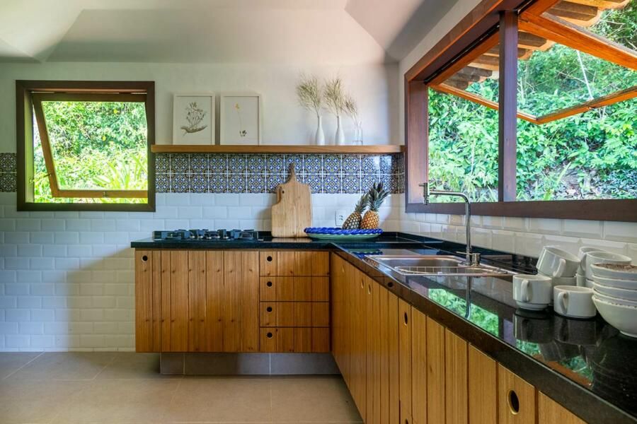 A presença de madeira, inclusive através das esquadrias cria o cenário ideal da arquitetura praiana e aconchegante de moradia. A mesma, se prolonga nos detalhes como forro e pisos da casa trazendo a rusticidade da floresta que ali se encontra.