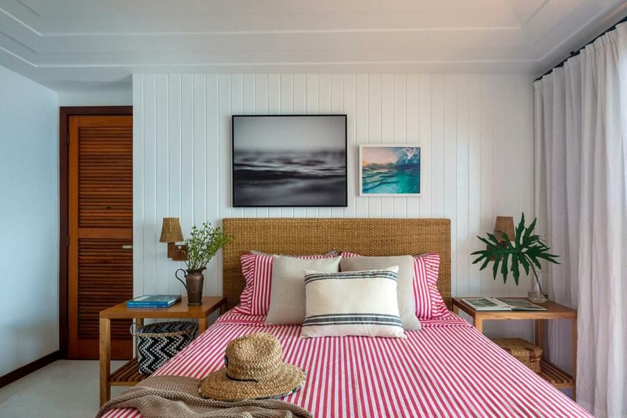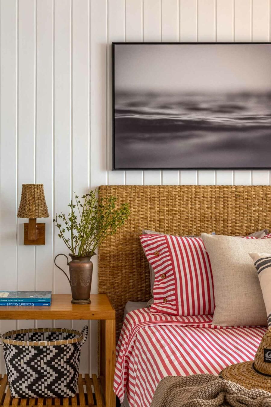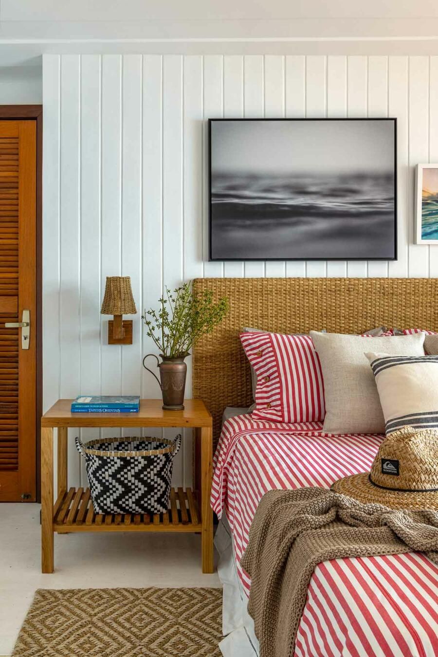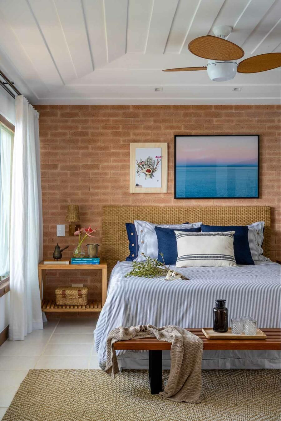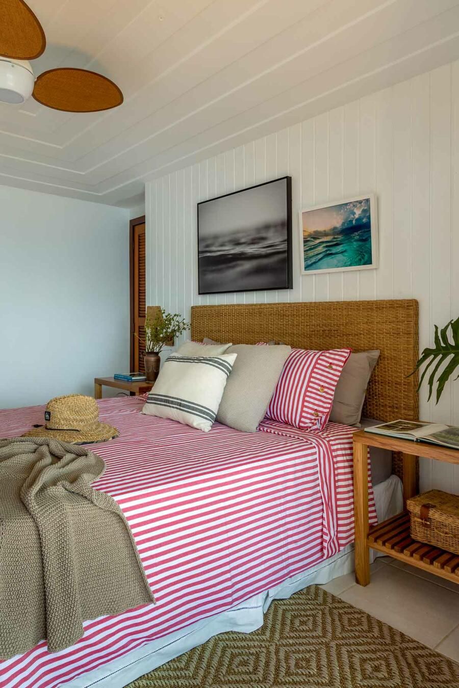 Os quartos compõem o estilo rústico praiano com tons claros e grandes janelas que permitem a circulação do ar e interação com a natureza.