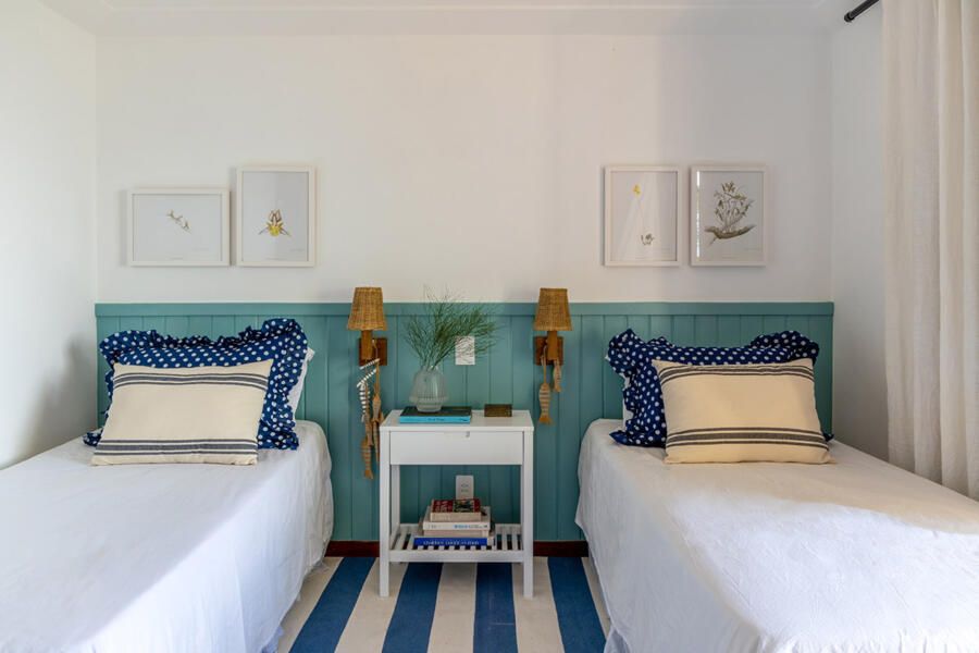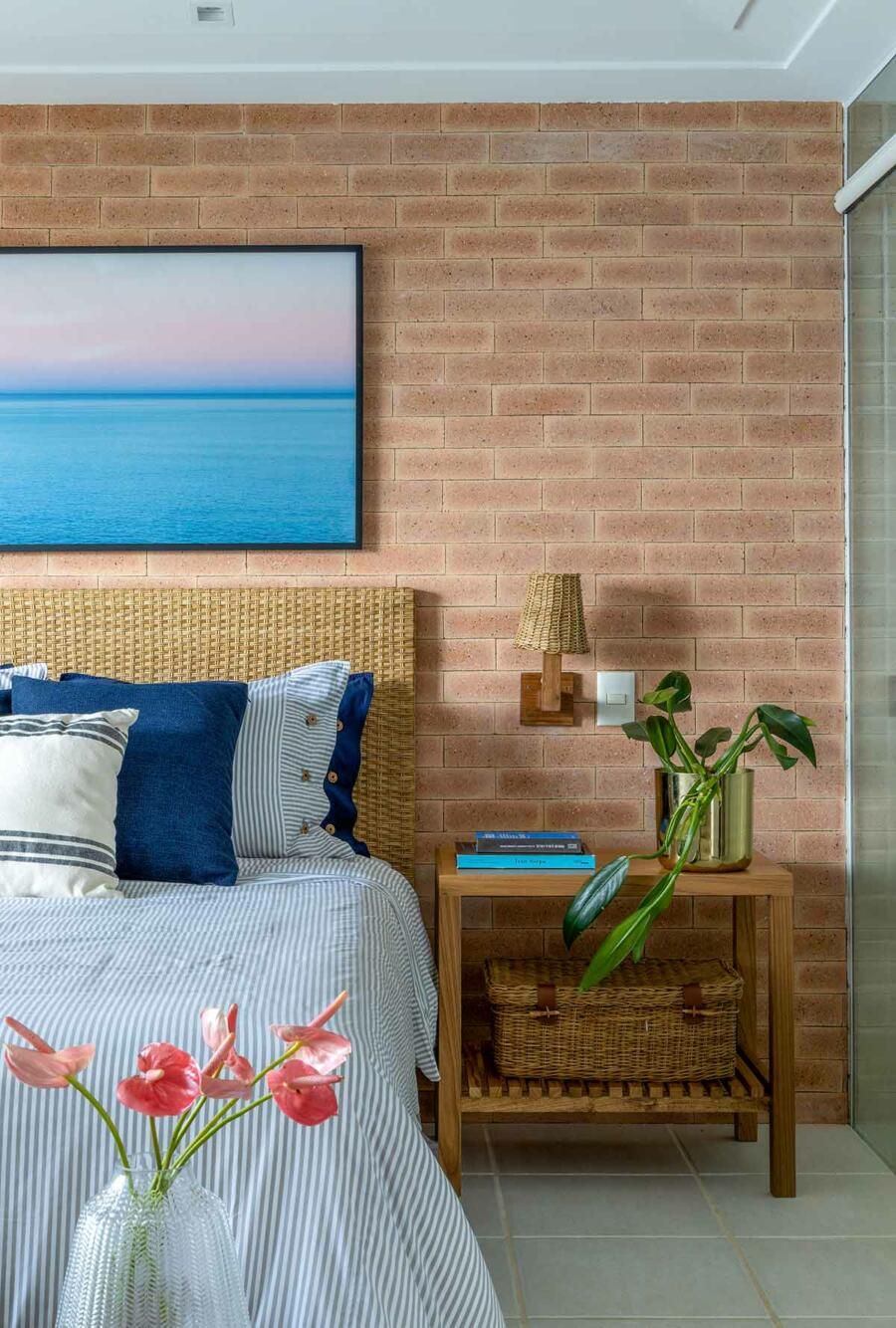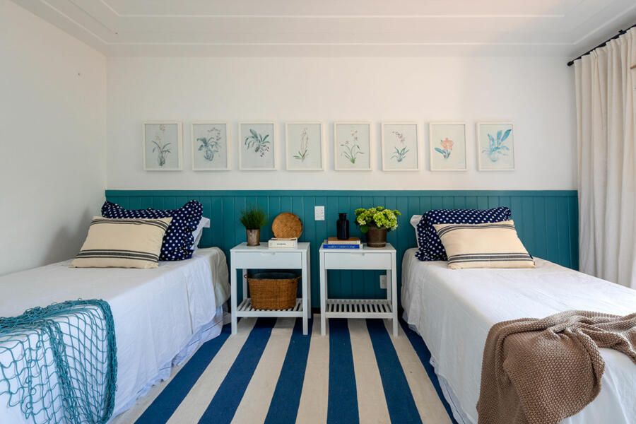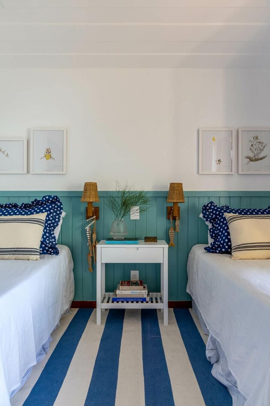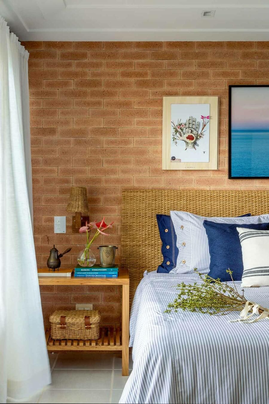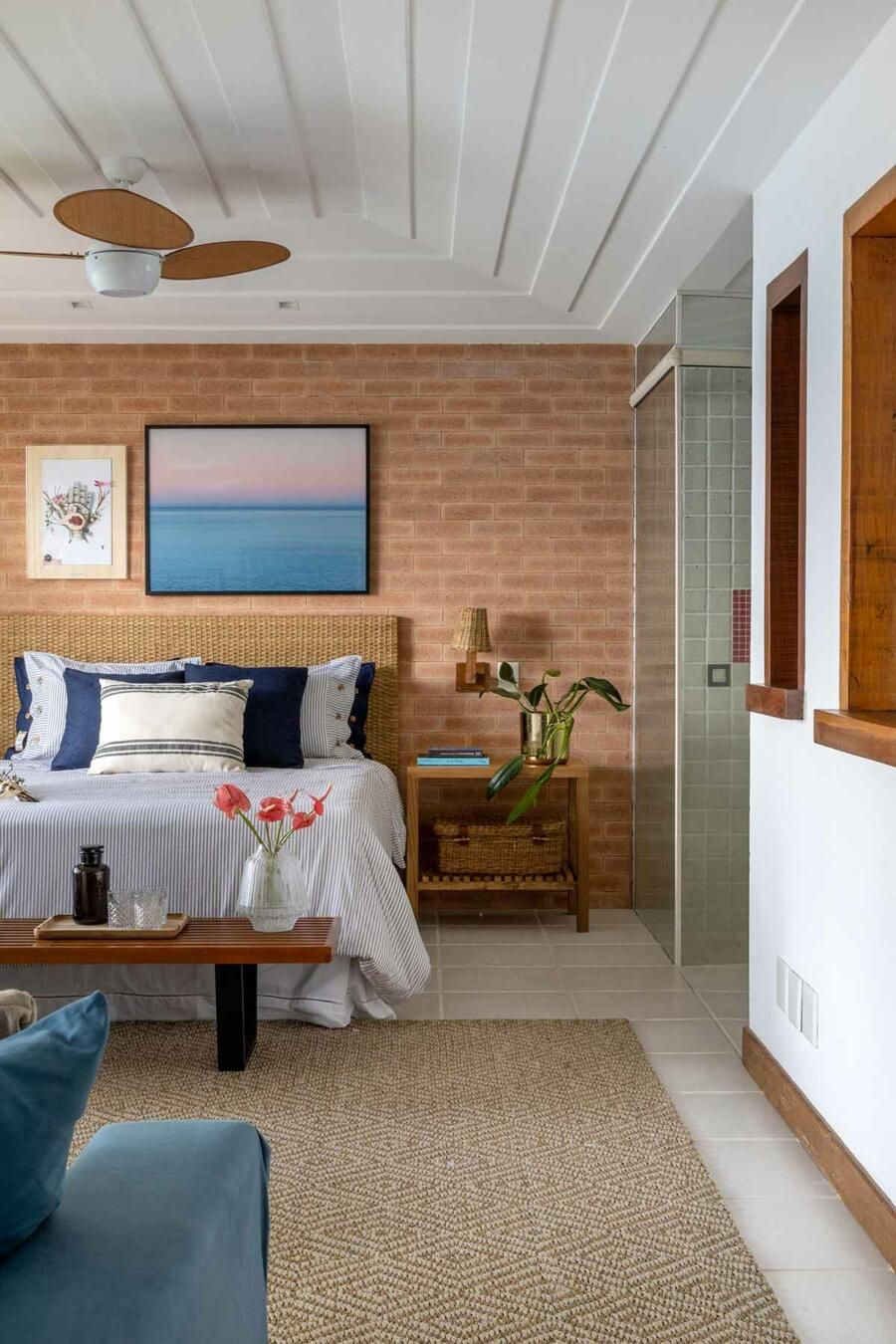 Os quartos compõem o estilo rústico praiano com tons claros e grandes janelas que permitem a circulação do ar e interação com a natureza.
