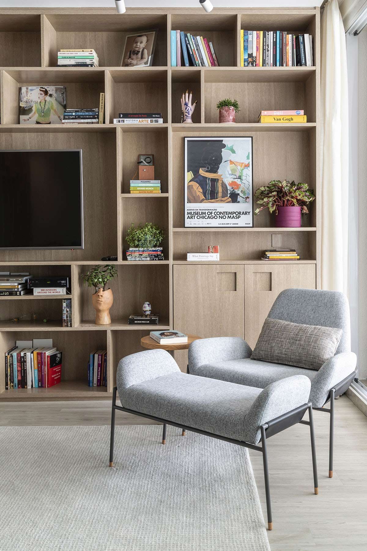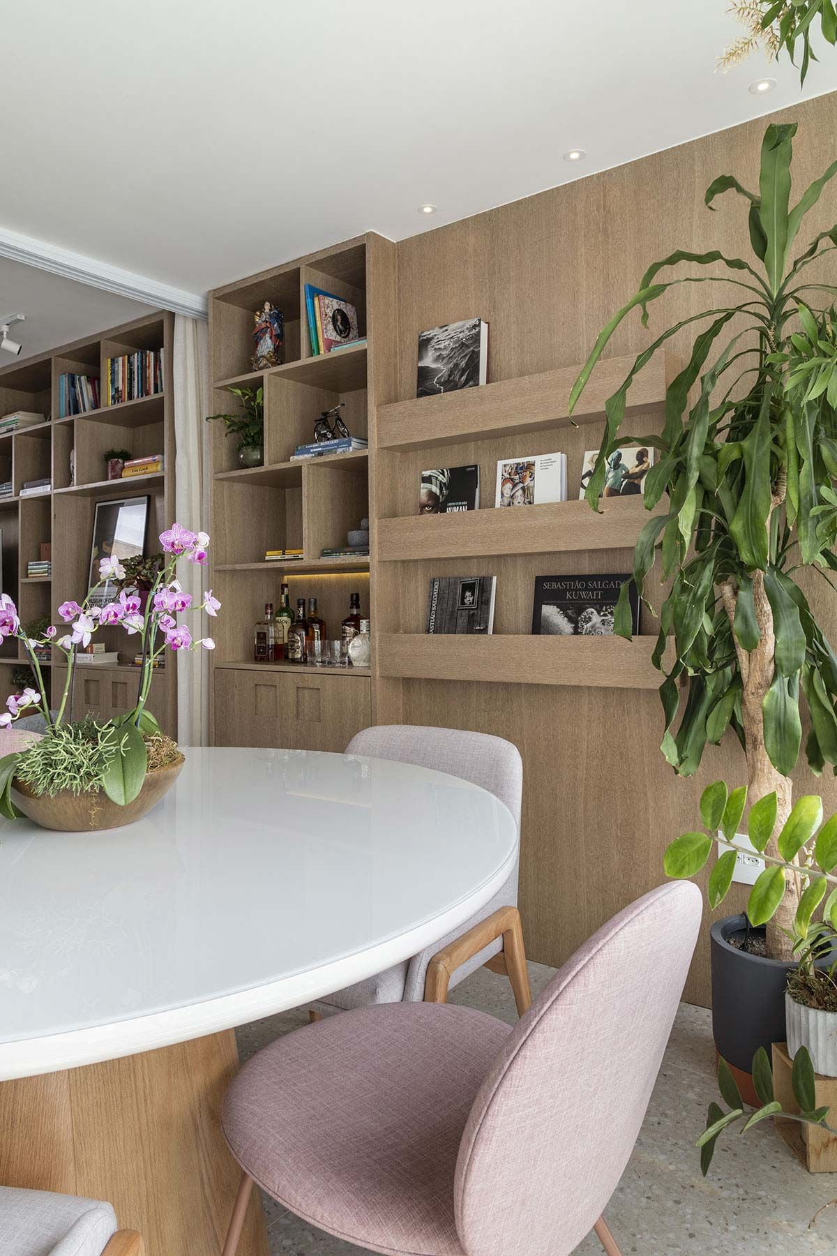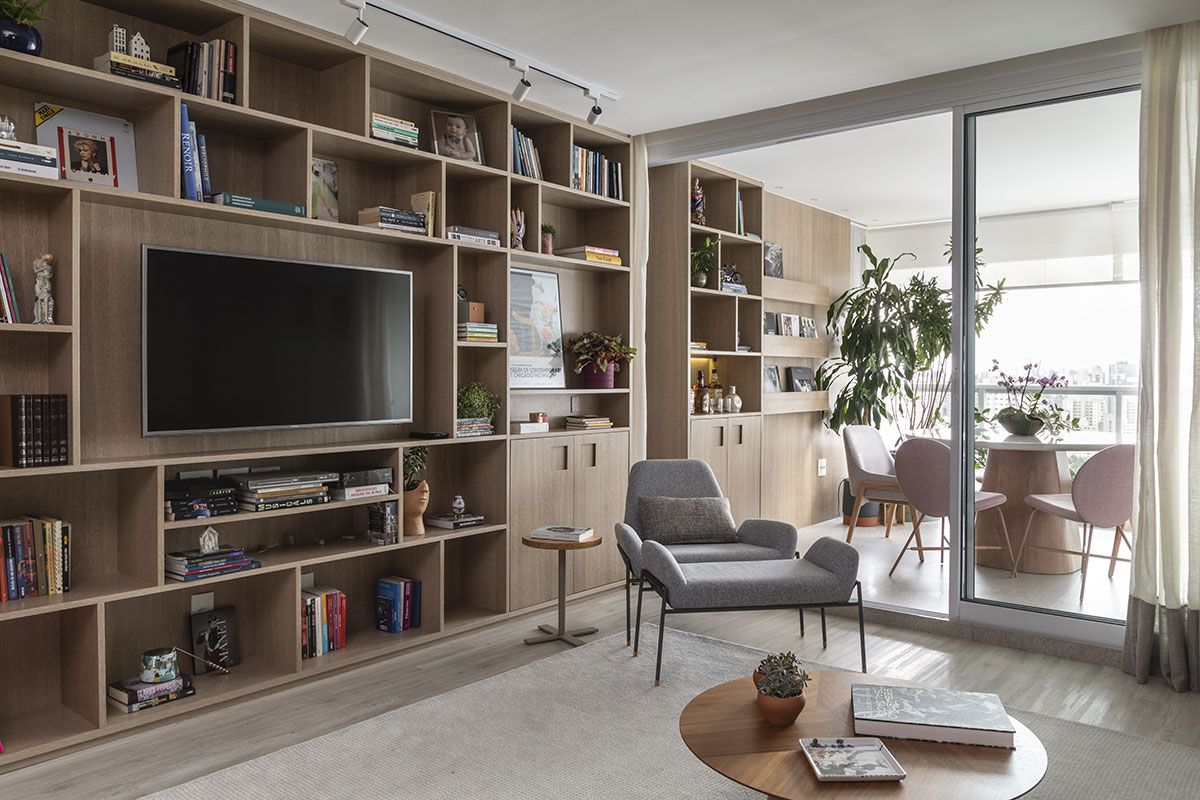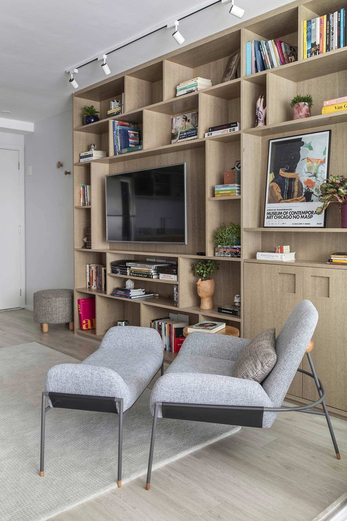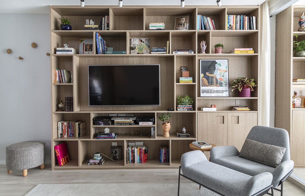 O móvel é um convite à leitura, já que foi feito todo em madeira natural, com iluminação indireta que proporciona aconchego e um clima intimista. Mesmo o terraço não sendo integrado com o estar, a estante por si só cria essa comunicação. Em espaços menores, a marcenaria planejada permite que pensemos nas necessidades e mínimos detalhes, tanto para acomodar todo o programa do cliente, quanto para imprimir estética e personalidade.