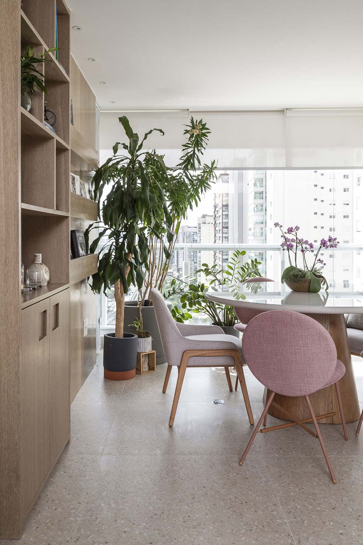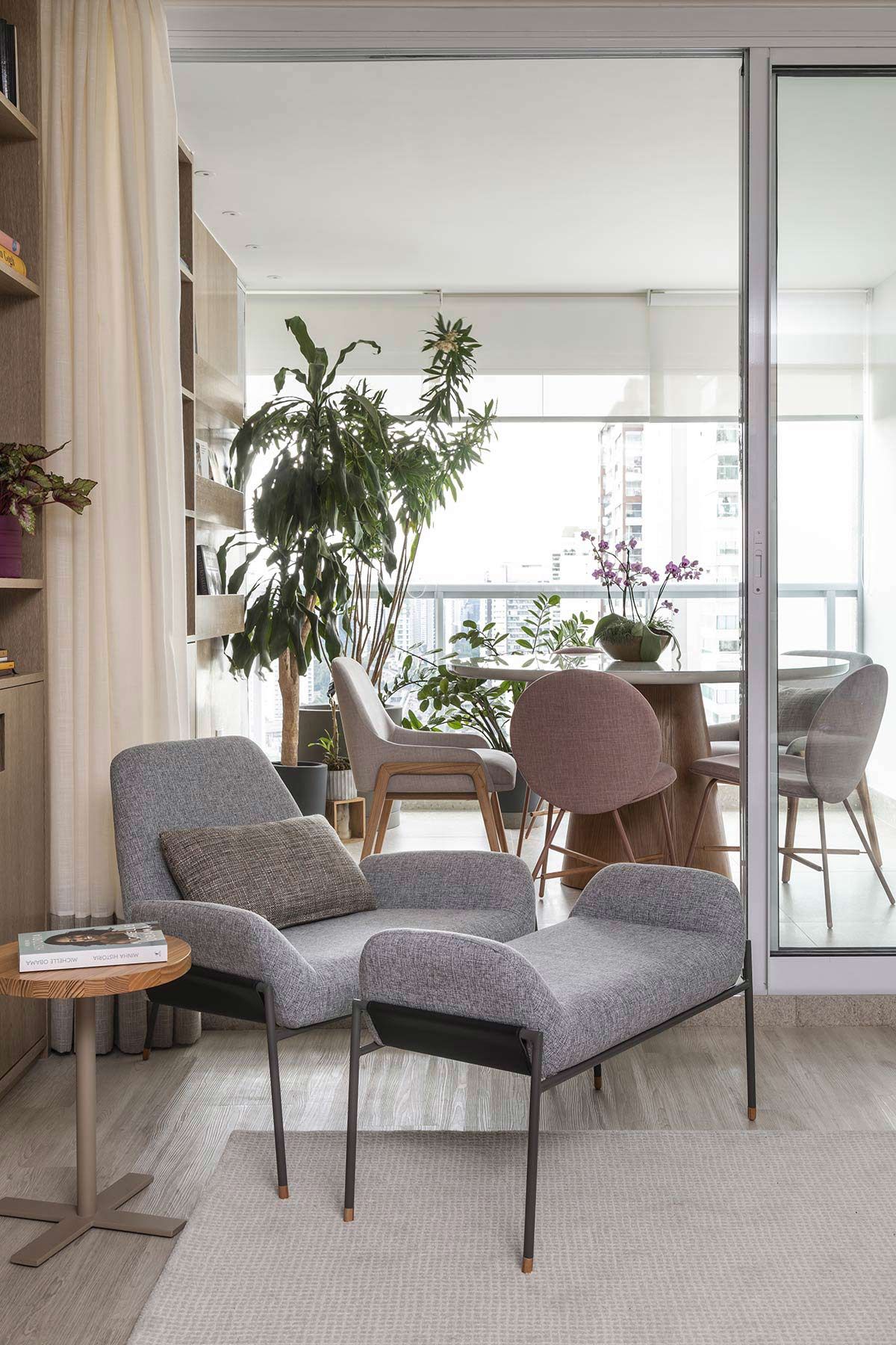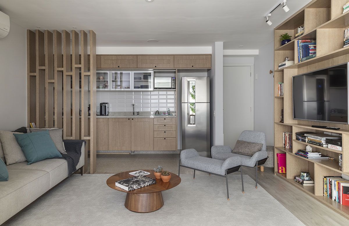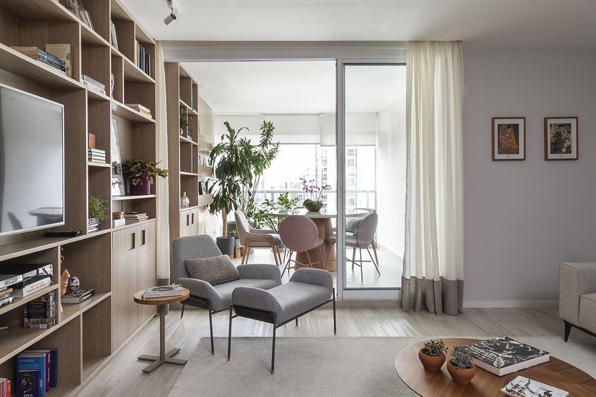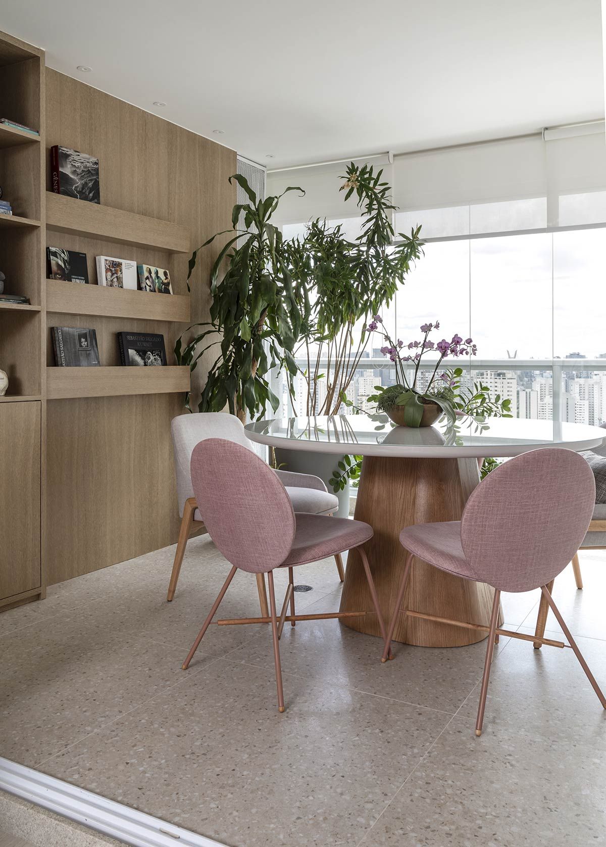 O móvel é um convite à leitura, já que foi feito todo em madeira natural, com iluminação indireta que proporciona aconchego e um clima intimista. Mesmo o terraço não sendo integrado com o estar, a estante por si só cria essa comunicação. Em espaços menores, a marcenaria planejada permite que pensemos nas necessidades e mínimos detalhes, tanto para acomodar todo o programa do cliente, quanto para imprimir estética e personalidade.