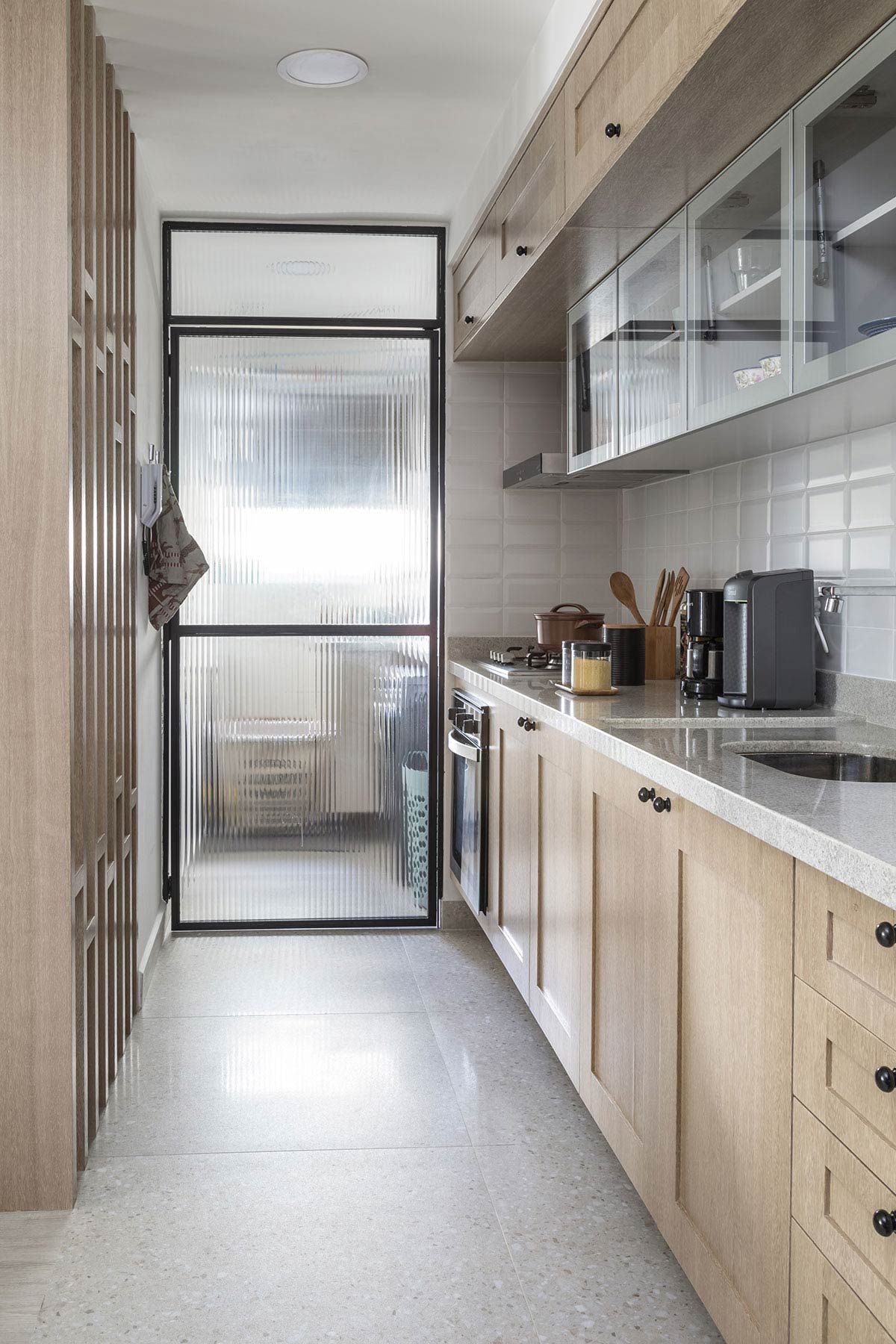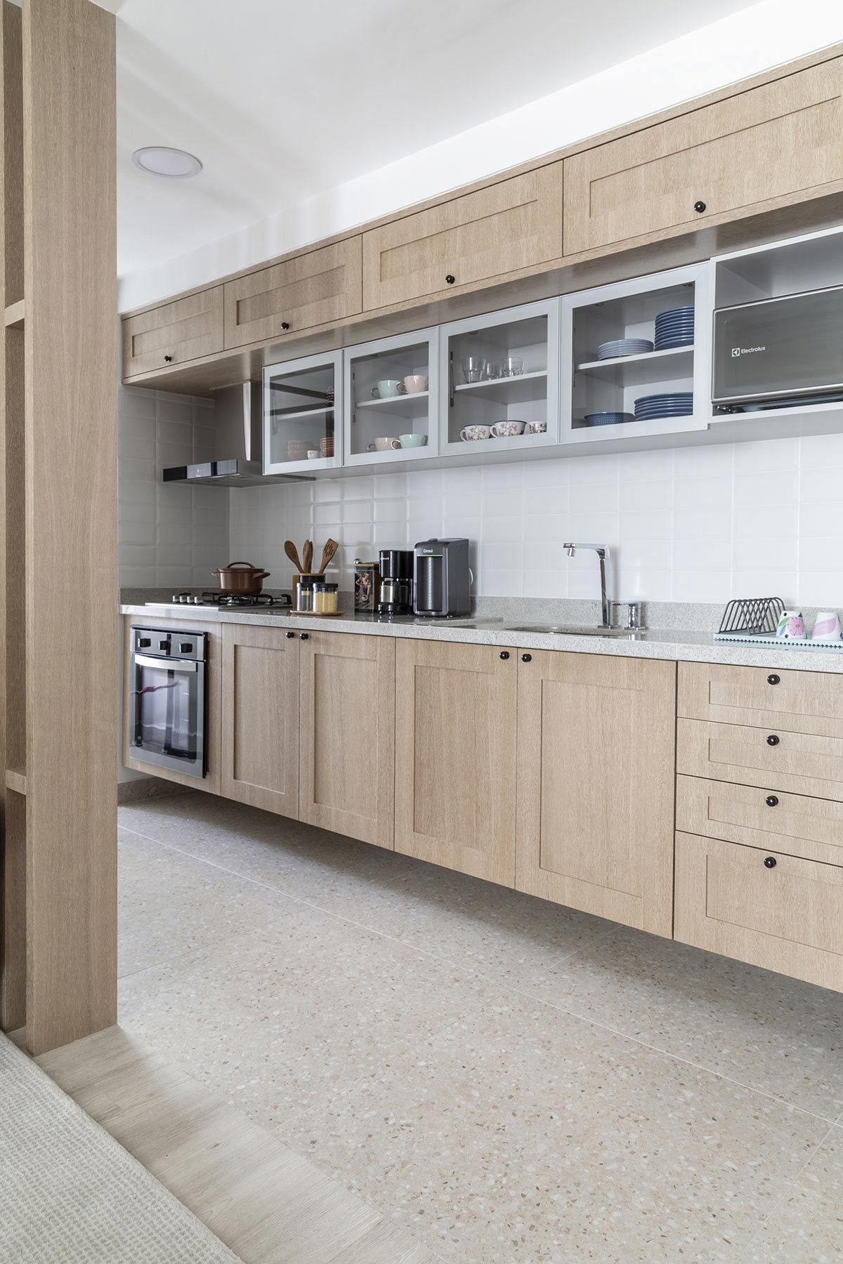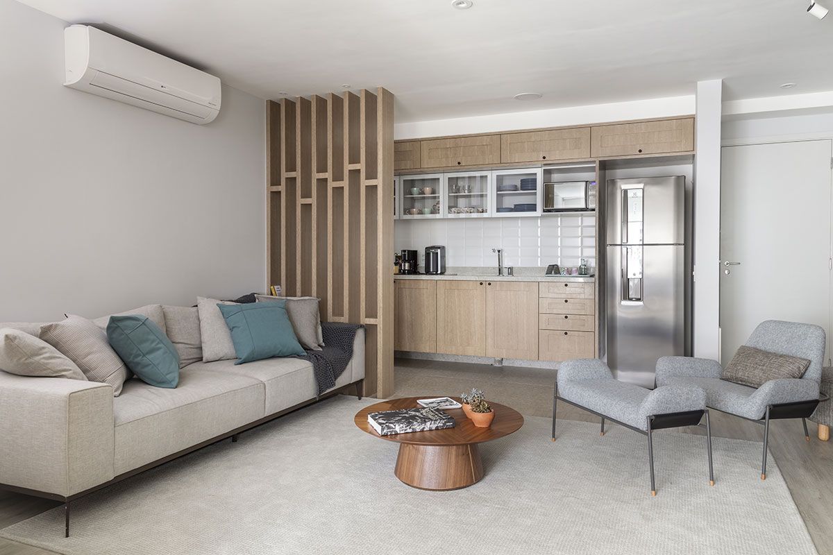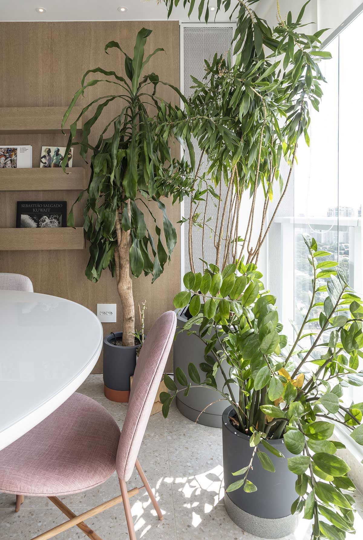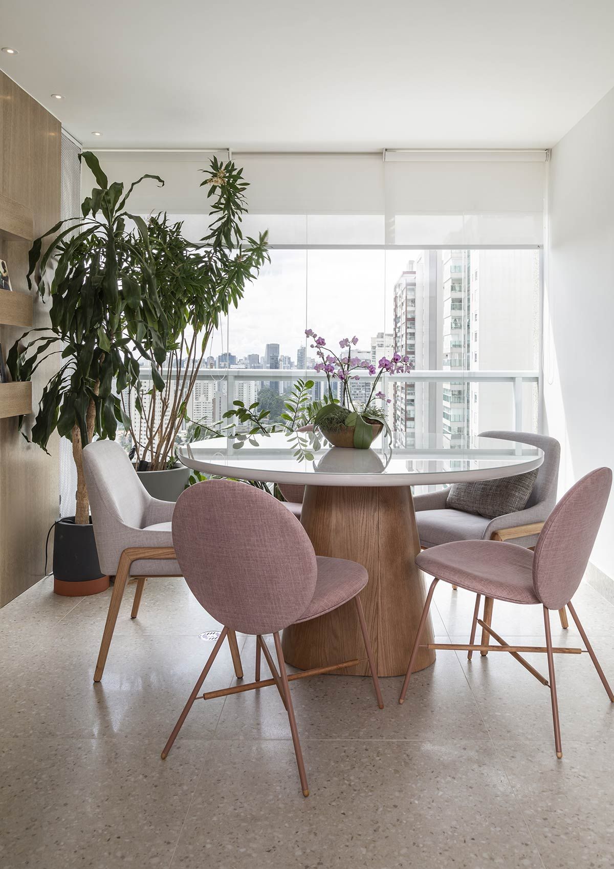 O móvel é um convite à leitura, já que foi feito todo em madeira natural, com iluminação indireta que proporciona aconchego e um clima intimista. Mesmo o terraço não sendo integrado com o estar, a estante por si só cria essa comunicação. Em espaços menores, a marcenaria planejada permite que pensemos nas necessidades e mínimos detalhes, tanto para acomodar todo o programa do cliente, quanto para imprimir estética e personalidade.